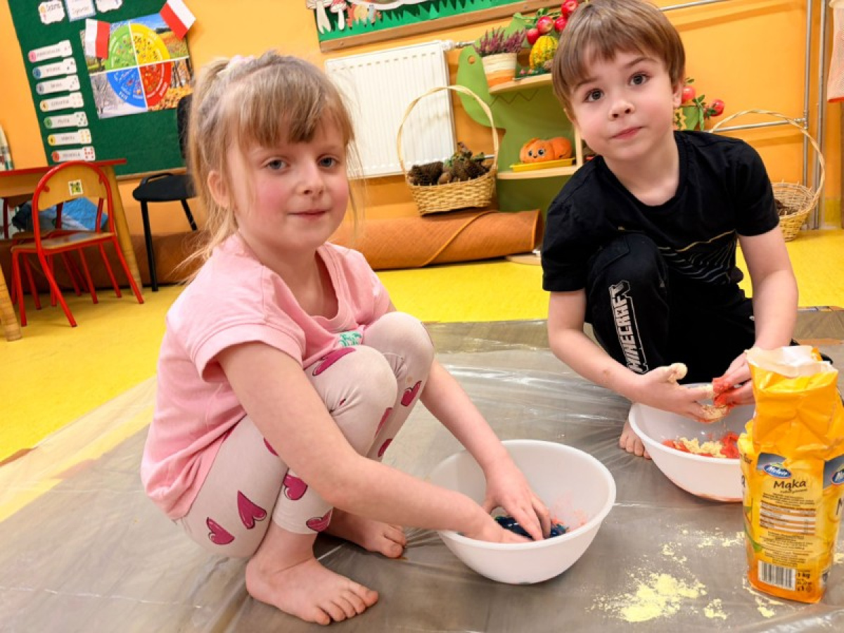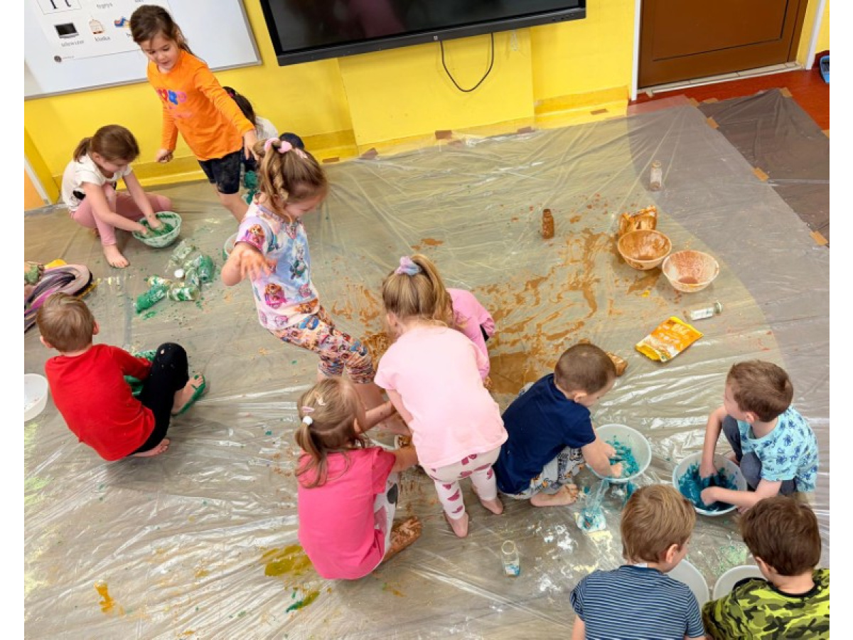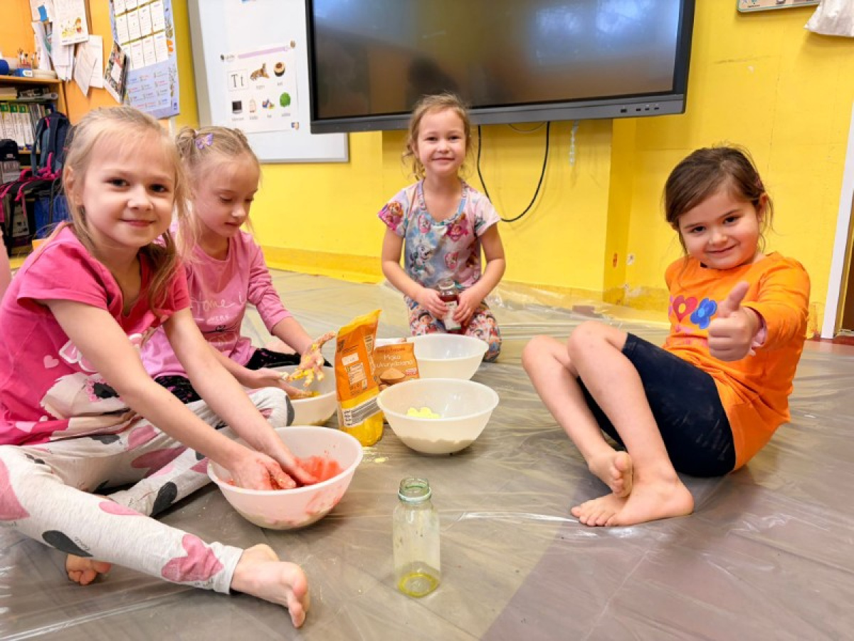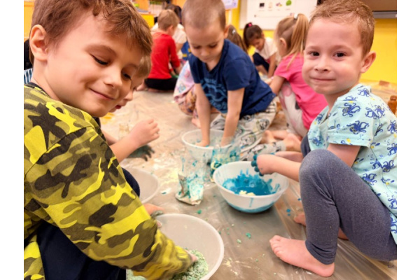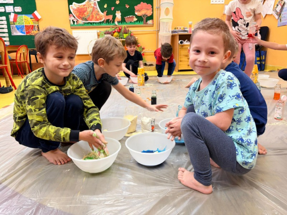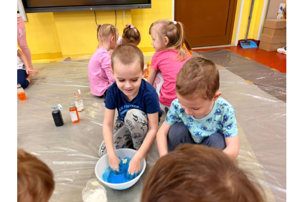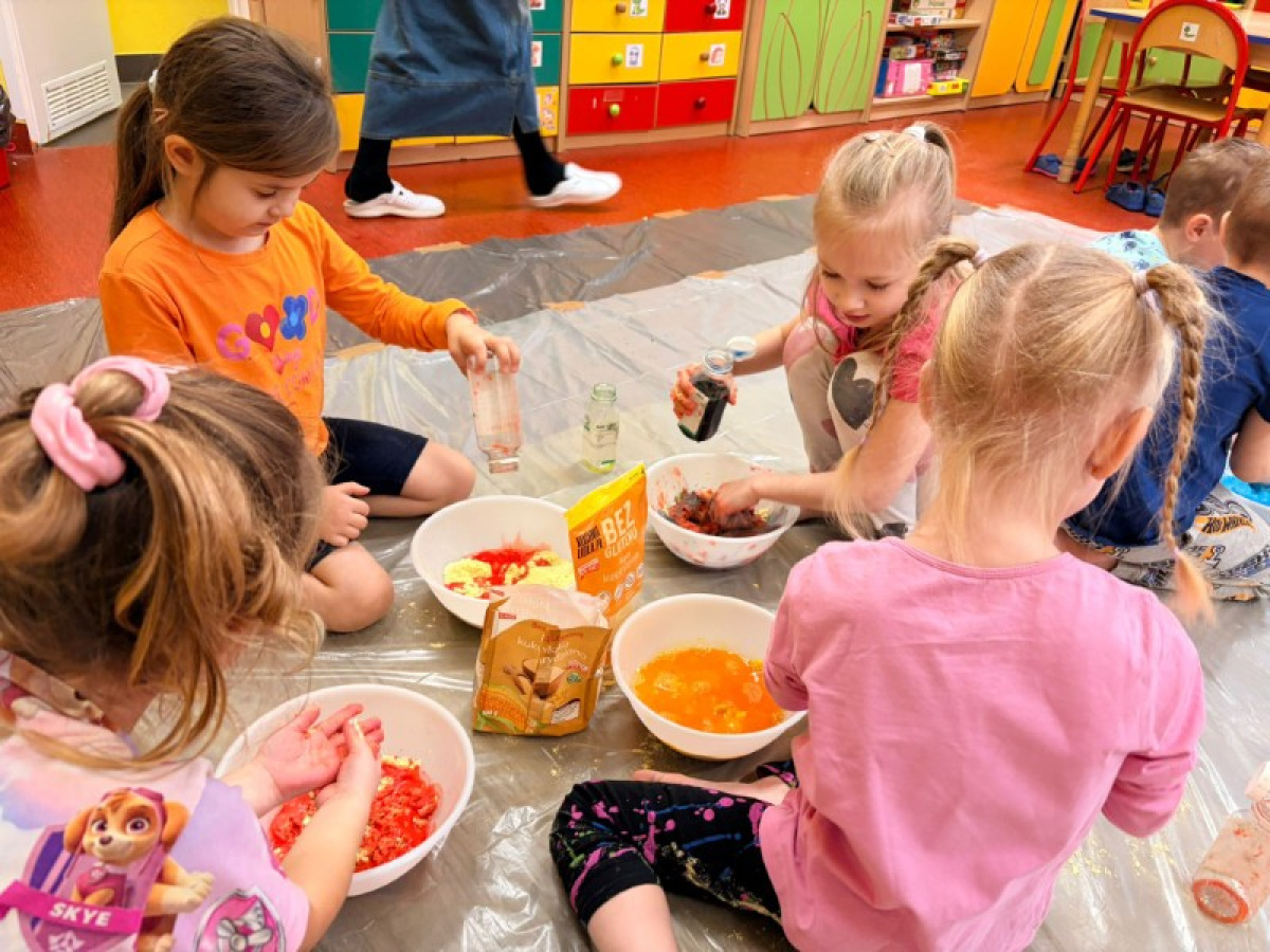 Kreciki tydzień rozpoczęły kolorowo. Przygotowane w zestaw ubrań na zmianę oraz dobry humor rozpoczęły swoje działania. Odmierzanie, mieszanie, zagniatanie to najlepsza forma usprawniania małych rączek. Zajęcia marki SENSOPLASTYKA to przede wszystkim praca w zgodnie z indywidualnym profilem sensorycznym dziecka. Dzięki temu, że każdy w grupie jest inny i ma wyjątkowe potrzeby powstało wiele mas, o różnej konsystencji. Był śnieg, był piasek kinetyczny, plastelina a nawet błotko. To własne jeden z tych dni, kiedy dzieci mogą swobodnie i według własnego pomysłu mieszać róże kolory i oceniać, czy powstał taki, na którym każdemu zależało.