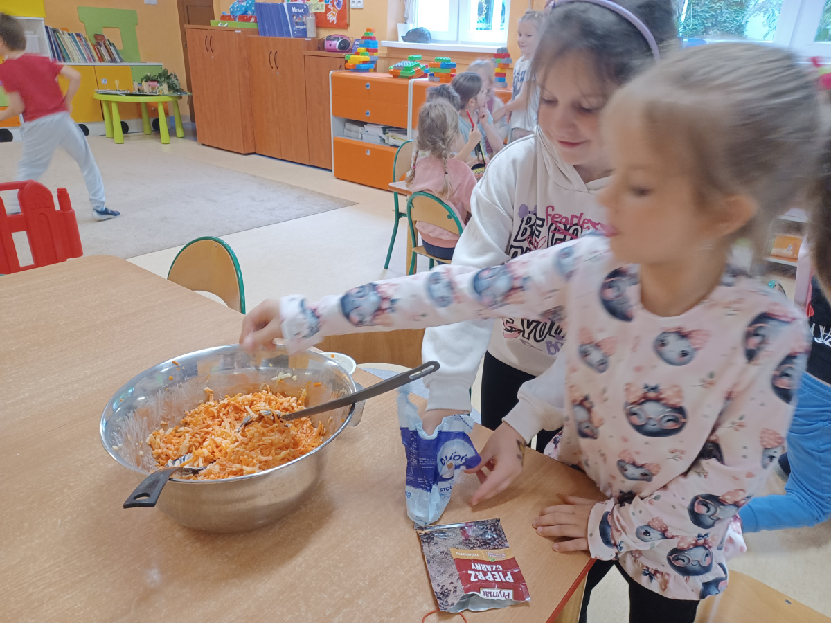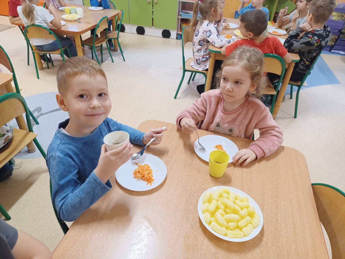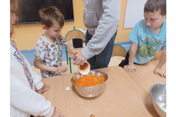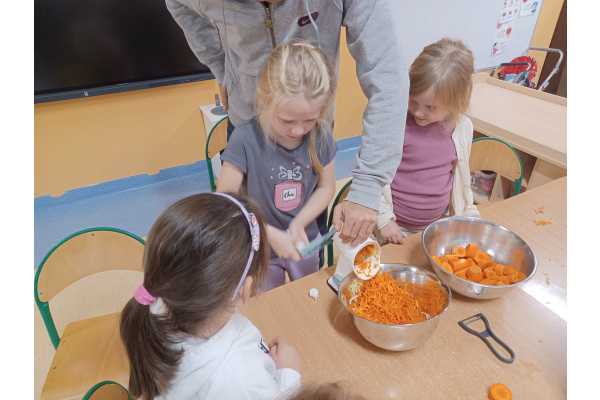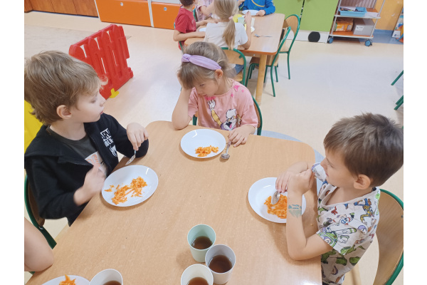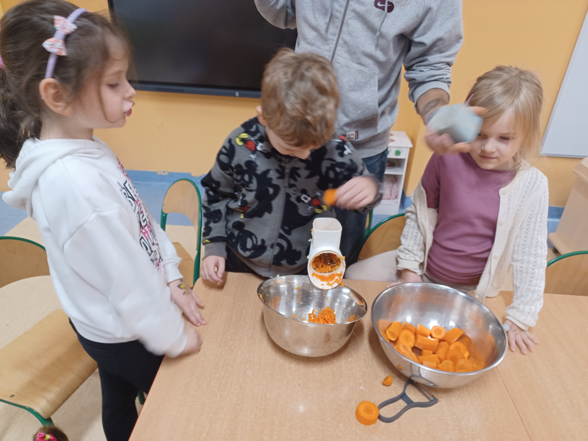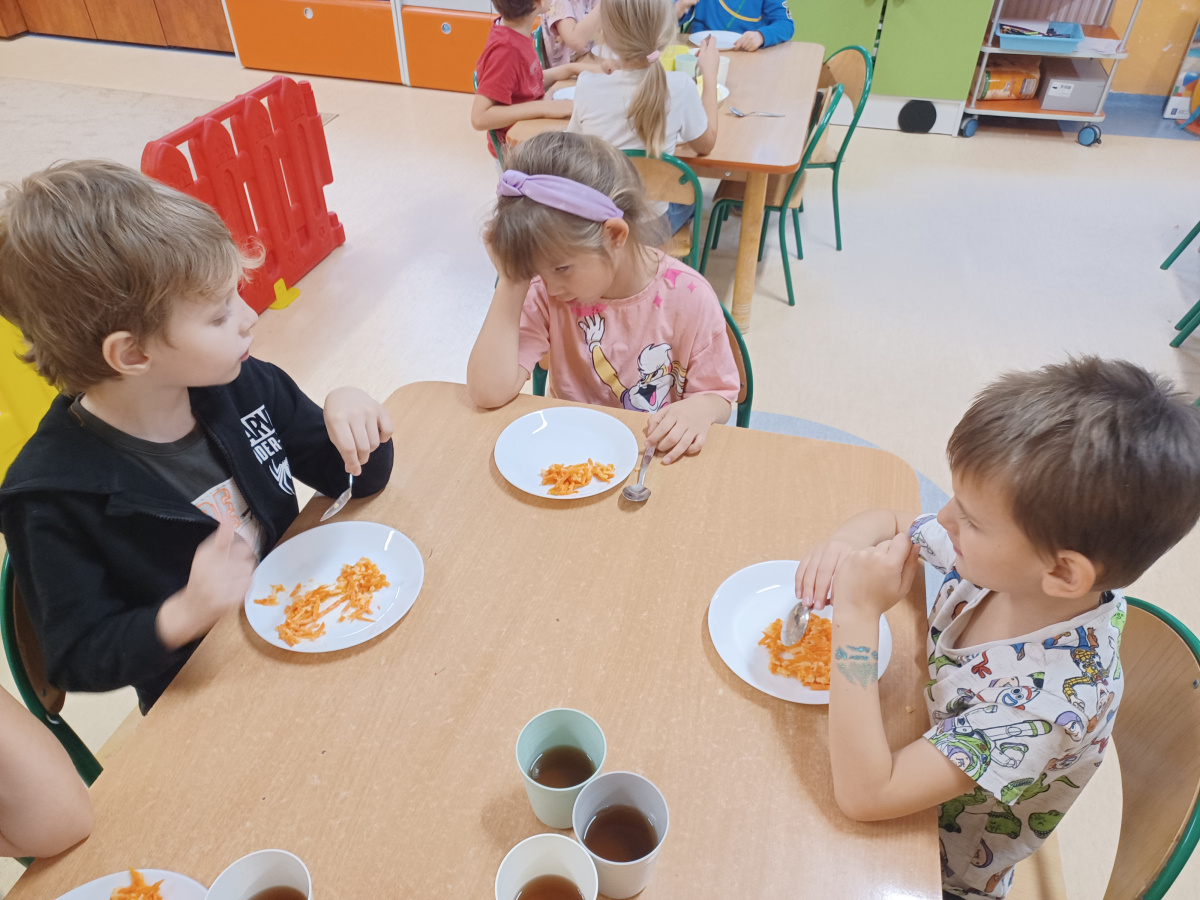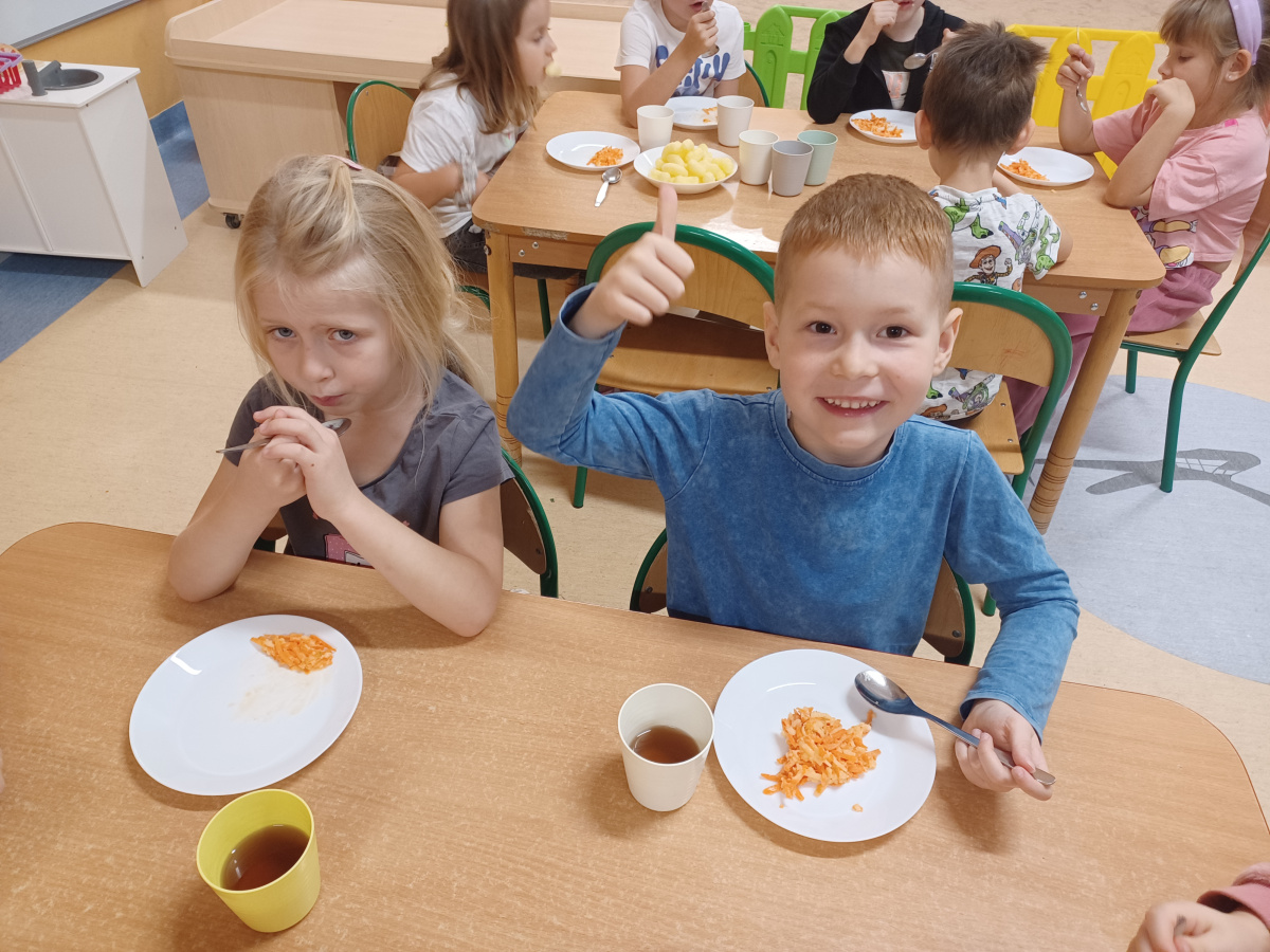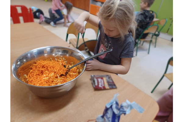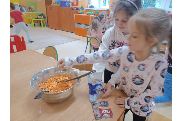 W naszej grupie rozpoczęliśmy innowację pedagogiczną pt. "Smacznie, zdrowo, kolorowo". Co miesiąc będziemy podejmować działania kulinarne, które mają na celu promowanie zdrowego odżywiania, będziemy poznawać walory i wartości odżywcze wybranych produktów. Tym razem była to marchewka i jabłko, z których zrobiliśmy zdrową, kolorową i przepyszną surówkę.