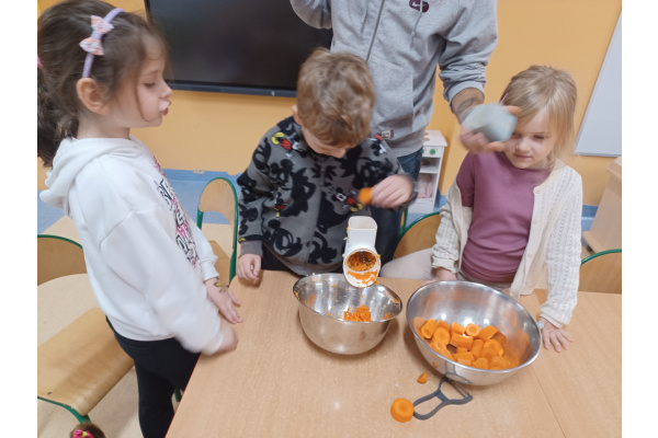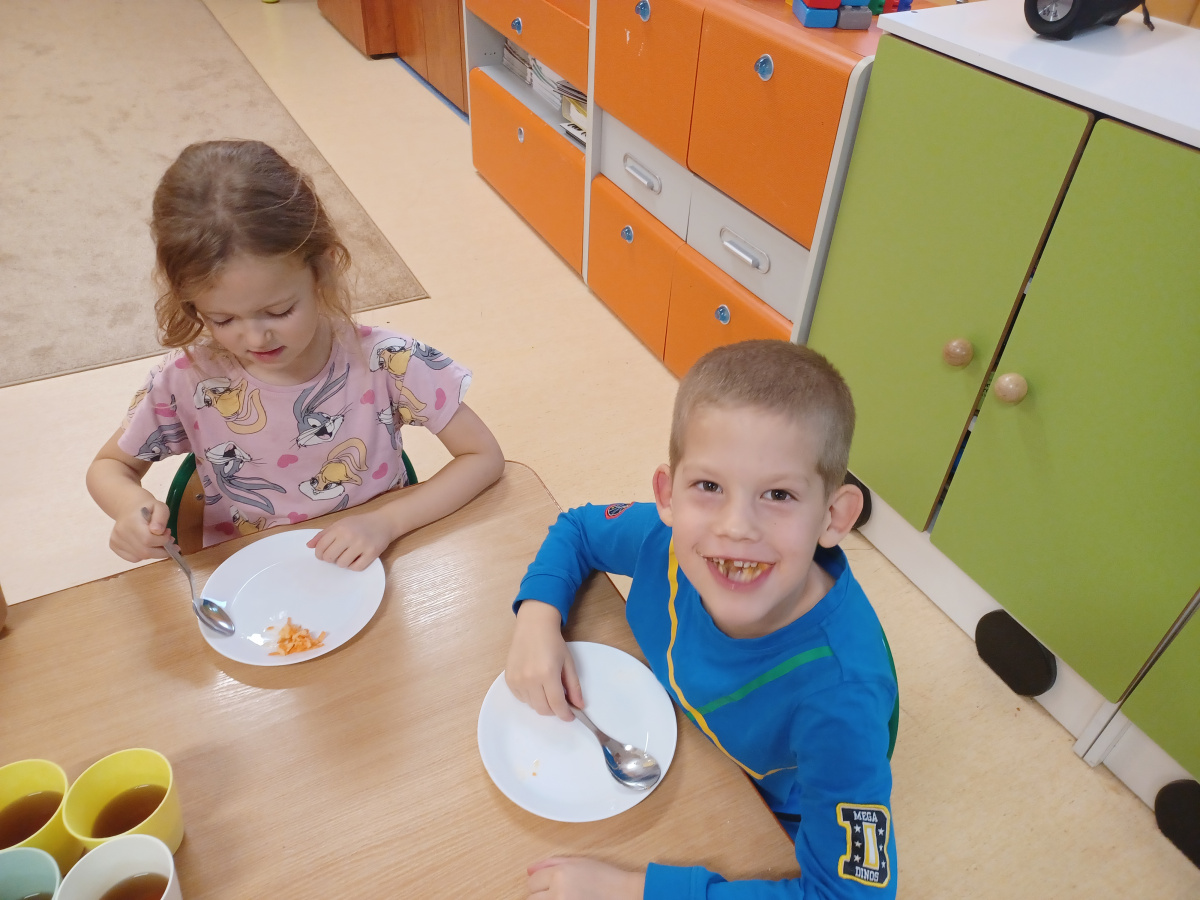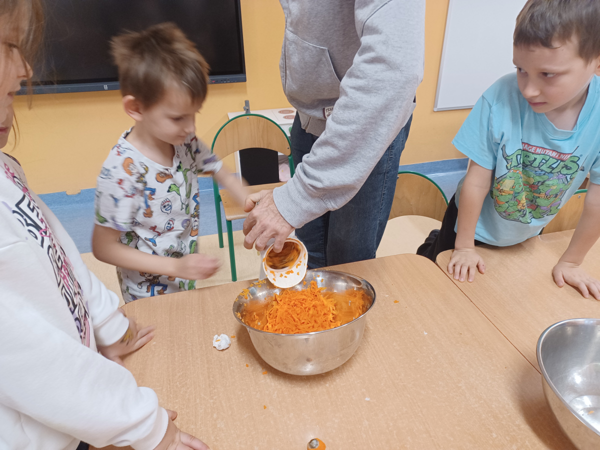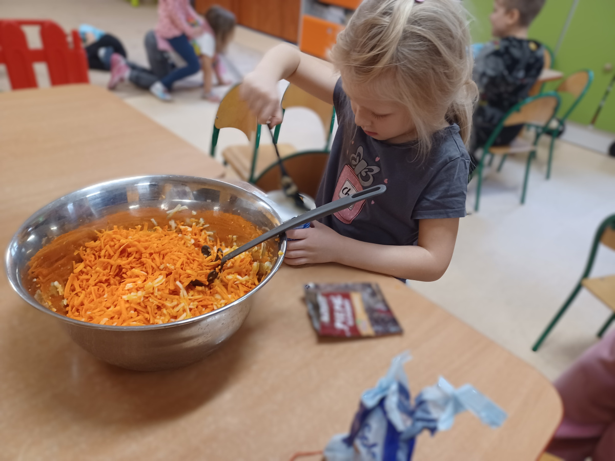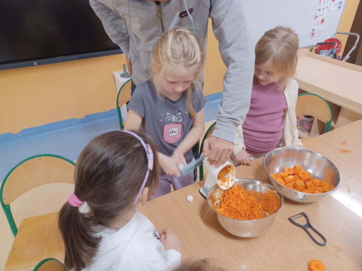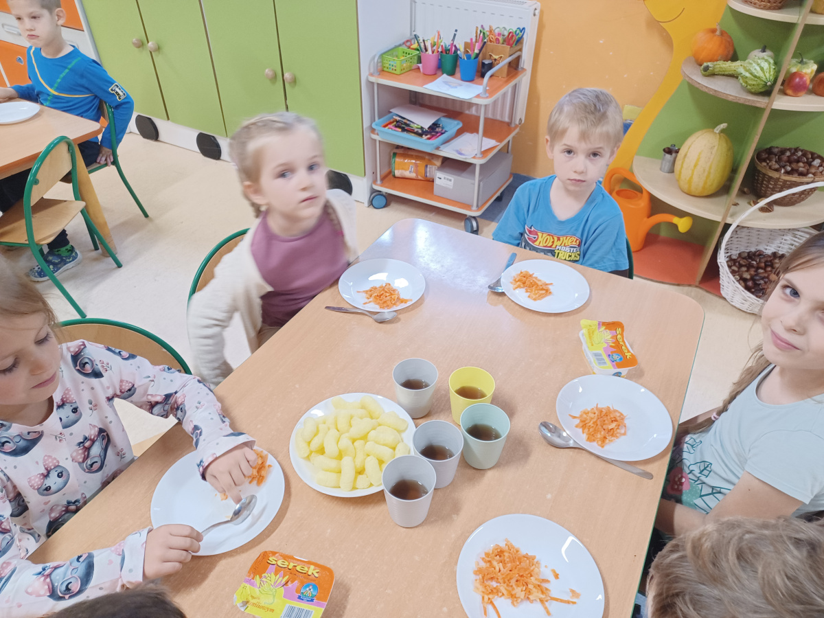 W naszej grupie rozpoczęliśmy innowację pedagogiczną pt. "Smacznie, zdrowo, kolorowo". Co miesiąc będziemy podejmować działania kulinarne, które mają na celu promowanie zdrowego odżywiania, będziemy poznawać walory i wartości odżywcze wybranych produktów. Tym razem była to marchewka i jabłko, z których zrobiliśmy zdrową, kolorową i przepyszną surówkę.