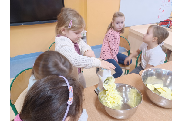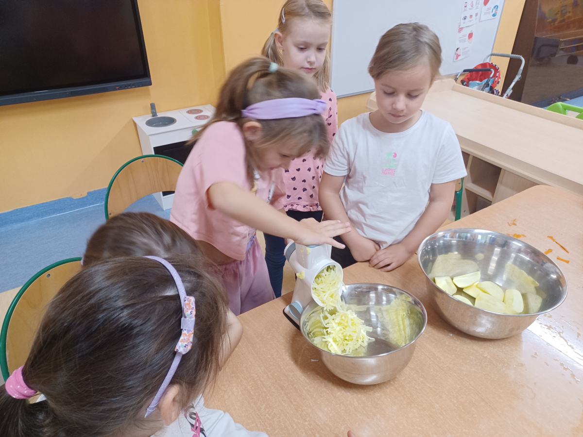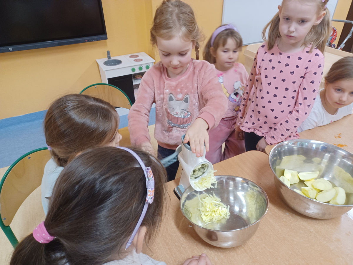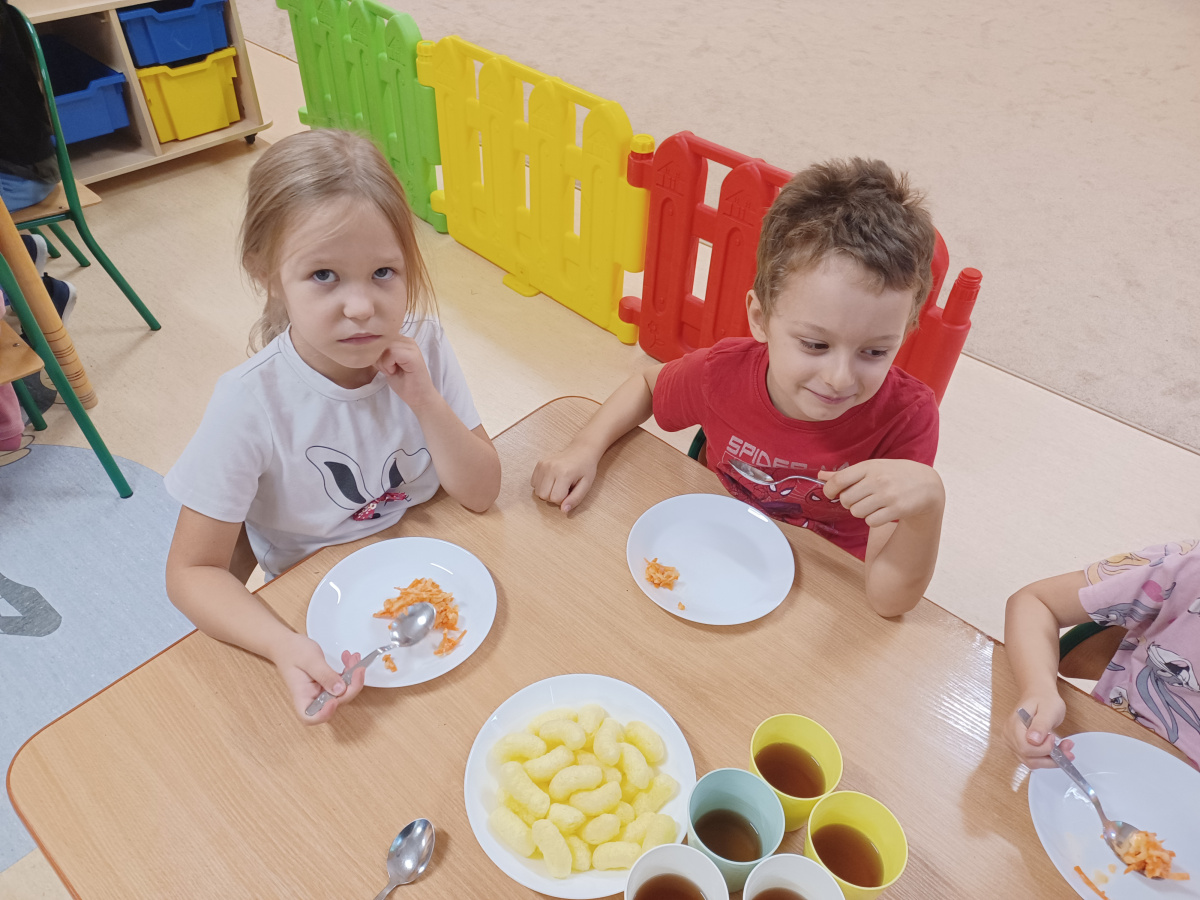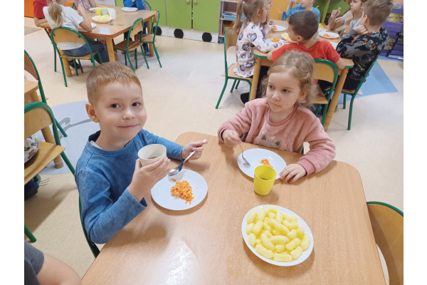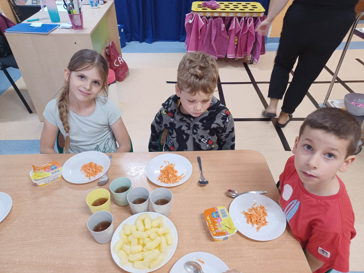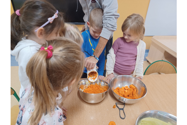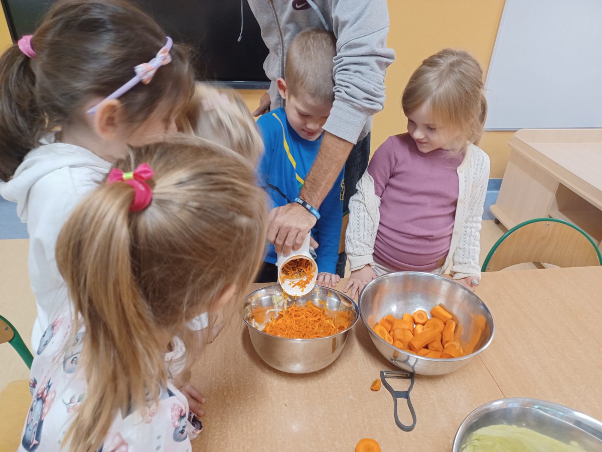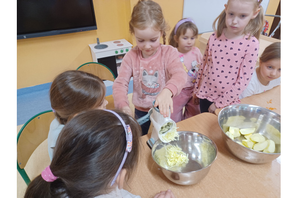 W naszej grupie rozpoczęliśmy innowację pedagogiczną pt. "Smacznie, zdrowo, kolorowo". Co miesiąc będziemy podejmować działania kulinarne, które mają na celu promowanie zdrowego odżywiania, będziemy poznawać walory i wartości odżywcze wybranych produktów. Tym razem była to marchewka i jabłko, z których zrobiliśmy zdrową, kolorową i przepyszną surówkę.