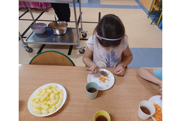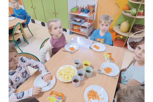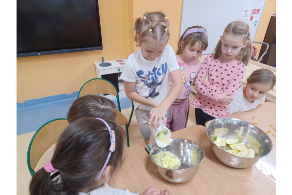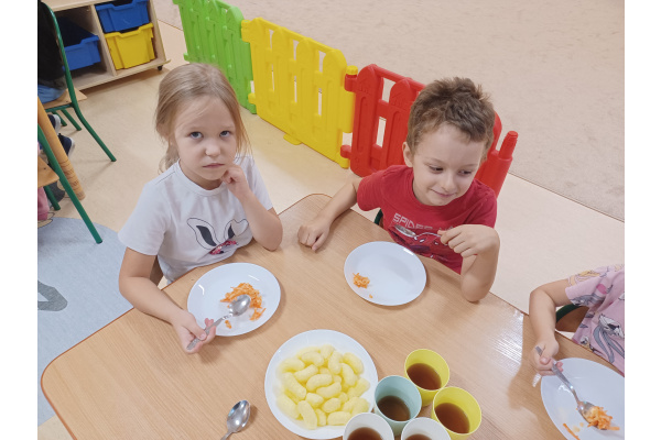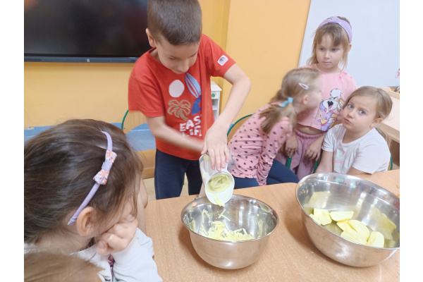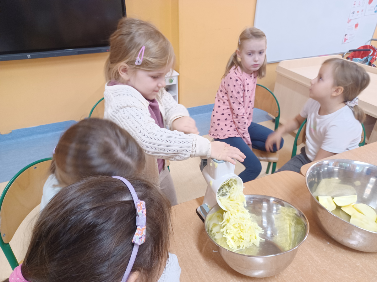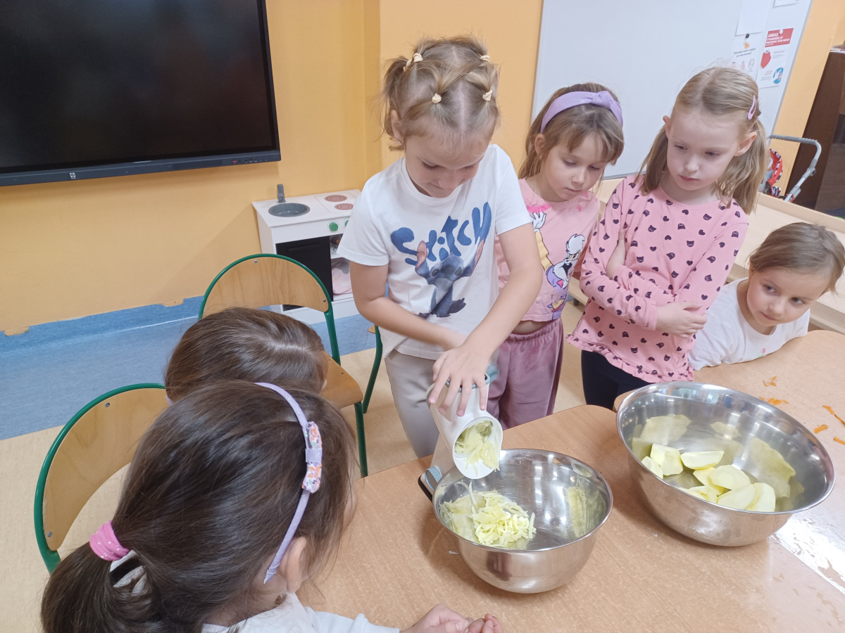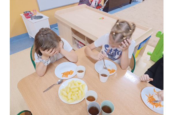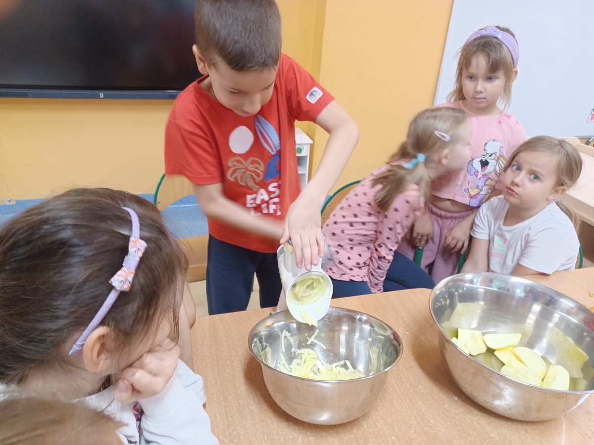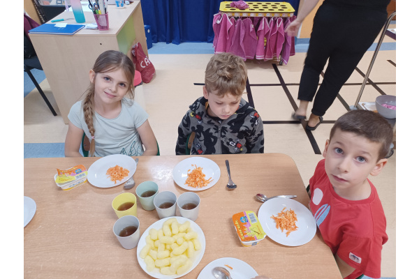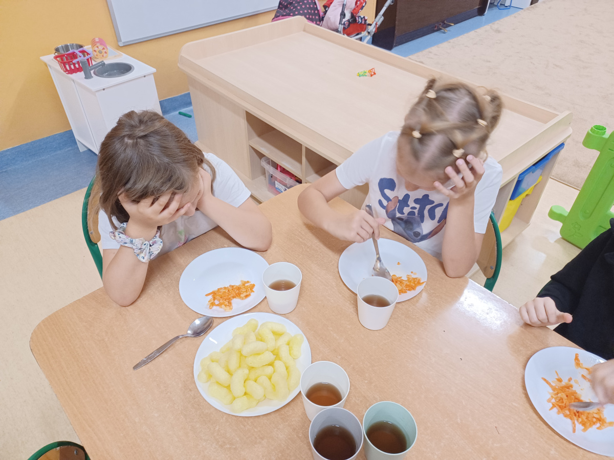 W naszej grupie rozpoczęliśmy innowację pedagogiczną pt. "Smacznie, zdrowo, kolorowo". Co miesiąc będziemy podejmować działania kulinarne, które mają na celu promowanie zdrowego odżywiania, będziemy poznawać walory i wartości odżywcze wybranych produktów. Tym razem była to marchewka i jabłko, z których zrobiliśmy zdrową, kolorową i przepyszną surówkę.