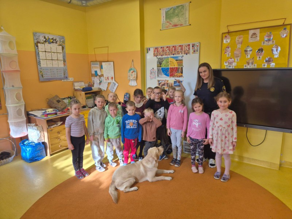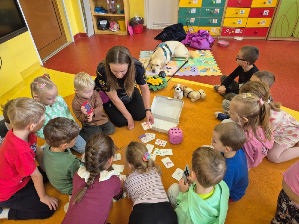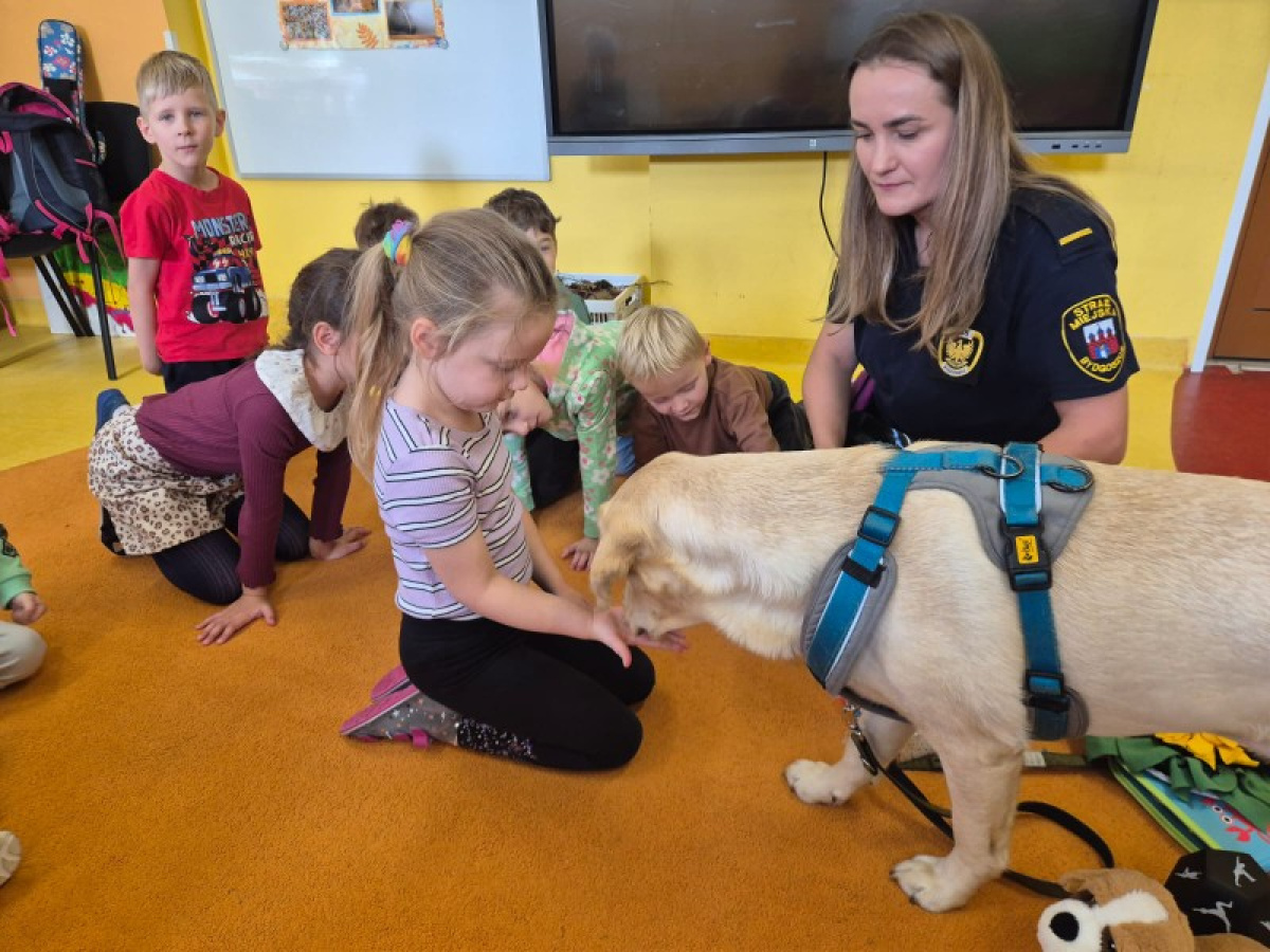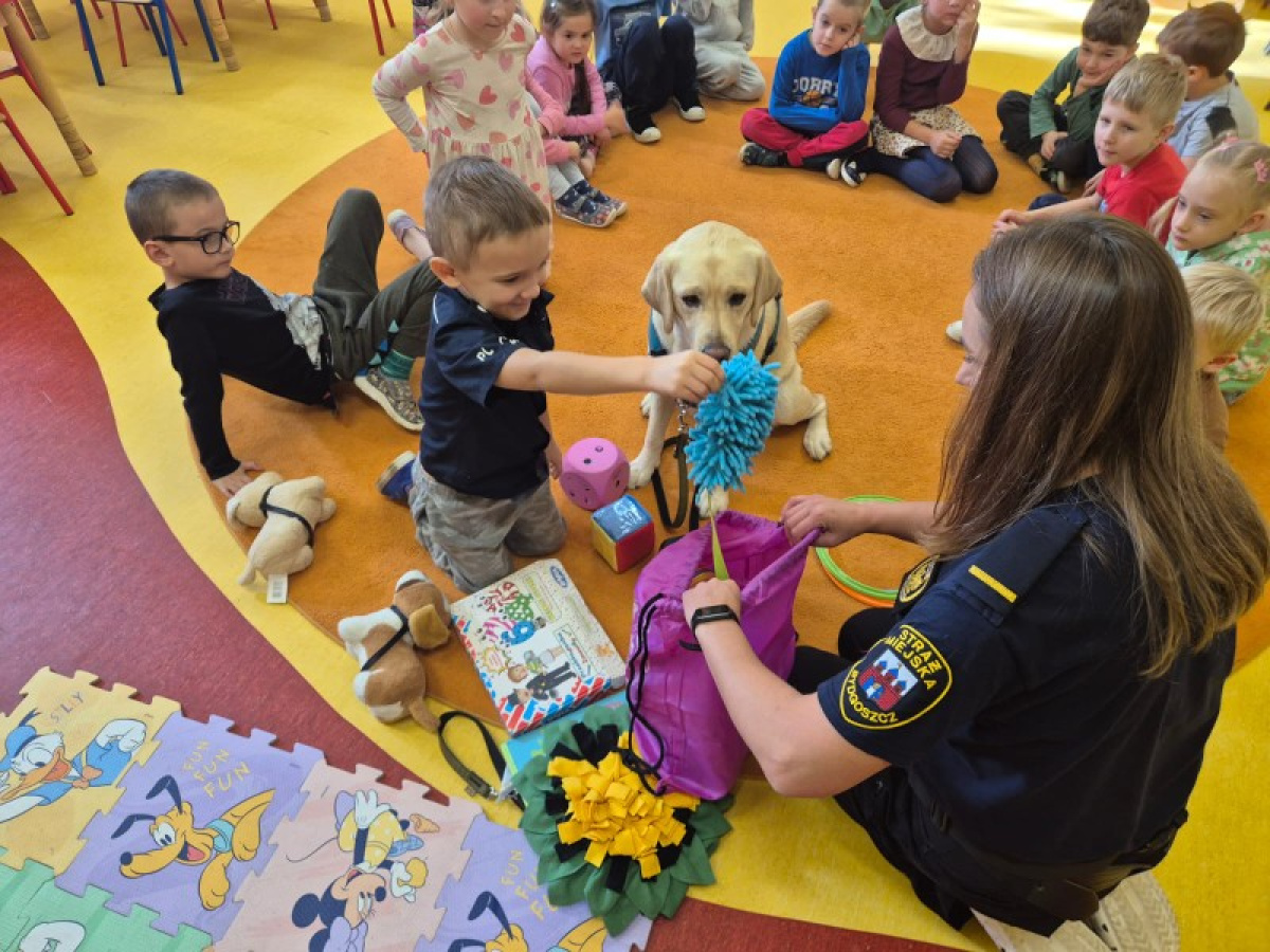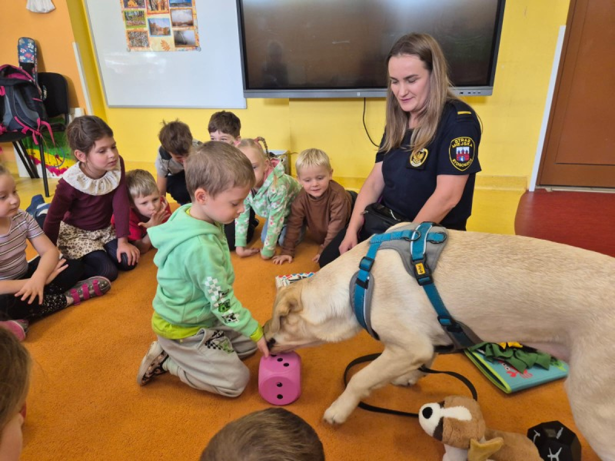 W piątek 15 października grupa Krecików gościła w swoich progach Strażniczkę Miejską Panią Żanetę Pankowską z pieskiem terapeutycznym Labi. Kreciki miały okazję poznać zasady bezpiecznego kontaktu z psem. Dowiedzieliśmy się również jak reagować, w razie ataku nieznanego zwierzęcia i wykonaliśmy wiele ciekawych ćwiczeń i zadań w towarzystwie Labi. W podziękowaniu za wspólne aktywności każdy miał okazję wręczyć Labi przyszne smaczki.