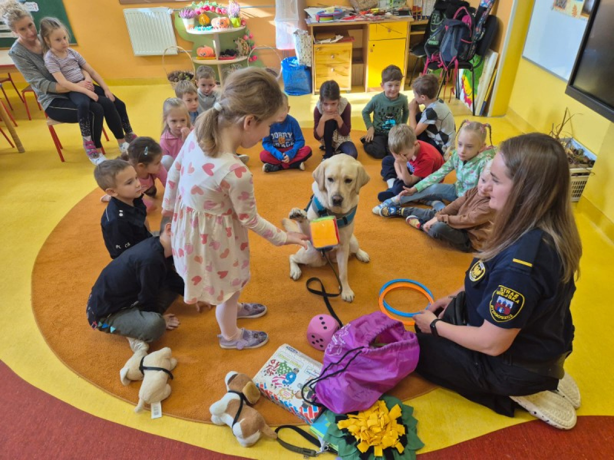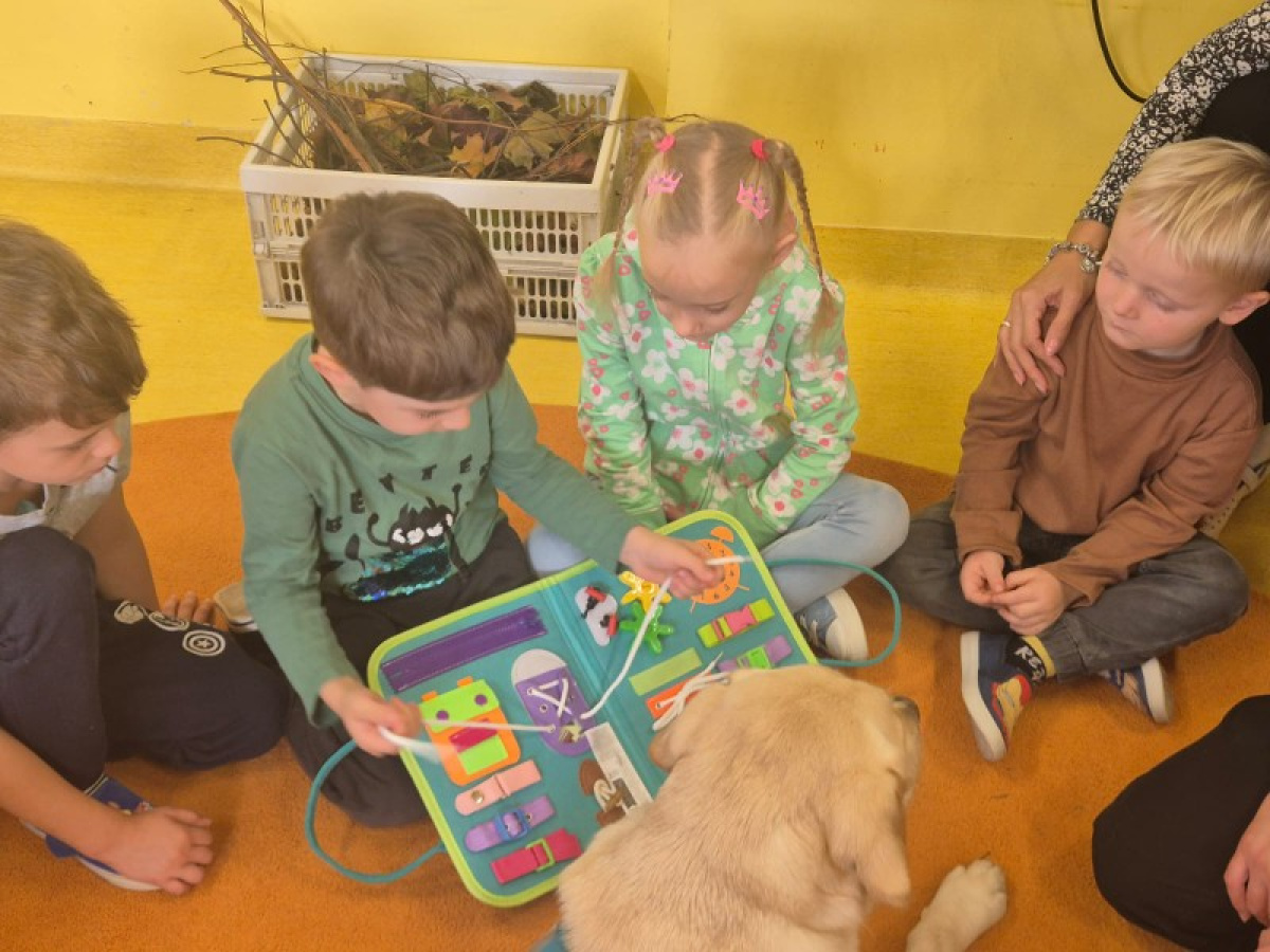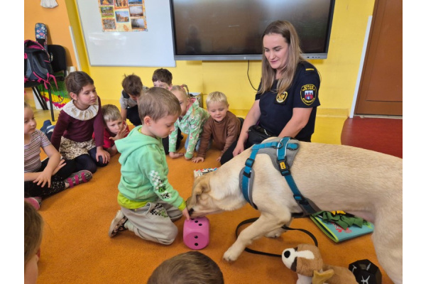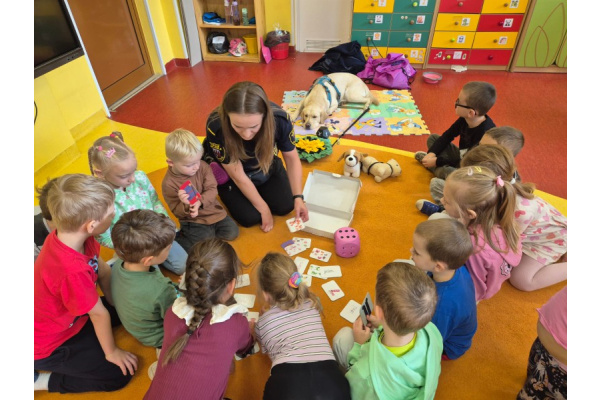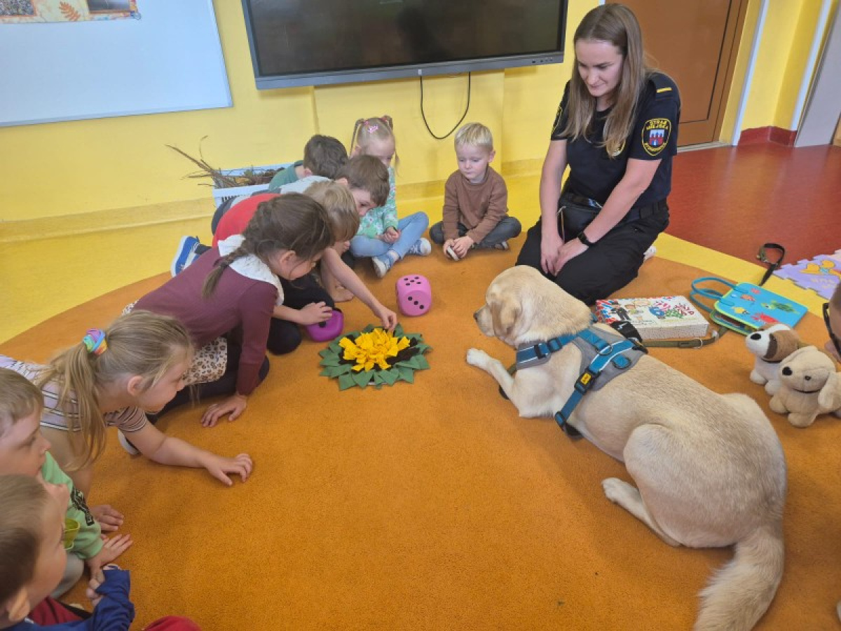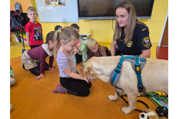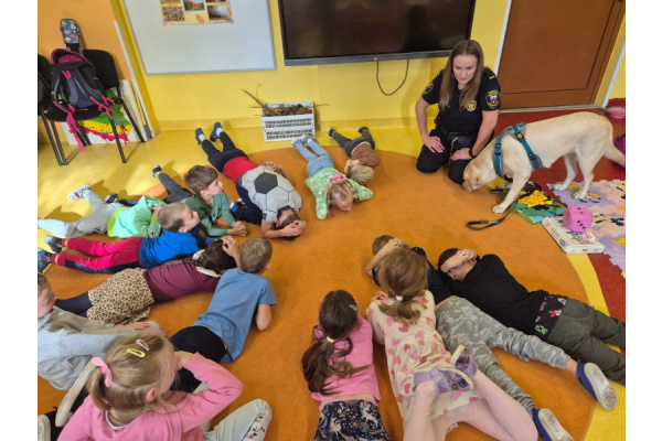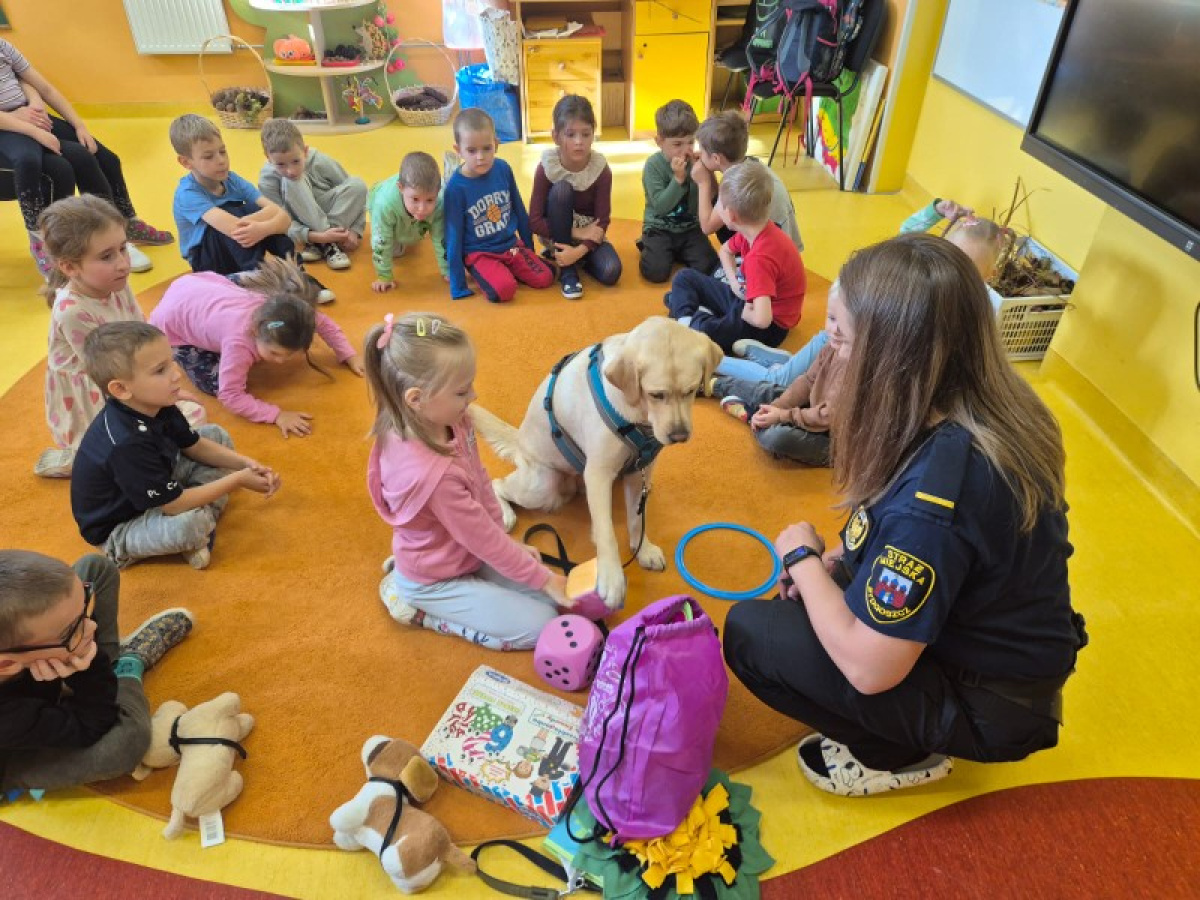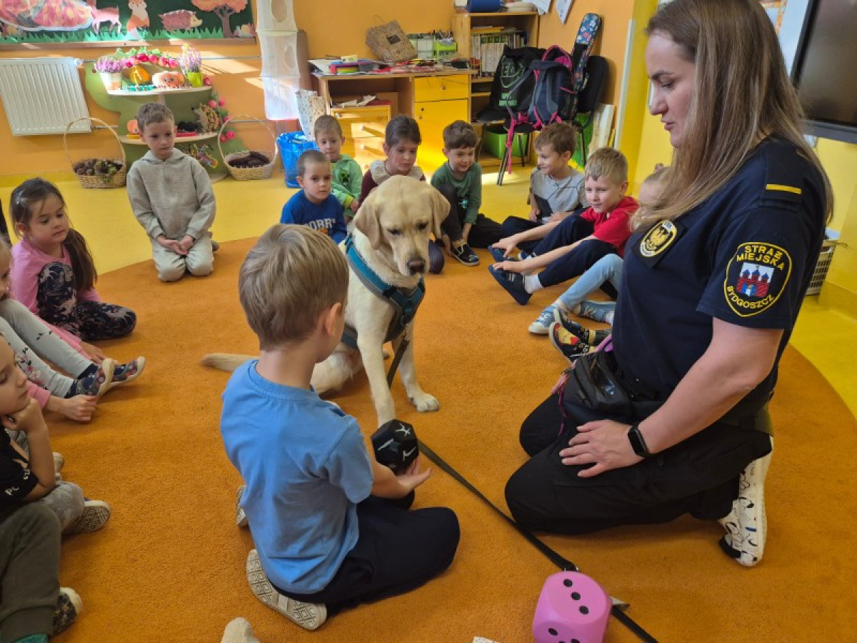 W piątek 15 października grupa Krecików gościła w swoich progach Strażniczkę Miejską Panią Żanetę Pankowską z pieskiem terapeutycznym Labi. Kreciki miały okazję poznać zasady bezpiecznego kontaktu z psem. Dowiedzieliśmy się również jak reagować, w razie ataku nieznanego zwierzęcia i wykonaliśmy wiele ciekawych ćwiczeń i zadań w towarzystwie Labi. W podziękowaniu za wspólne aktywności każdy miał okazję wręczyć Labi przyszne smaczki.
