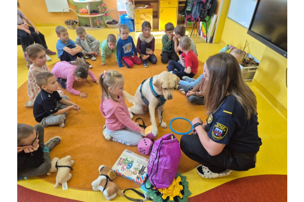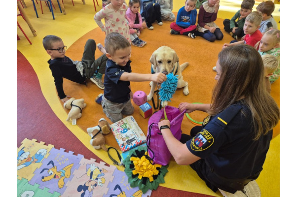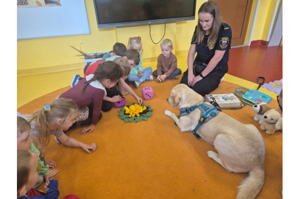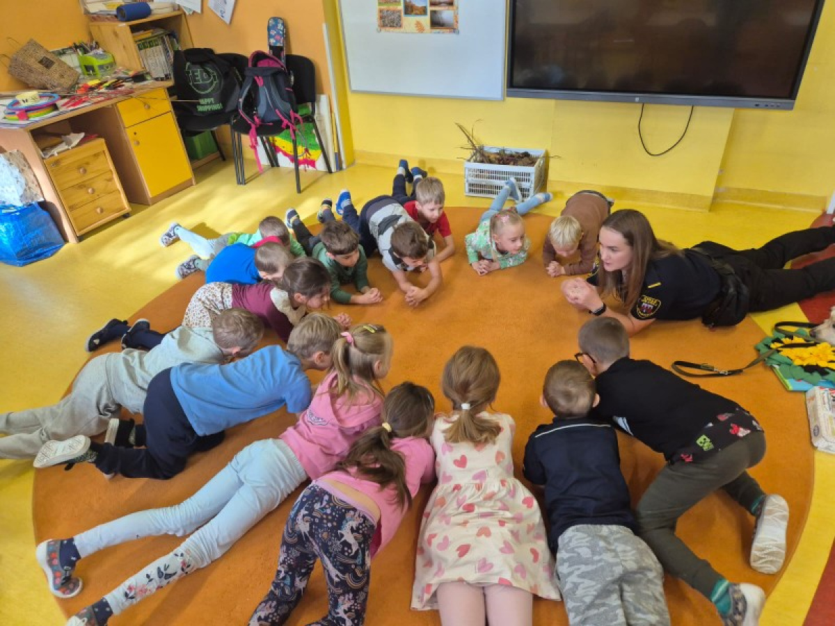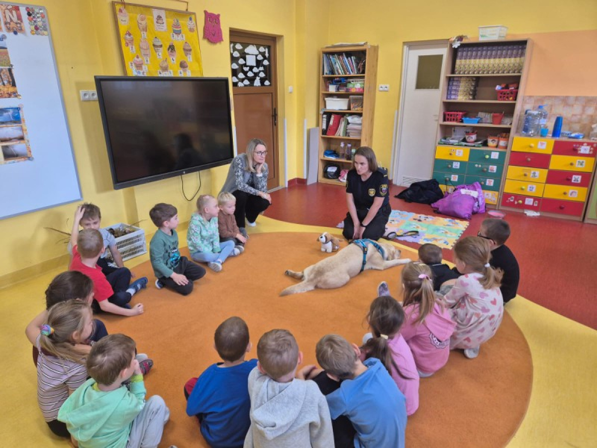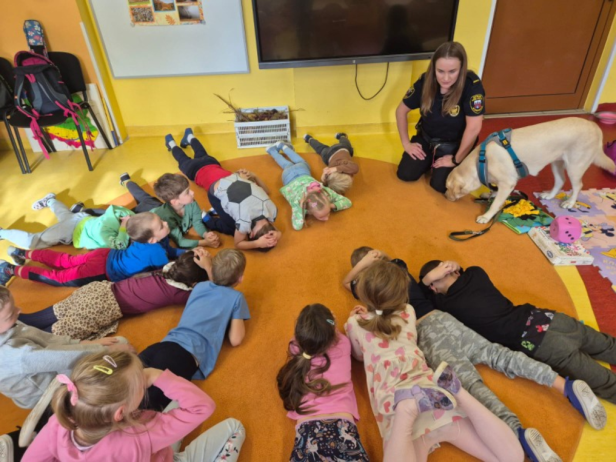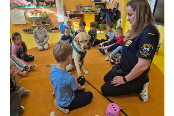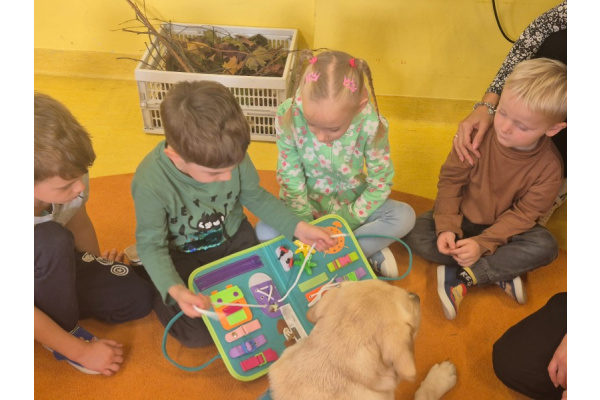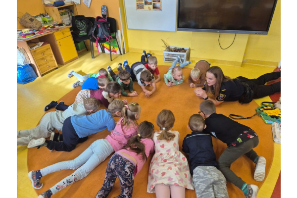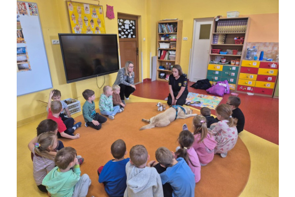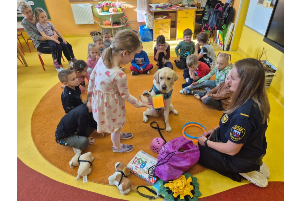 W piątek 15 października grupa Krecików gościła w swoich progach Strażniczkę Miejską Panią Żanetę Pankowską z pieskiem terapeutycznym Labi. Kreciki miały okazję poznać zasady bezpiecznego kontaktu z psem. Dowiedzieliśmy się również jak reagować, w razie ataku nieznanego zwierzęcia i wykonaliśmy wiele ciekawych ćwiczeń i zadań w towarzystwie Labi. W podziękowaniu za wspólne aktywności każdy miał okazję wręczyć Labi przyszne smaczki.