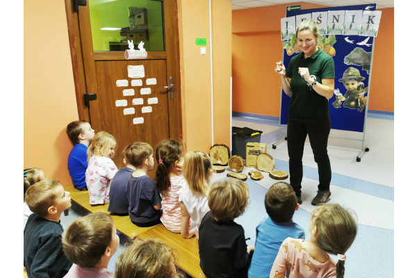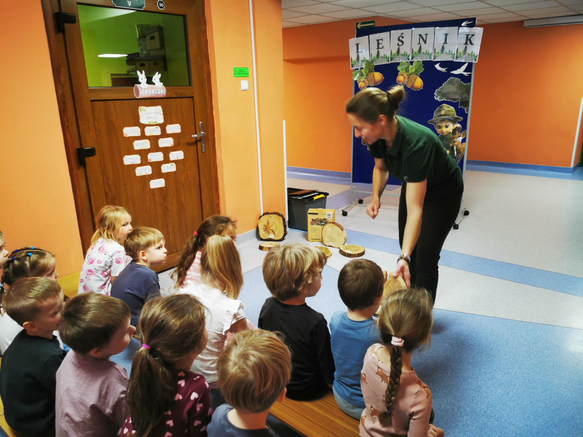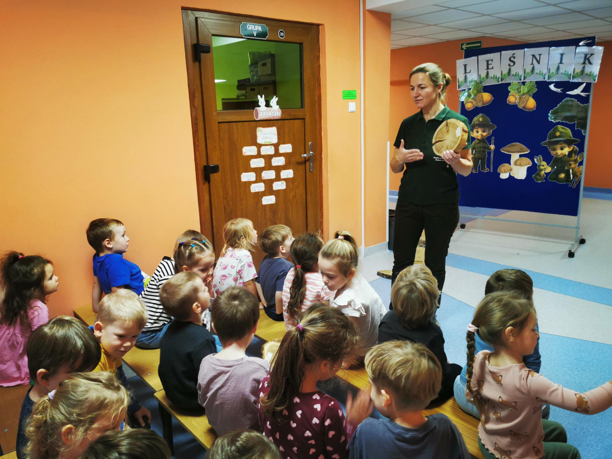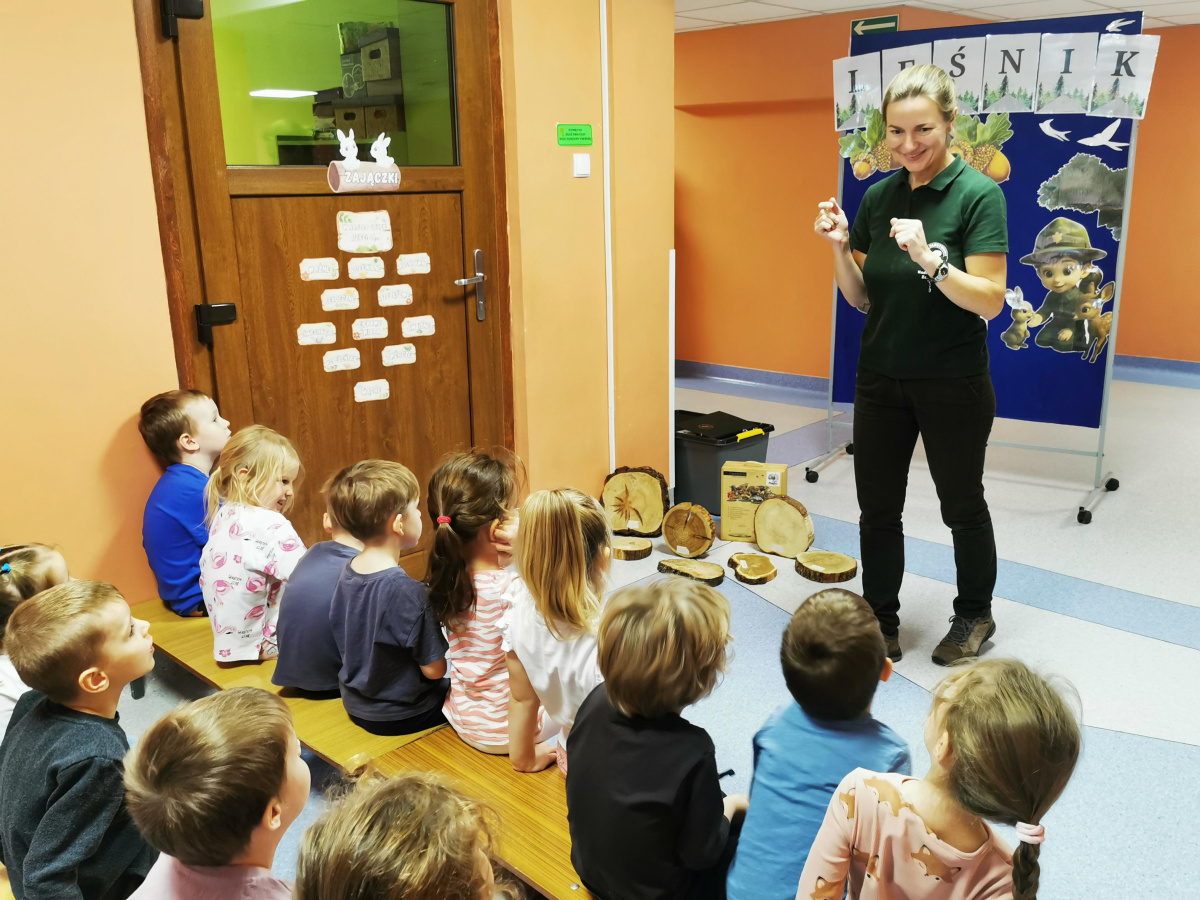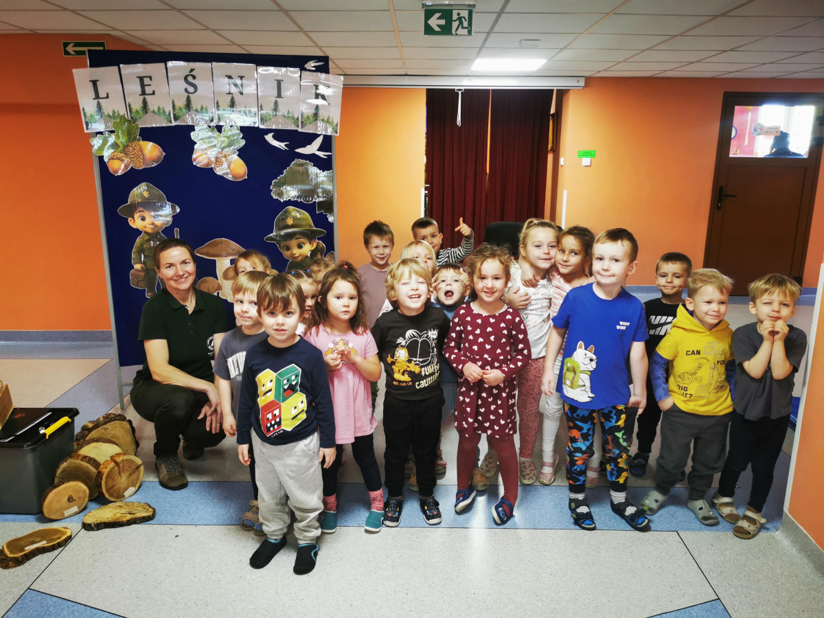 W naszym przedszkolu gościliśmy Panią Leśnik z Nadleśnictwa Żołędowo! Opowiadała dzieciom o swojej pracy oraz zdradziła wiele ciekawostek o lesie – o tym, jakie zwierzęta w nim mieszkają, jak przygotowują się do zimy i dlaczego tak ważne jest, aby dbać o przyrodę. Przedszkolaki mogły przyjrzeć się plastrom pnia drzewa i liczyć słoje, aby dowiedzieć się, ile lat ma drzewo. Dzieci z wielkim zainteresowaniem słuchały opowieści o życiu zwierząt, roślinach i jak las zmienia się wraz z porami roku. Spotkanie było pełne wrażeń i wspaniałej zabawy, a każde dziecko wróciło do domu z nową wiedzą i szacunkiem dla przyrody.