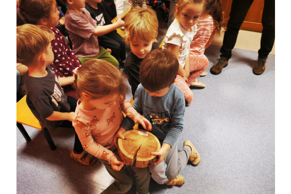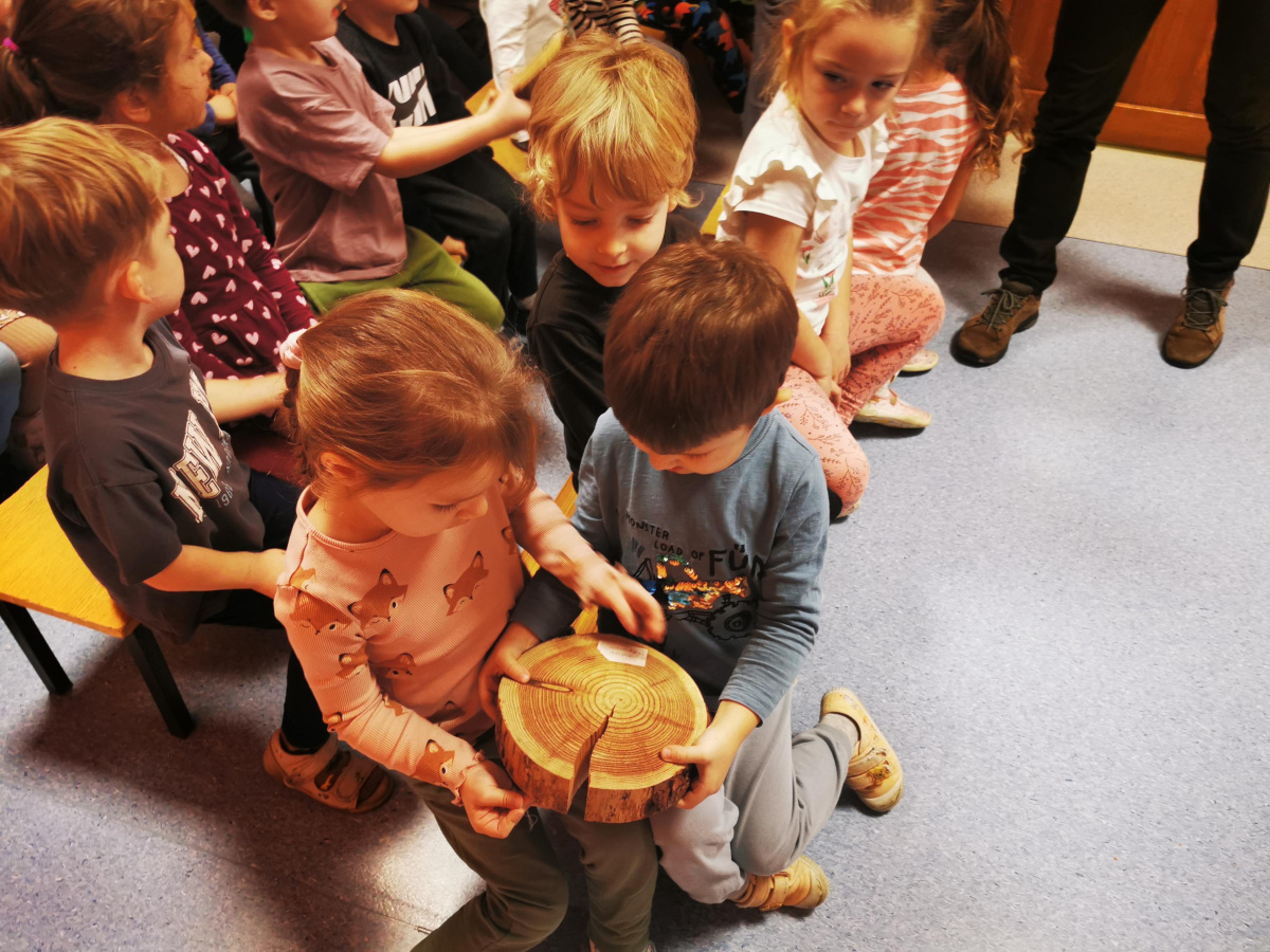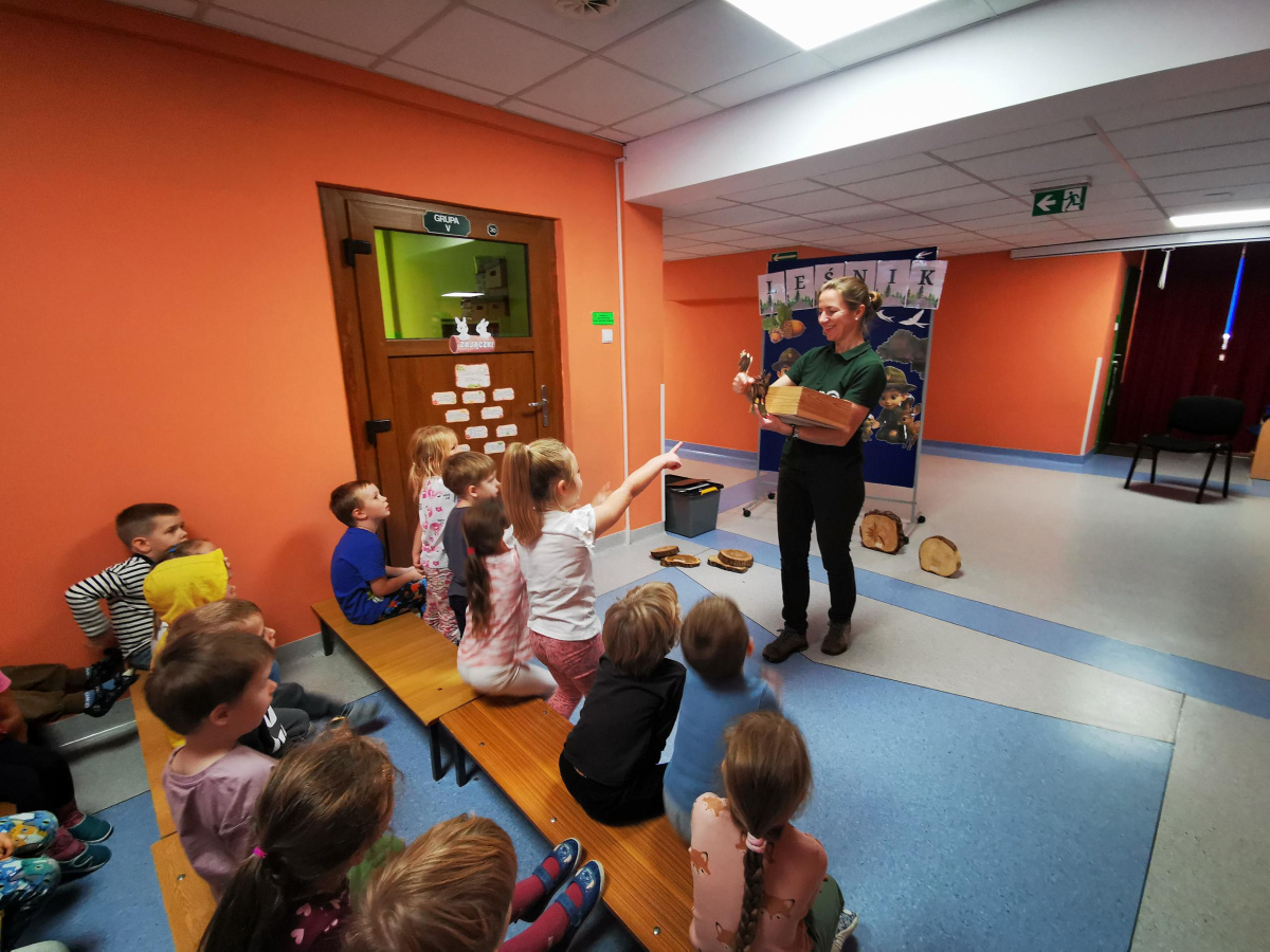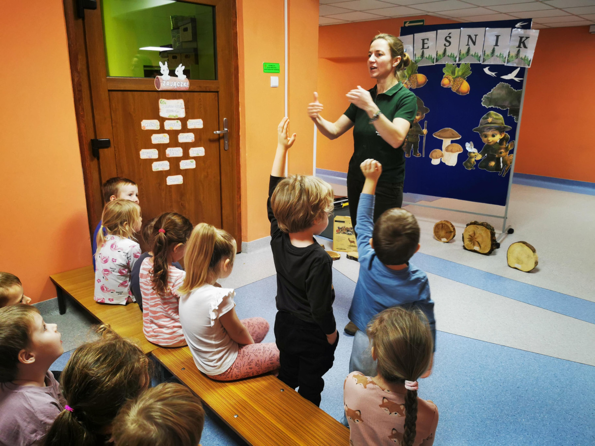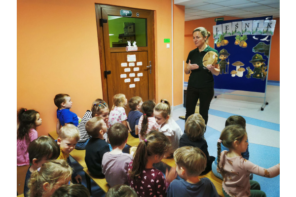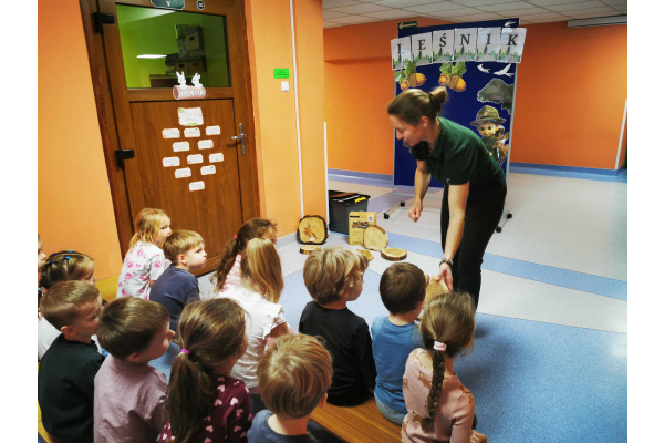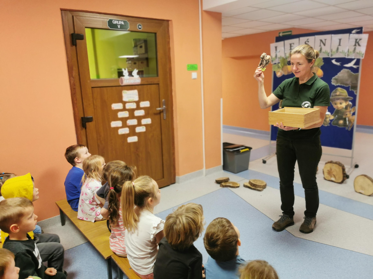 W naszym przedszkolu gościliśmy Panią Leśnik z Nadleśnictwa Żołędowo! Opowiadała dzieciom o swojej pracy oraz zdradziła wiele ciekawostek o lesie – o tym, jakie zwierzęta w nim mieszkają, jak przygotowują się do zimy i dlaczego tak ważne jest, aby dbać o przyrodę. Przedszkolaki mogły przyjrzeć się plastrom pnia drzewa i liczyć słoje, aby dowiedzieć się, ile lat ma drzewo. Dzieci z wielkim zainteresowaniem słuchały opowieści o życiu zwierząt, roślinach i jak las zmienia się wraz z porami roku. Spotkanie było pełne wrażeń i wspaniałej zabawy, a każde dziecko wróciło do domu z nową wiedzą i szacunkiem dla przyrody.