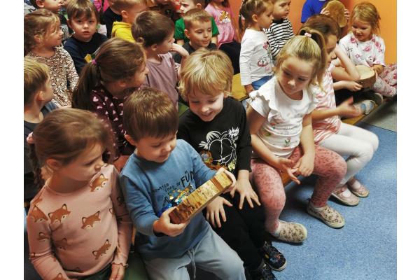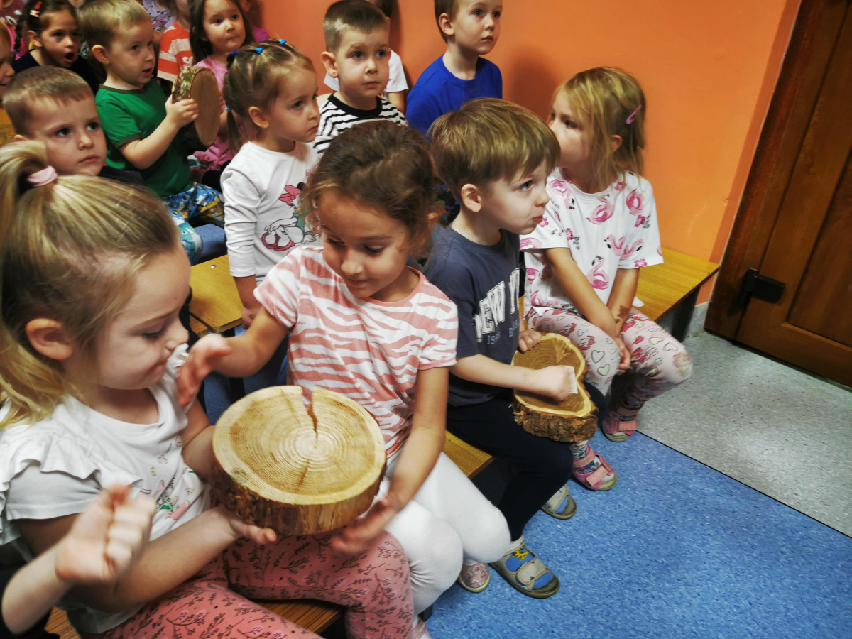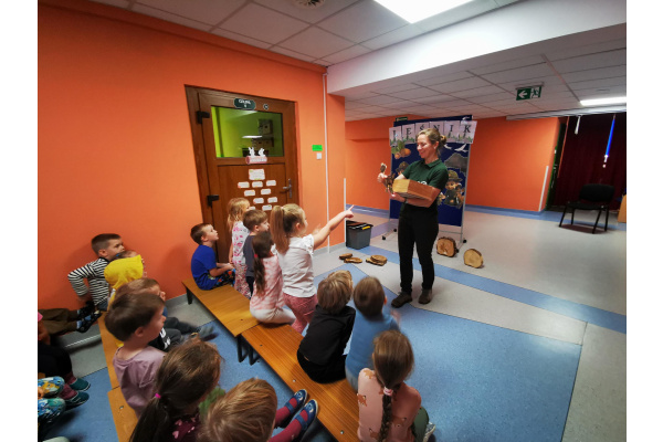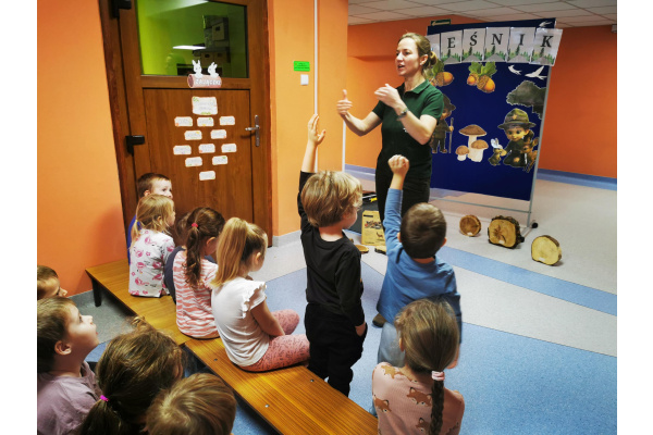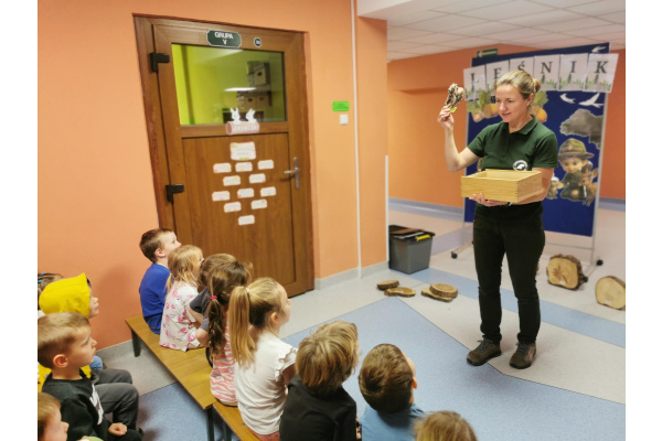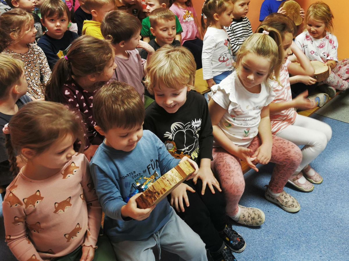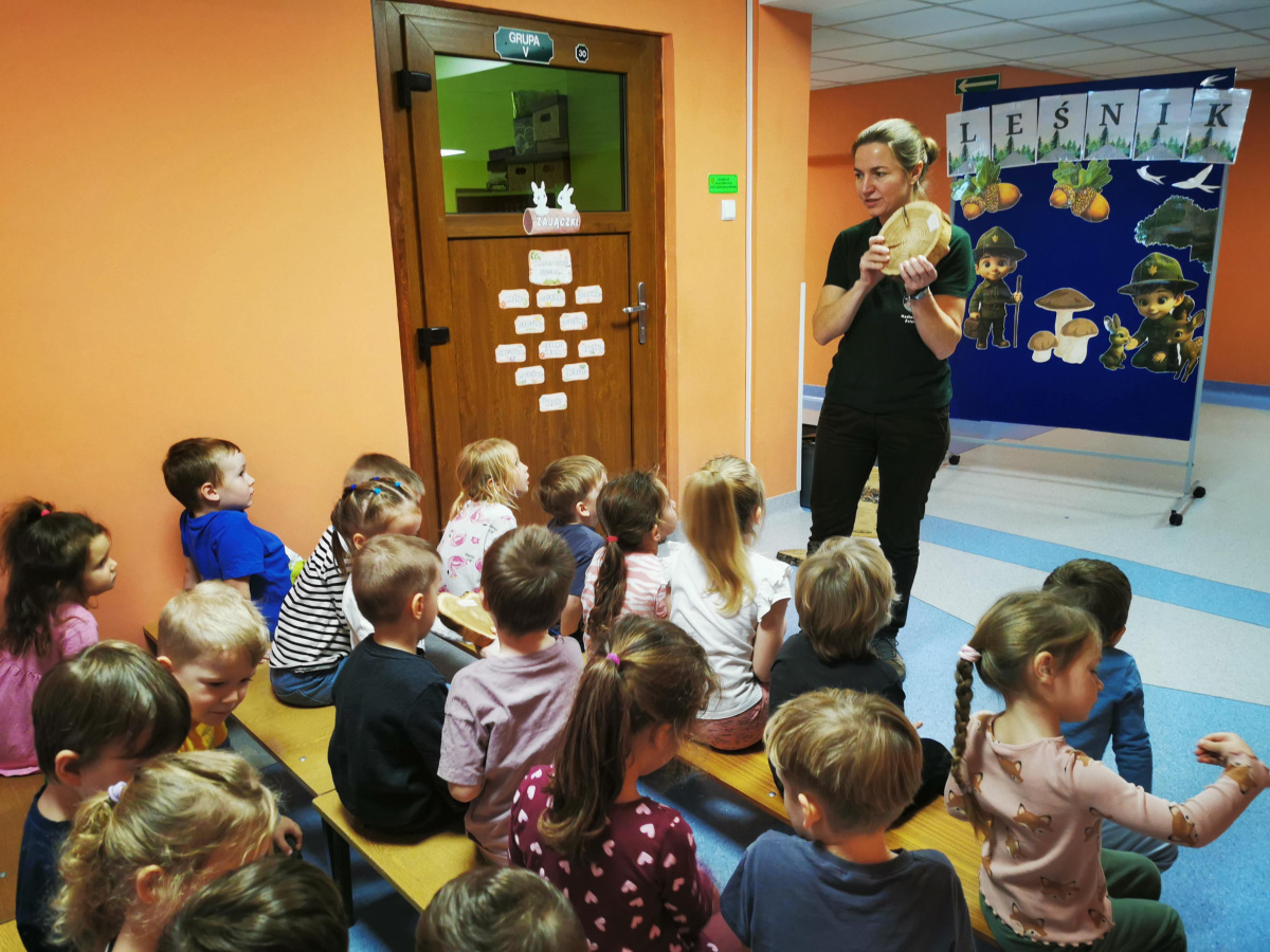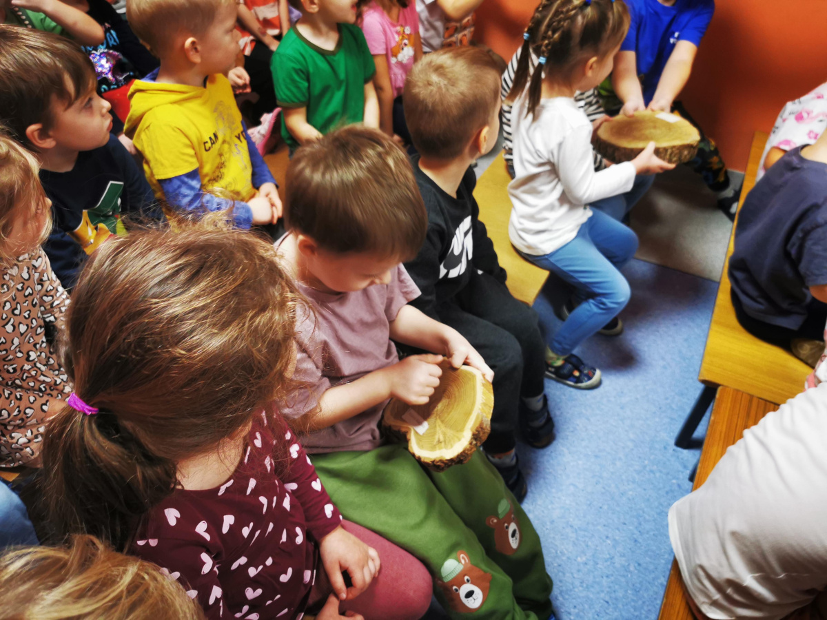W naszym przedszkolu gościliśmy Panią Leśnik z Nadleśnictwa Żołędowo! Opowiadała dzieciom o swojej pracy oraz zdradziła wiele ciekawostek o lesie – o tym, jakie zwierzęta w nim mieszkają, jak przygotowują się do zimy i dlaczego tak ważne jest, aby dbać o przyrodę. Przedszkolaki mogły przyjrzeć się plastrom pnia drzewa i liczyć słoje, aby dowiedzieć się, ile lat ma drzewo. Dzieci z wielkim zainteresowaniem słuchały opowieści o życiu zwierząt, roślinach i jak las zmienia się wraz z porami roku. Spotkanie było pełne wrażeń i wspaniałej zabawy, a każde dziecko wróciło do domu z nową wiedzą i szacunkiem dla przyrody.