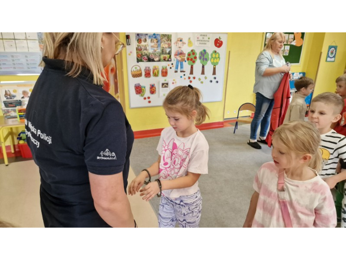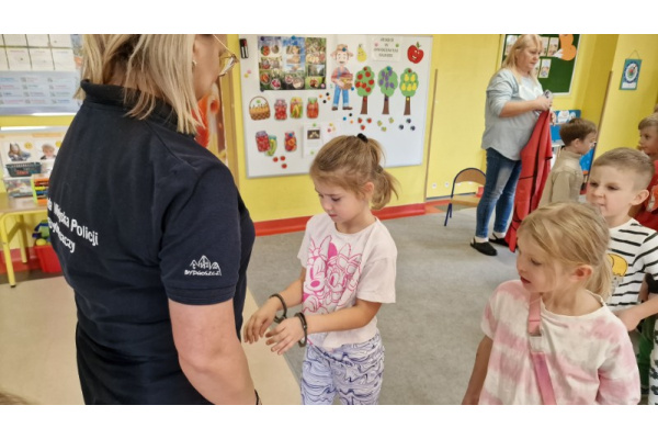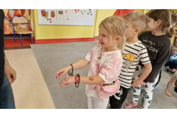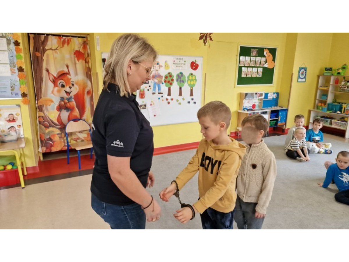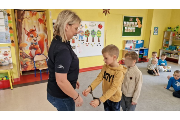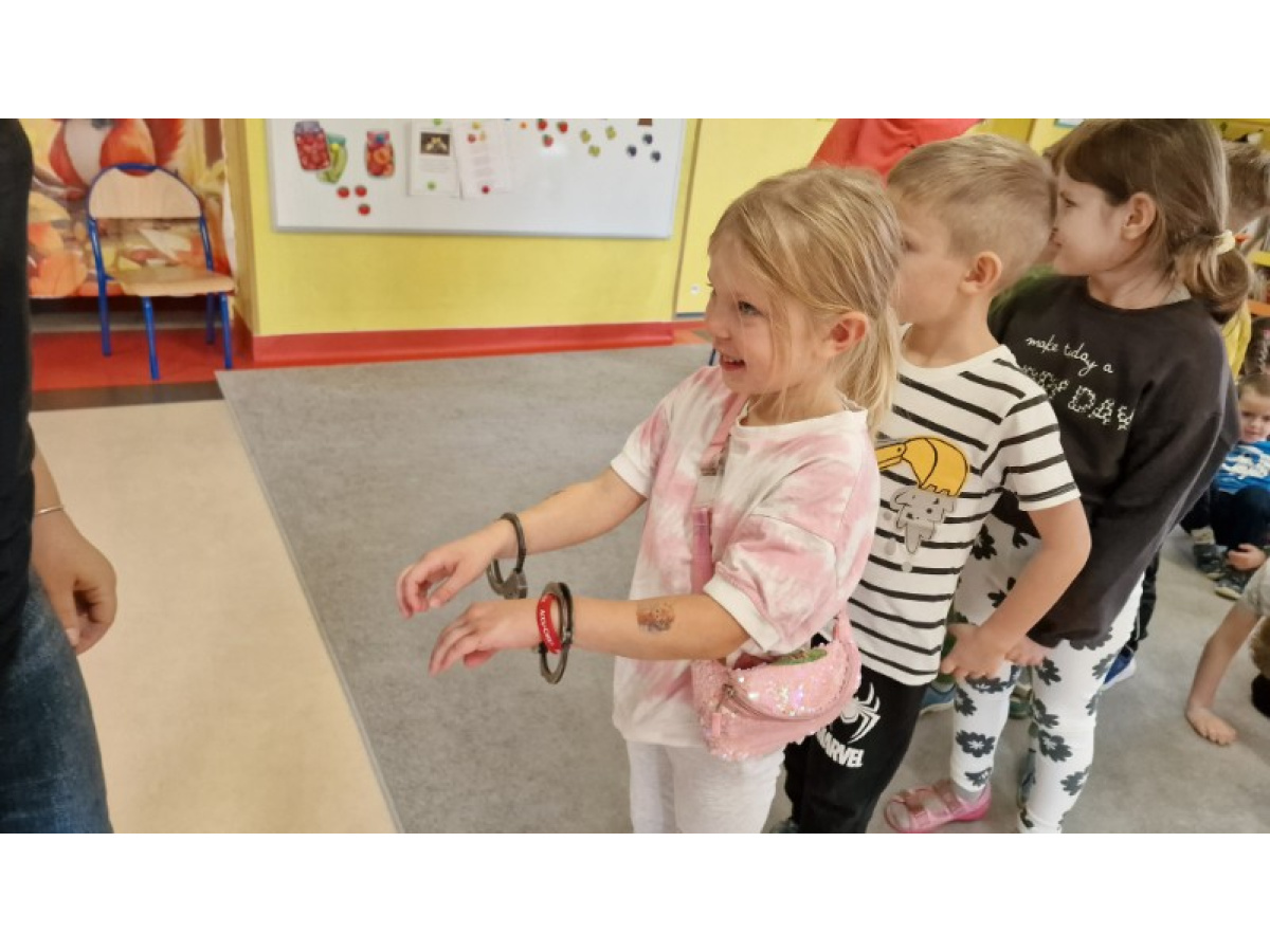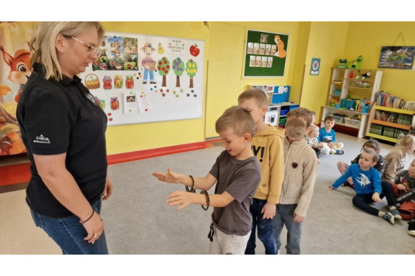 Panie policjantki przeprowadziły prelekcję na temat bezpiecznego poruszania się po drodze. Dzieci utrwaliły zasady przechodzenia przez jezdnię i rolę elementów odblaskowych. To była bardzo pouczająca lekcja bezpieczeństwa drogowego. Na koniec dzieci miały okazje przymierzyć kajdanki, co sprawiło im ogromną radość ;)