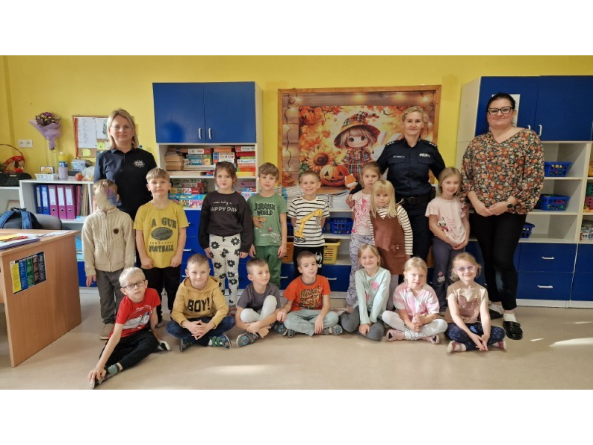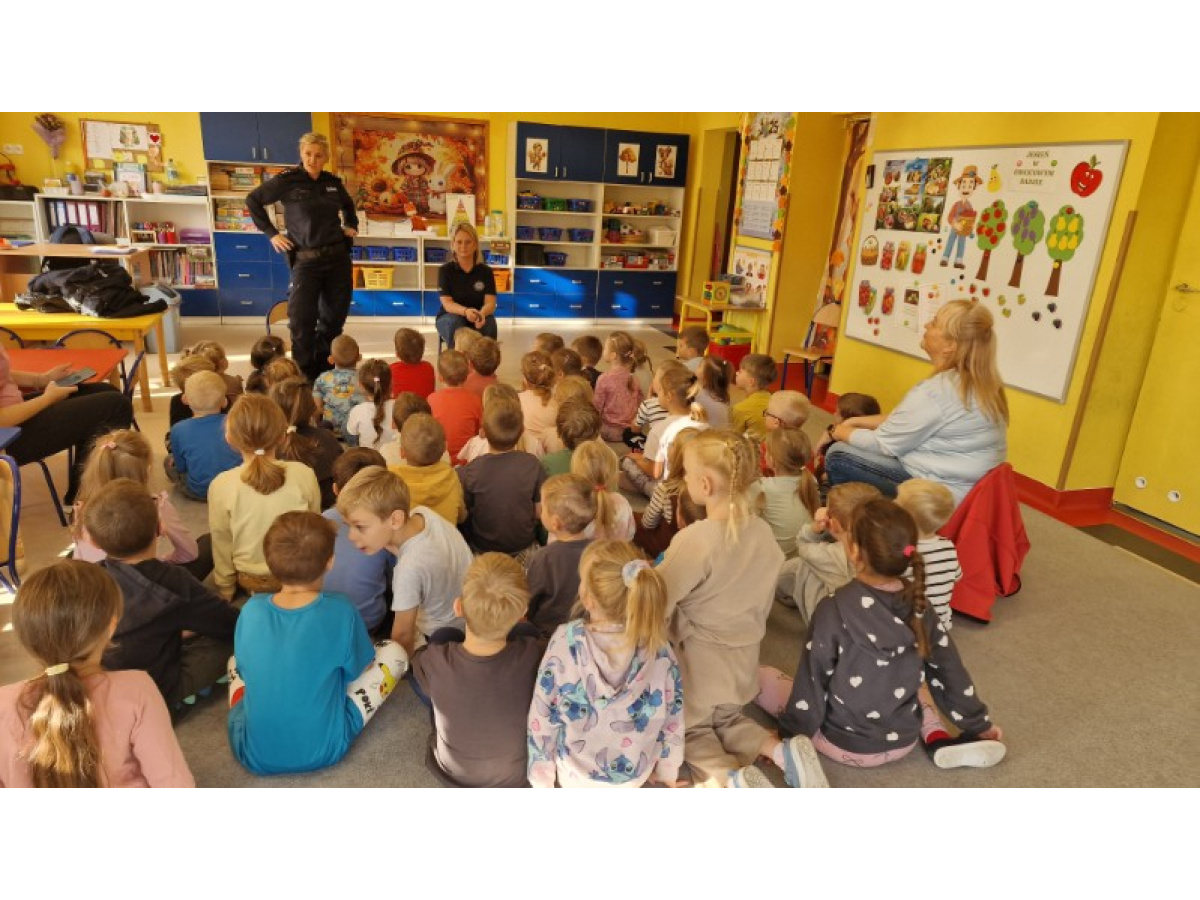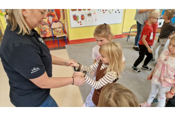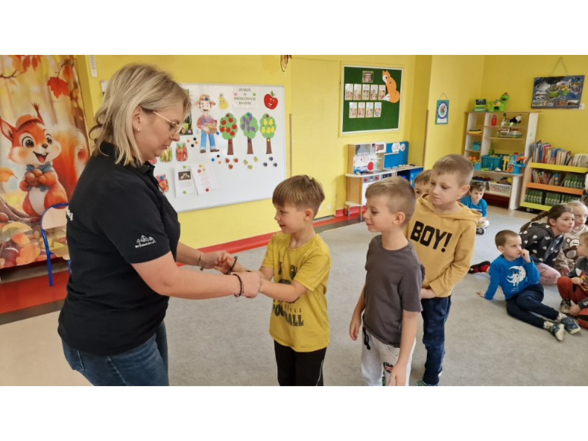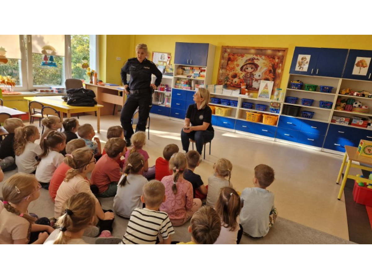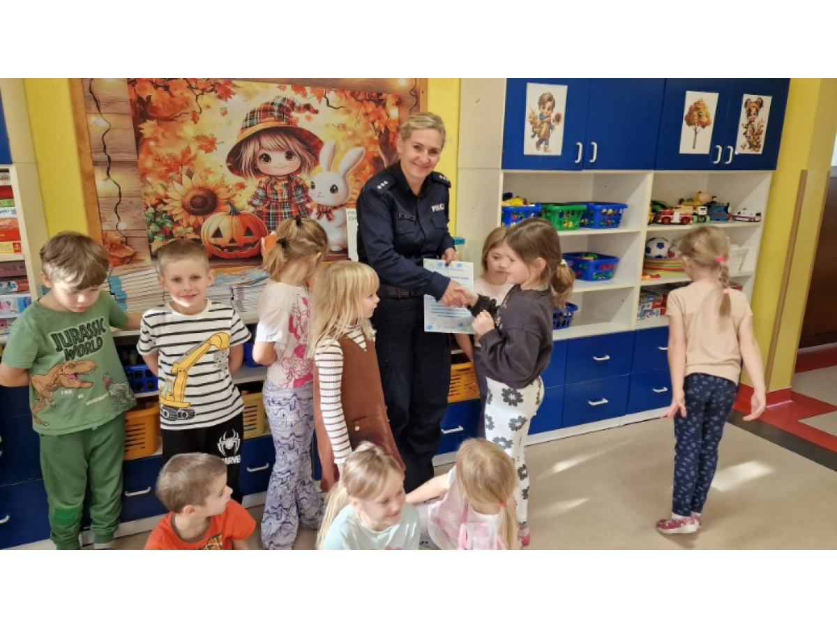 Panie policjantki przeprowadziły prelekcję na temat bezpiecznego poruszania się po drodze. Dzieci utrwaliły zasady przechodzenia przez jezdnię i rolę elementów odblaskowych. To była bardzo pouczająca lekcja bezpieczeństwa drogowego. Na koniec dzieci miały okazje przymierzyć kajdanki, co sprawiło im ogromną radość ;)