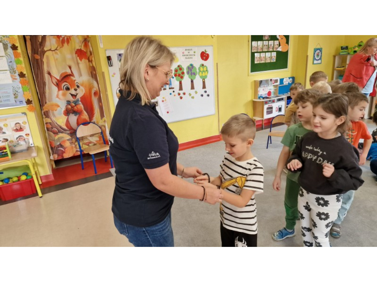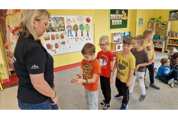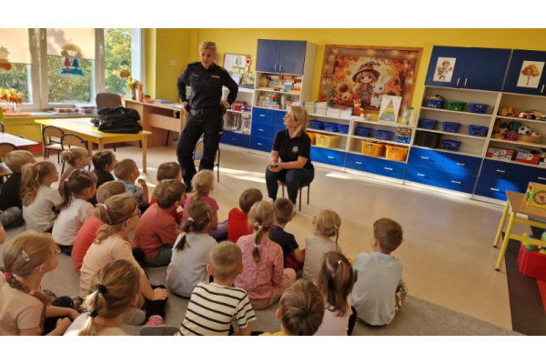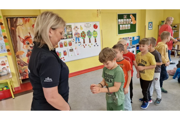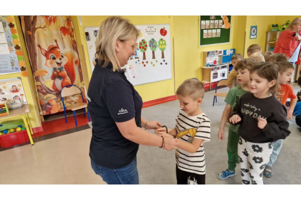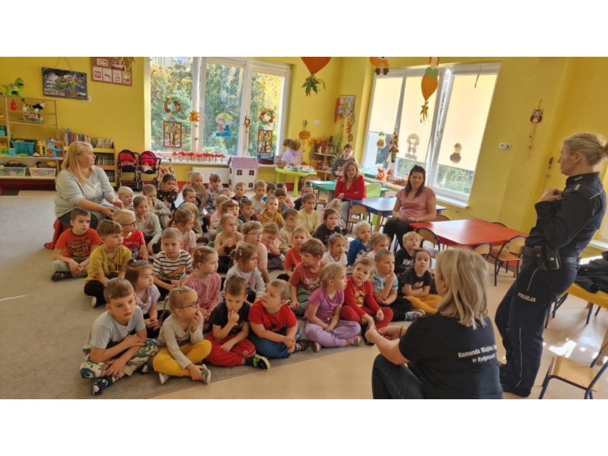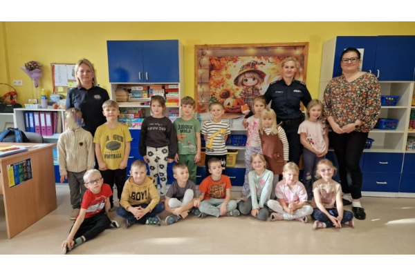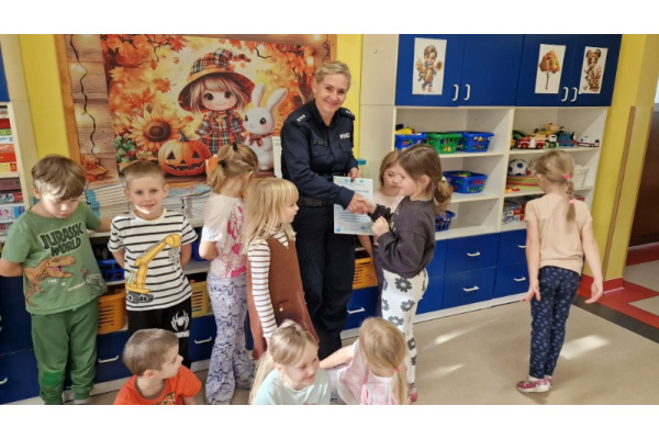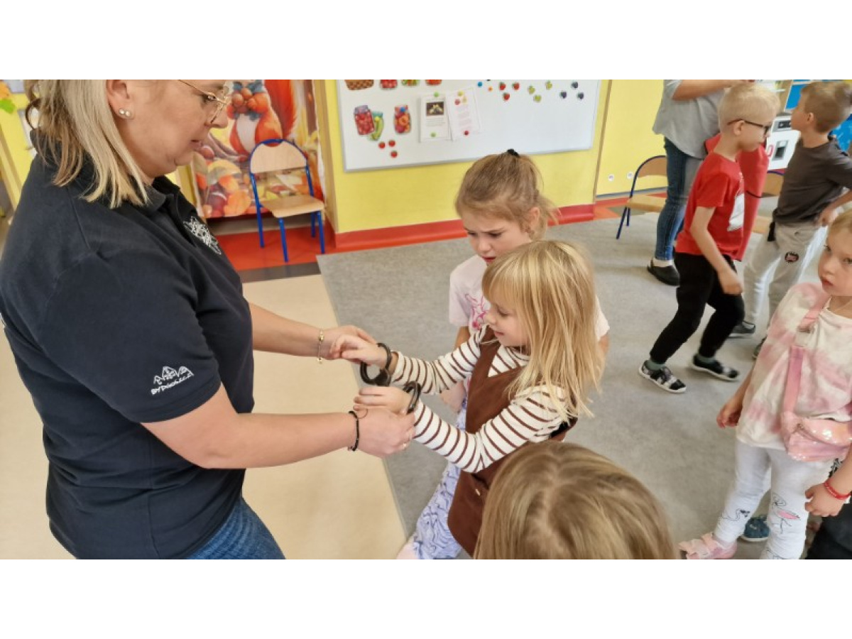 Panie policjantki przeprowadziły prelekcję na temat bezpiecznego poruszania się po drodze. Dzieci utrwaliły zasady przechodzenia przez jezdnię i rolę elementów odblaskowych. To była bardzo pouczająca lekcja bezpieczeństwa drogowego. Na koniec dzieci miały okazje przymierzyć kajdanki, co sprawiło im ogromną radość ;)
