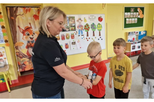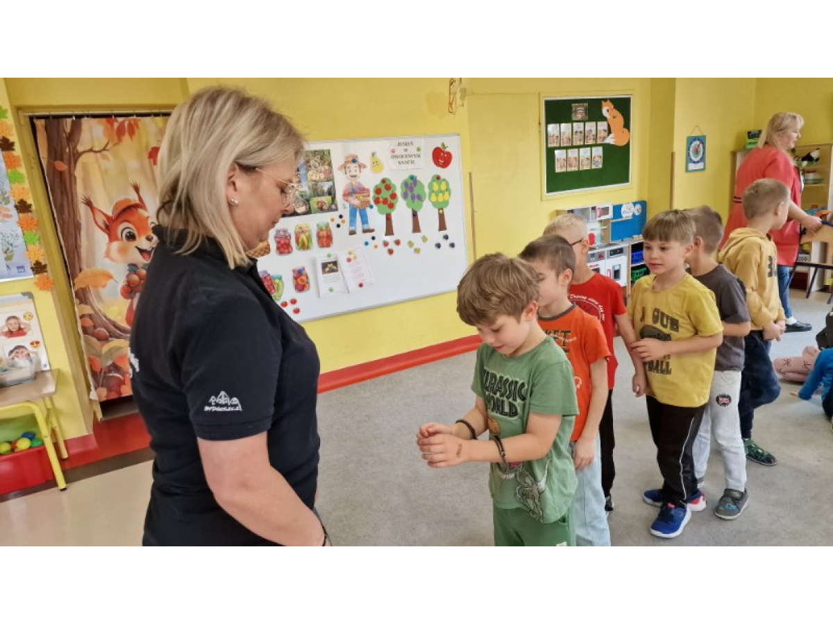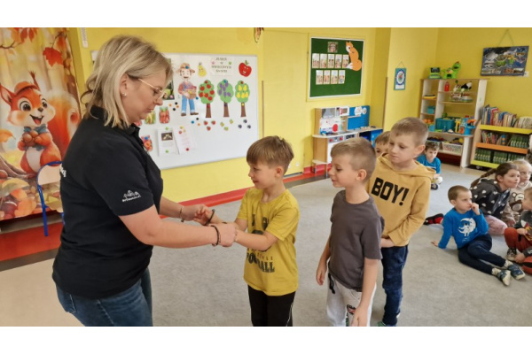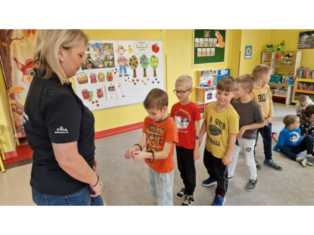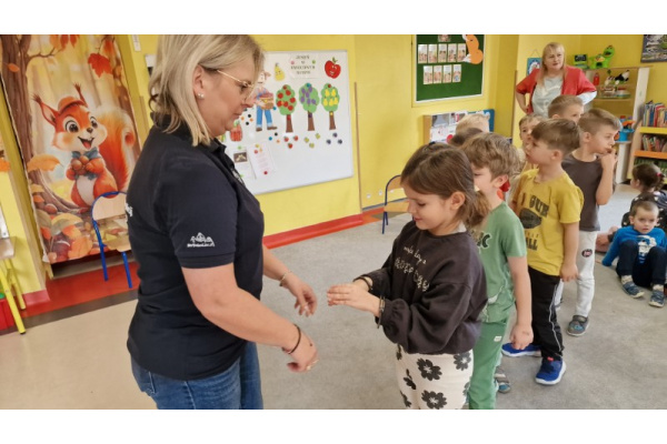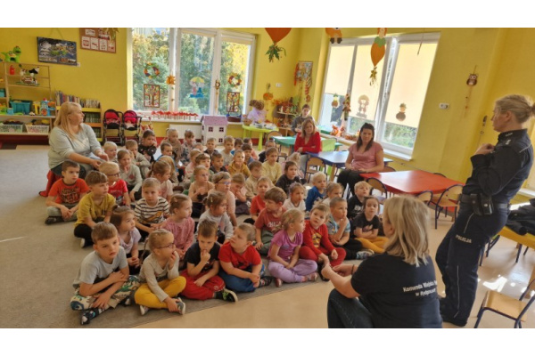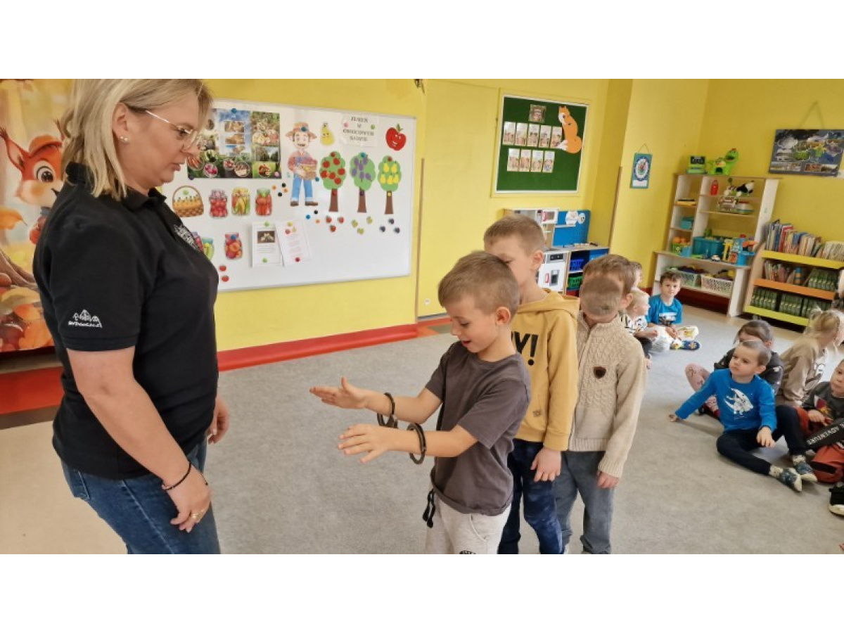 Panie policjantki przeprowadziły prelekcję na temat bezpiecznego poruszania się po drodze. Dzieci utrwaliły zasady przechodzenia przez jezdnię i rolę elementów odblaskowych. To była bardzo pouczająca lekcja bezpieczeństwa drogowego. Na koniec dzieci miały okazje przymierzyć kajdanki, co sprawiło im ogromną radość ;)
