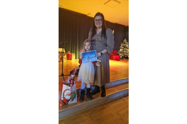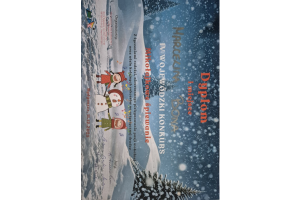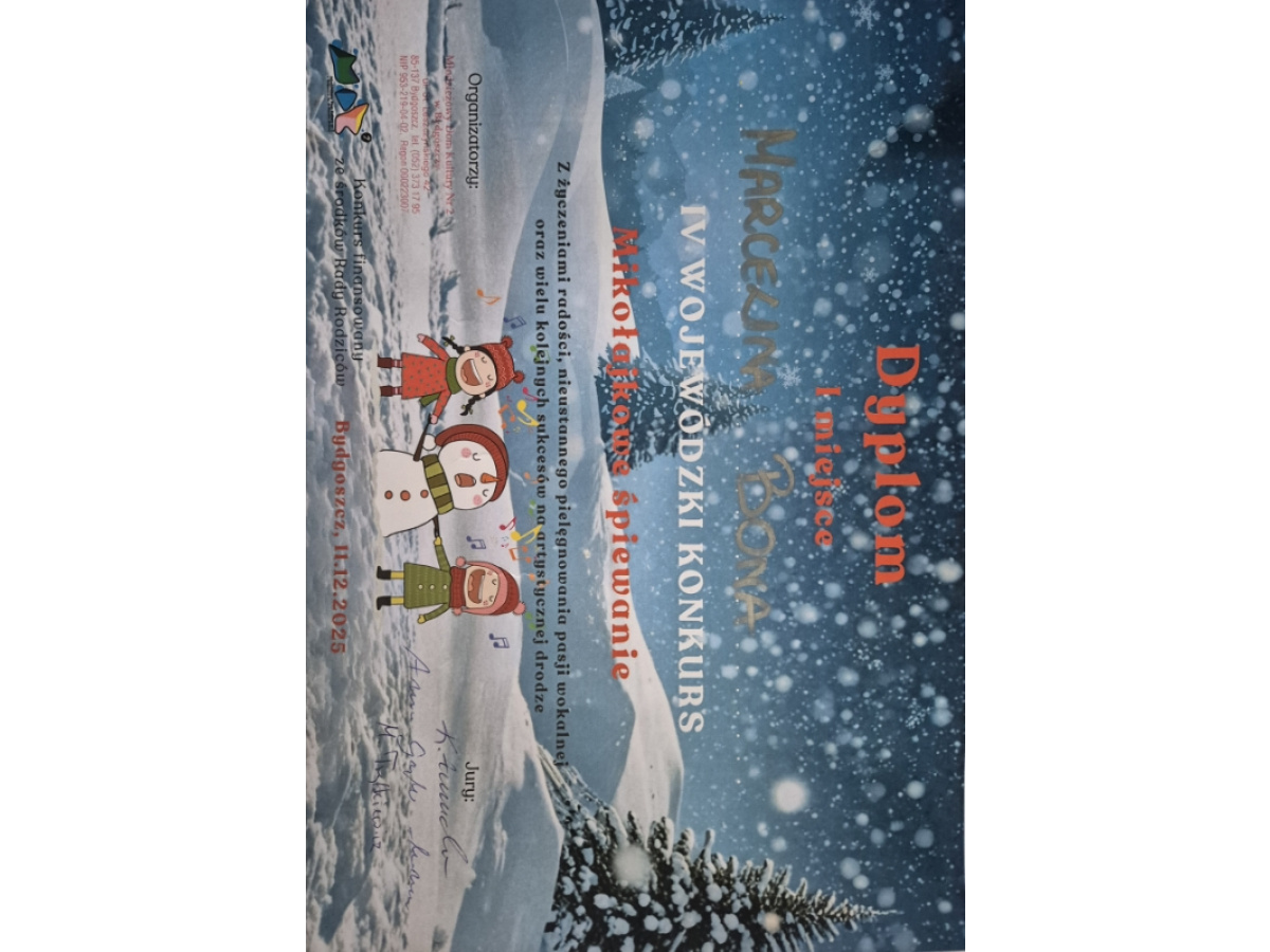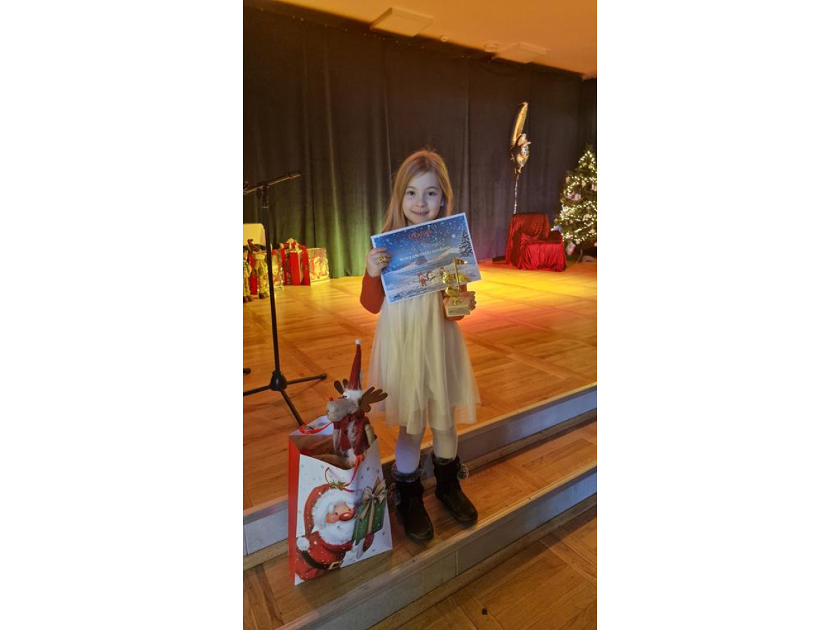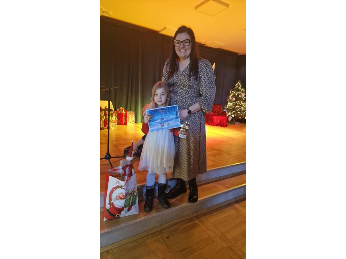 11 grudnia Marcelina z grupy "Świetliki" reprezentowała nasze przedszkole w IV WOJEWÓDZKIM KONKURSIE „Mikołajkowe śpiewanie” organizowanym przez Młodzieżowy Dom Kultury nr 2. W konkursie brali udział soliści i zespoły, którzy zaprezentowali piosenki o świętach i Mikołaju. Marcelina zajęła I miejsce wśród solistów, śpiewając piosenkę pt.: "Wesołych Świąt". Serdeczne gratulacje!
