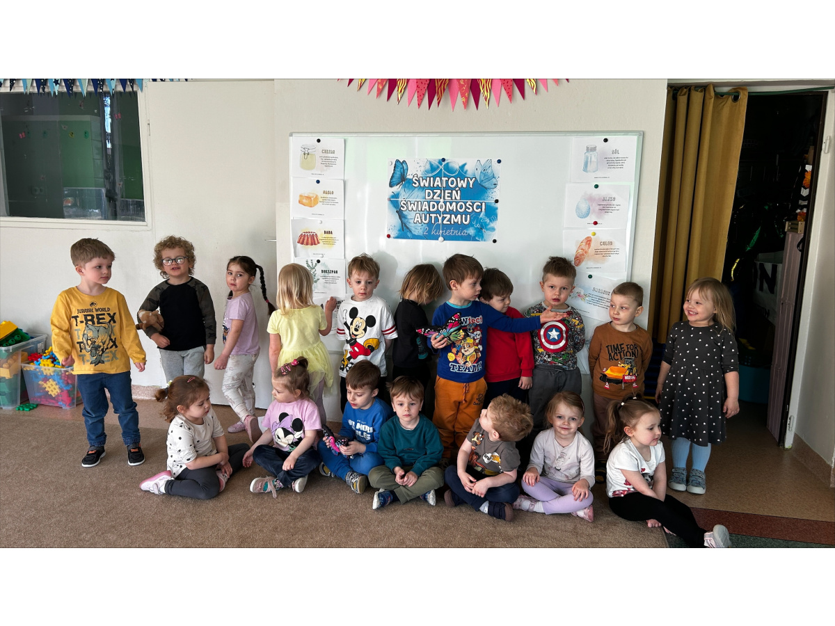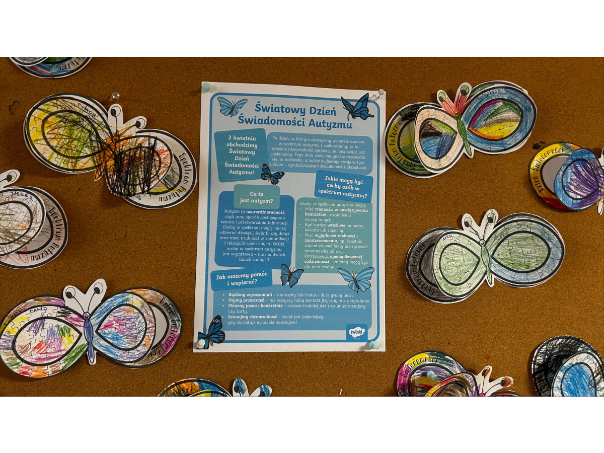 Dzieci z grupy „Motylki” obchodziły Światowy Dzień Świadomości Autyzmu. Tego dnia wysłuchały opowiadania o tym, że każdy człowiek jest wyjątkowy i ważny, a różnice między nami są czymś naturalnym i wartościowym. Rozmawialiśmy o wzajemnym szacunku, empatii oraz wspieraniu się na co dzień. Przedszkolaki wykonały także pracę plastyczną- kolorowe motylki, które ozdobiły tablicę na korytarzu, przypominając wszystkim o życzliwości, akceptacji i otwartości na drugiego człowieka.