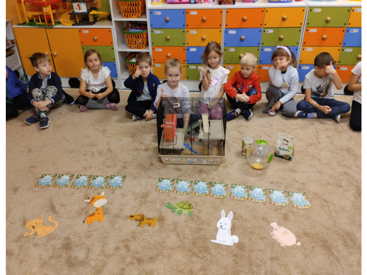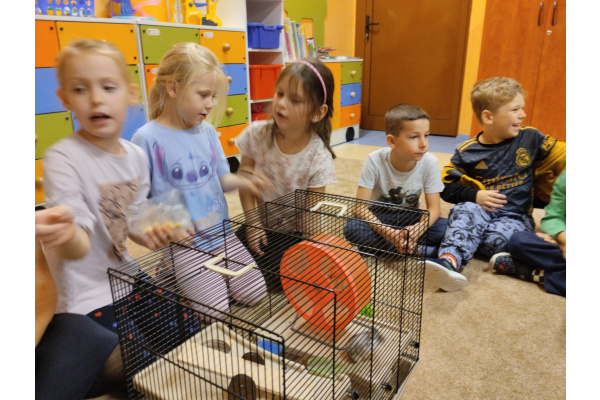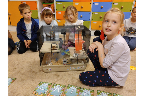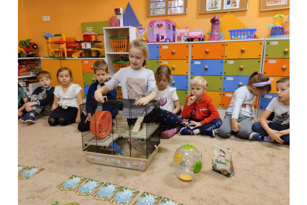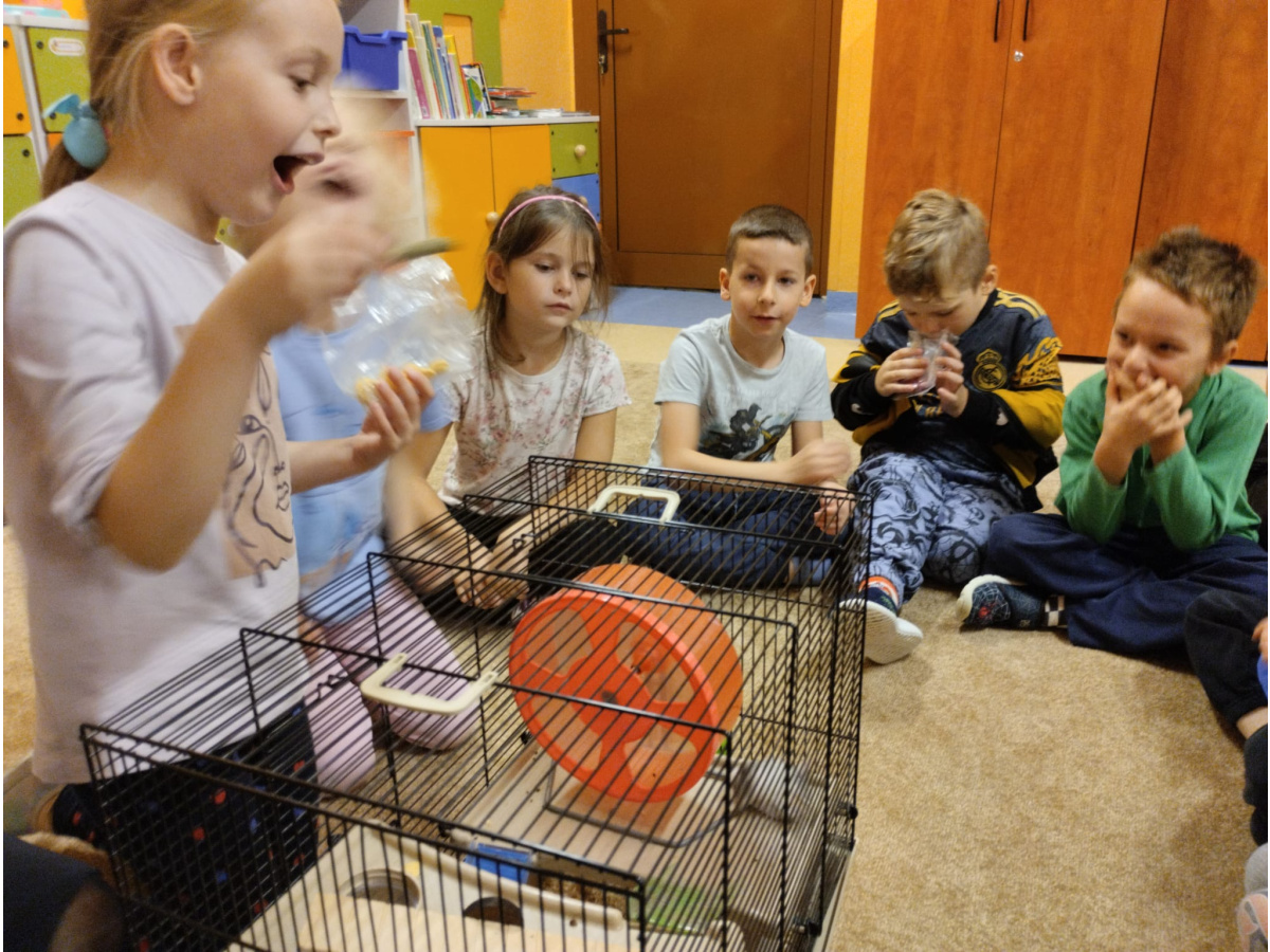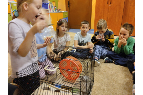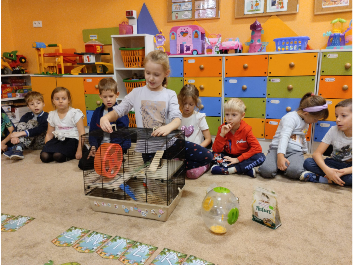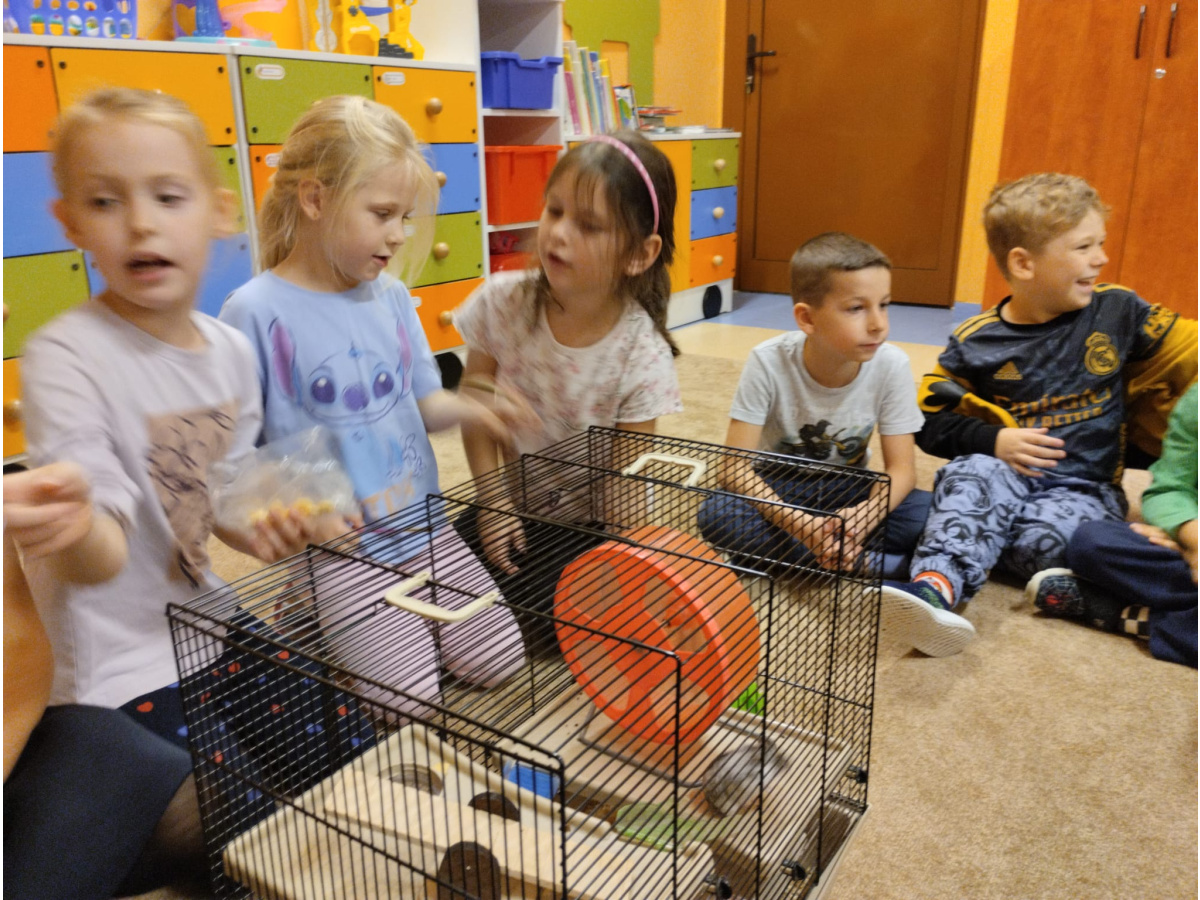 7 października w naszej grupie obchodziliśmy "Światowy Dzień Zwierząt". Z tej okazji w naszej sali zagościł chomik o imieniu Szaruś. Ada, właścicielka chomika, opowiedział o jego zwyczajach, sposobie odżywiania oraz jak dbać o niego. Dzieci miały okazję obserwować zachowania Szarusia, jego zabawy i akrobacje. Pytań przedszkolaków na temat chomika oraz uśmiechu na twarzach nie było końca...