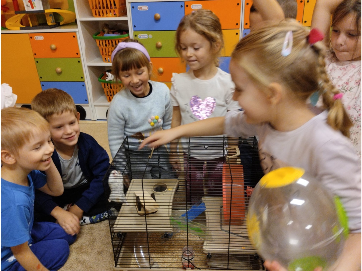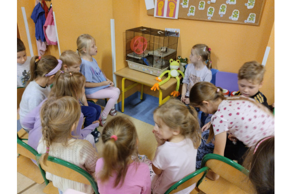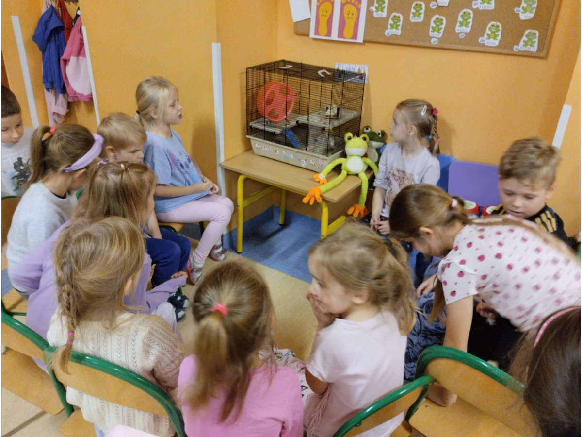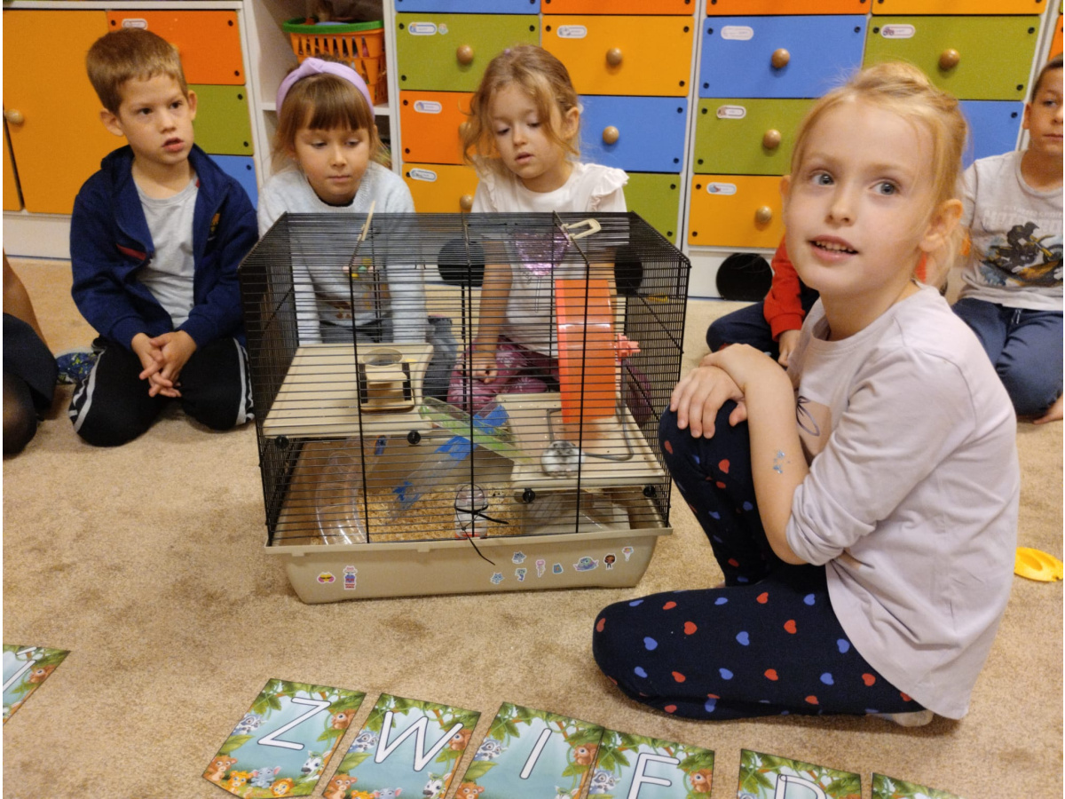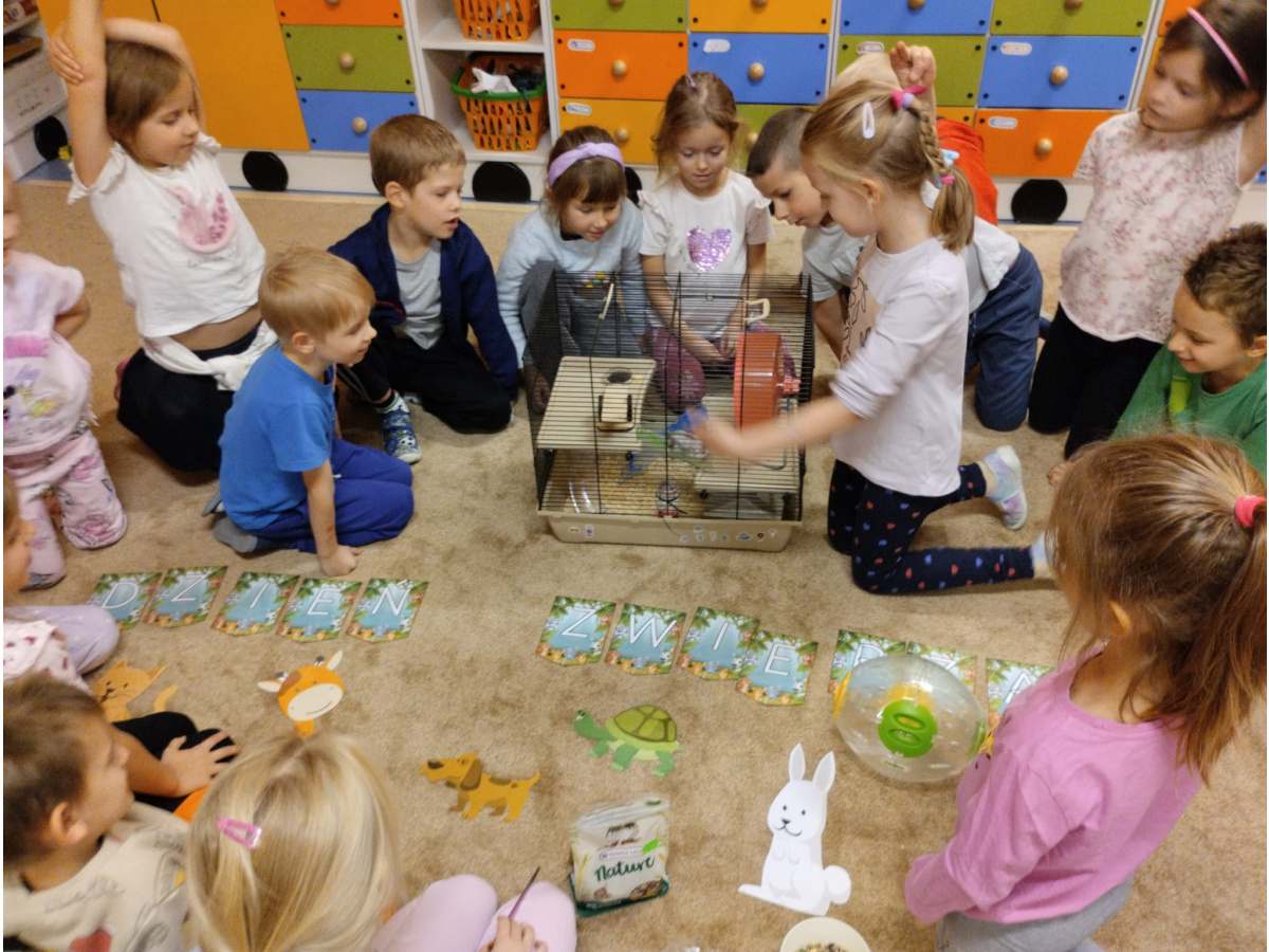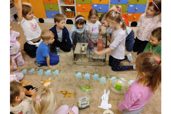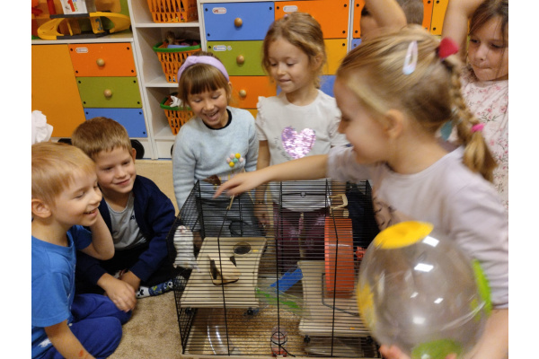 7 października w naszej grupie obchodziliśmy "Światowy Dzień Zwierząt". Z tej okazji w naszej sali zagościł chomik o imieniu Szaruś. Ada, właścicielka chomika, opowiedział o jego zwyczajach, sposobie odżywiania oraz jak dbać o niego. Dzieci miały okazję obserwować zachowania Szarusia, jego zabawy i akrobacje. Pytań przedszkolaków na temat chomika oraz uśmiechu na twarzach nie było końca...
