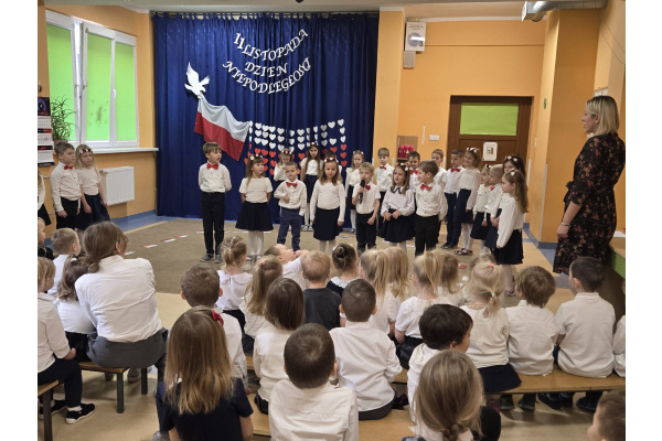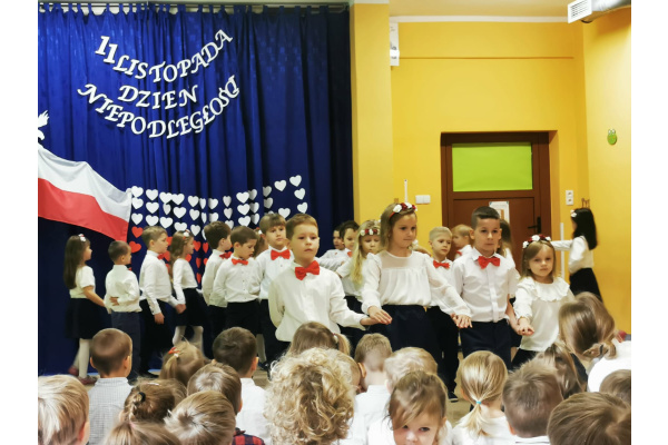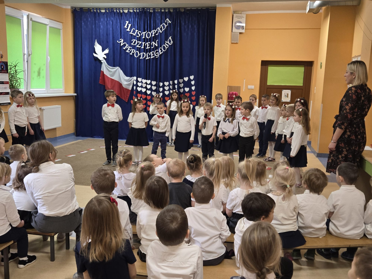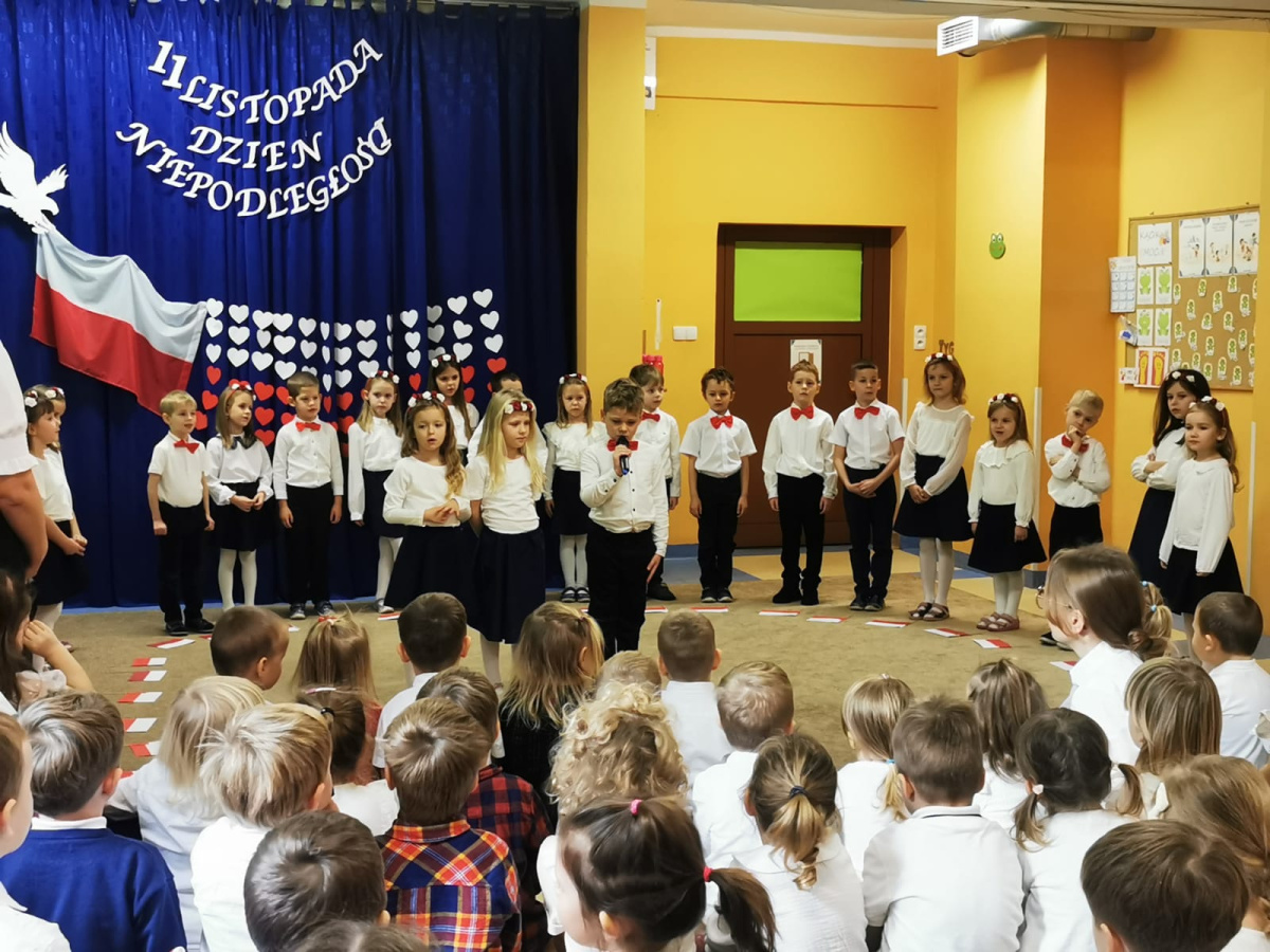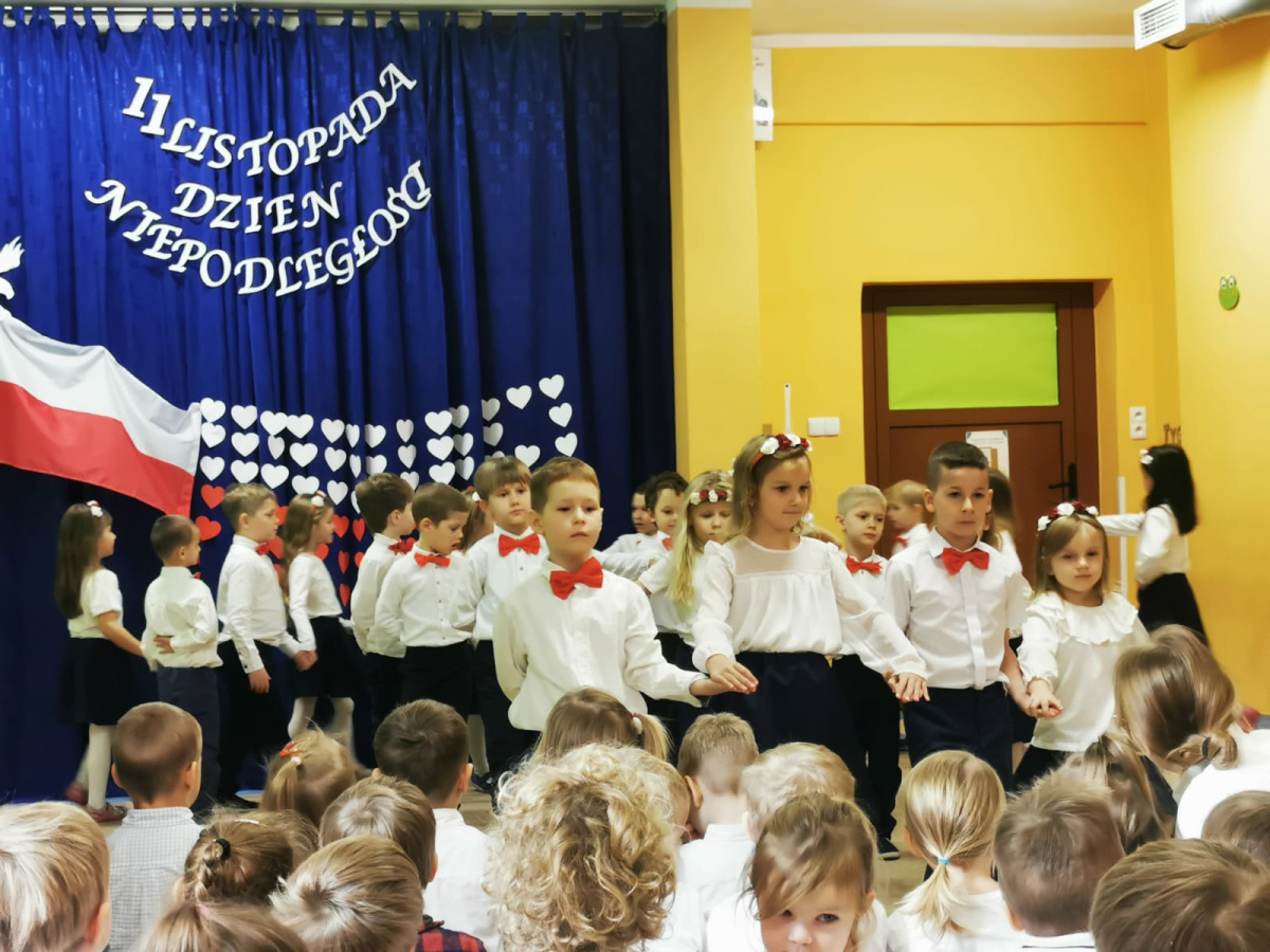 7. listopada obchodziliśmy w naszym przedszkolu Święto Odzyskania przez Polskę Niepodległości. Z tej okazji wszystkie przedszkolaki przyszły odświętnie ubrane, natomiast dzieci z najstarszej grupy 6- latków, z grupy "Żabek" zaprezentowały program muzyczno- artystyczny o tematyce patriotycznej. Były piosenki, wiersze, tańce, barwy biało- czerwone. Było dużo dumy i wzruszeń!