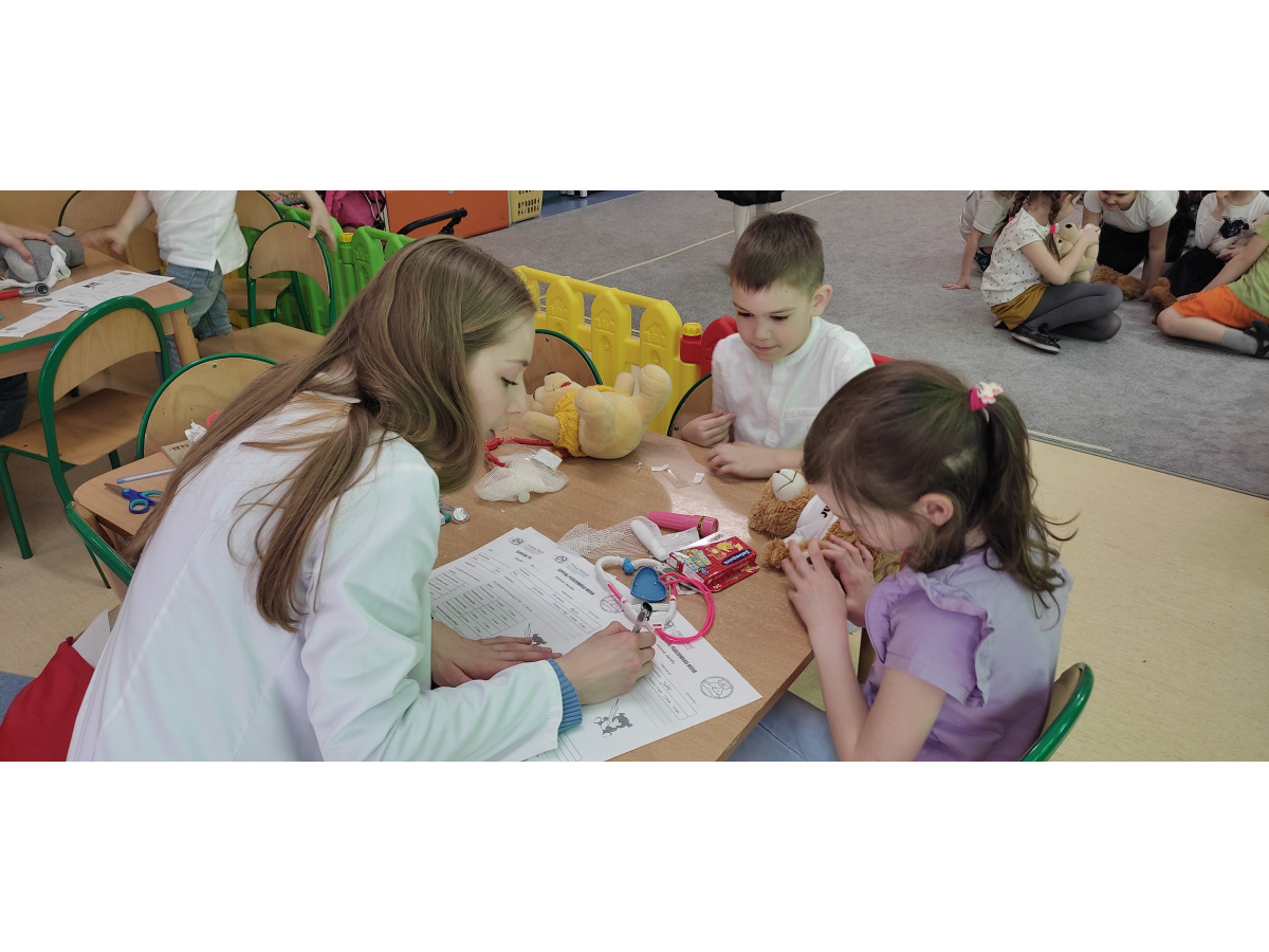 Szpital Pluszowego Misia to jeden z projektów prowadzonych przez Międzynarodowe Stowarzyszenie Studentów Medycyny IFMSA-Poland. Studentki odwiedziły wszystkie grupy w naszym przedszkolu. Dzieci przyniosły środki opatrunkowe i swoje maskotki. Zdobywały nowe wiadomości i doświadczenia z zakresu troski o zdrowie i pozbywały się stresu związanego z „syndromem białego fartucha”. Zdjęcia potwierdzają, że dzieci wczuwały się w role.