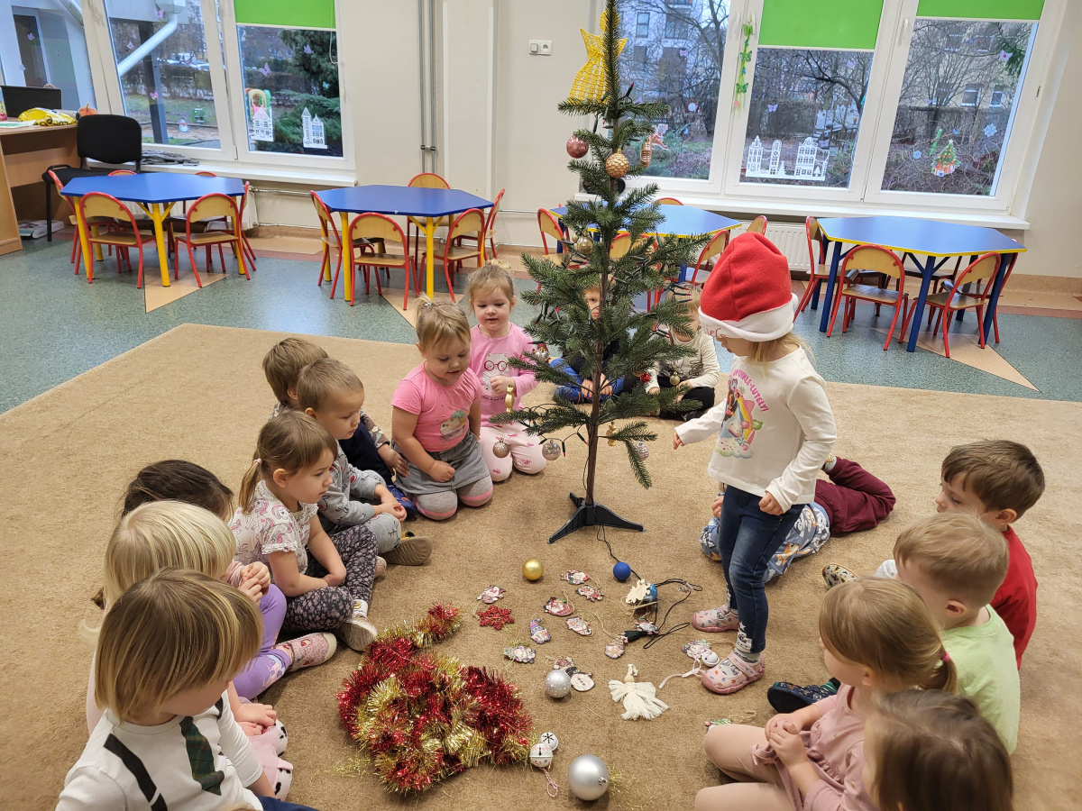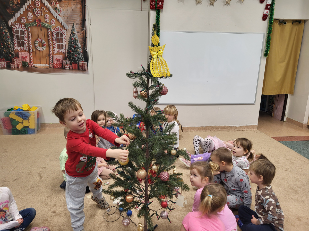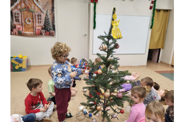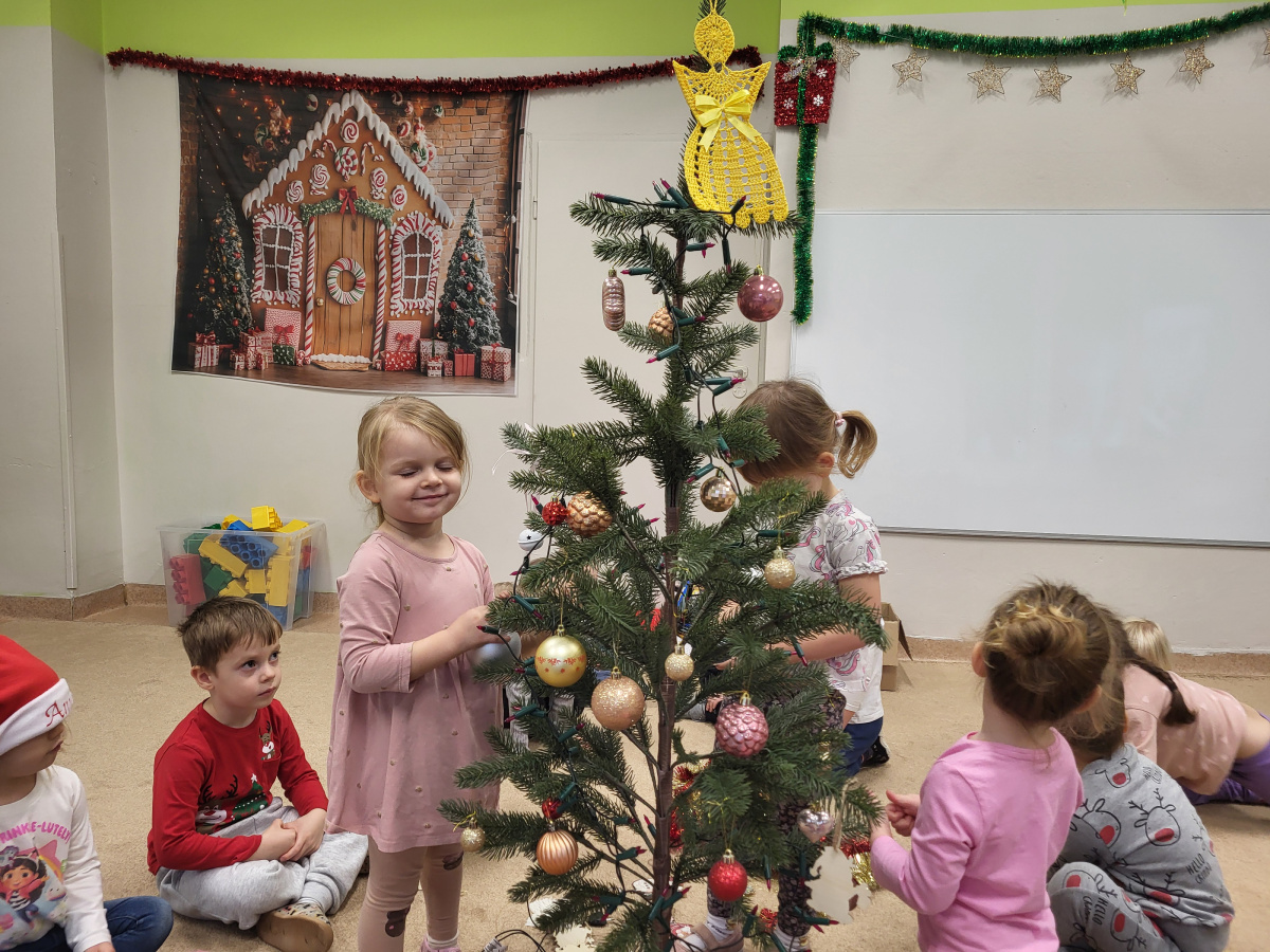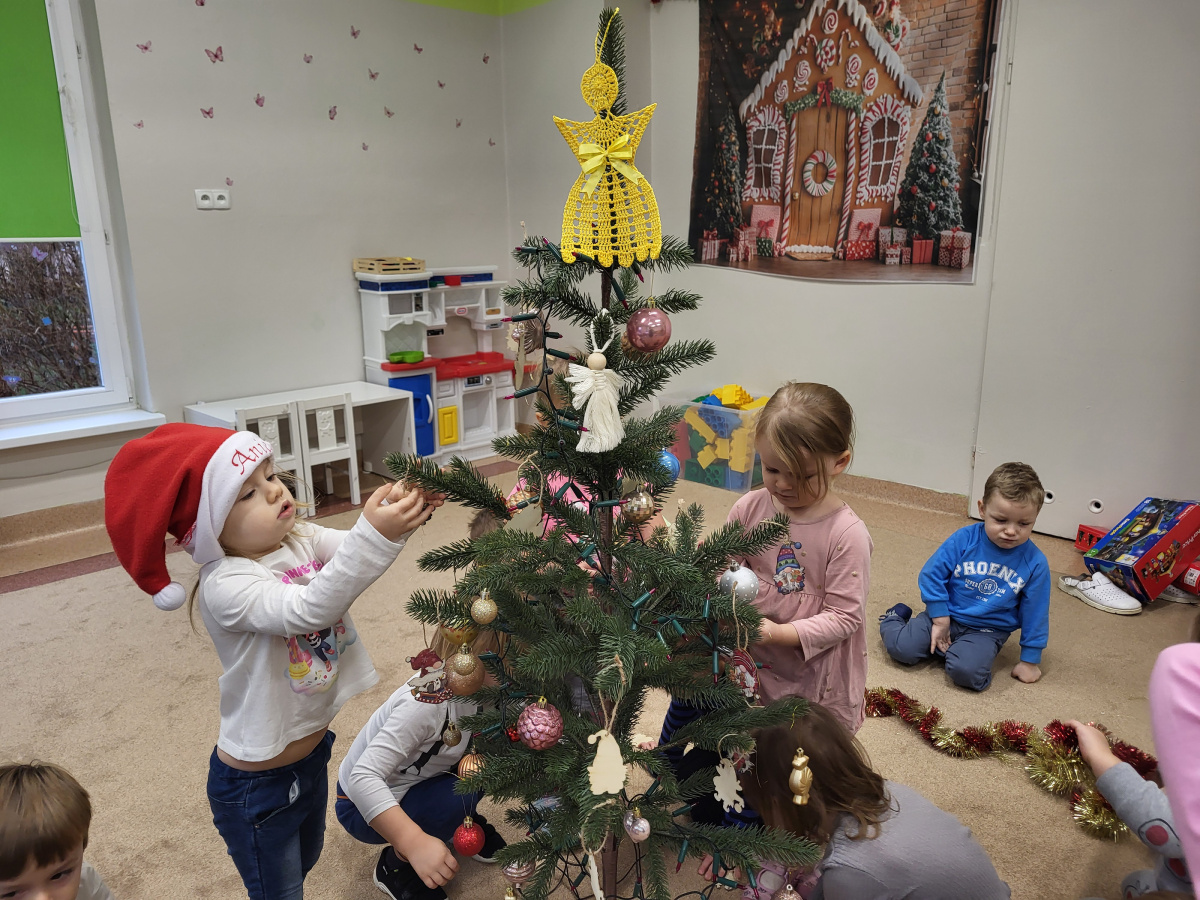 W połowie grudnia dzieci z grupy „Motylki” wspólnie ubierały choinkę w swojej sali przedszkolnej. Podczas tej aktywności poznały tradycje związane z choinką oraz utrwalały słownictwo świąteczne, takie jak bombka, łańcuch czy lampki choinkowe. Wspólne dekorowanie wprowadziło wszystkich w radosny, świąteczny nastrój.