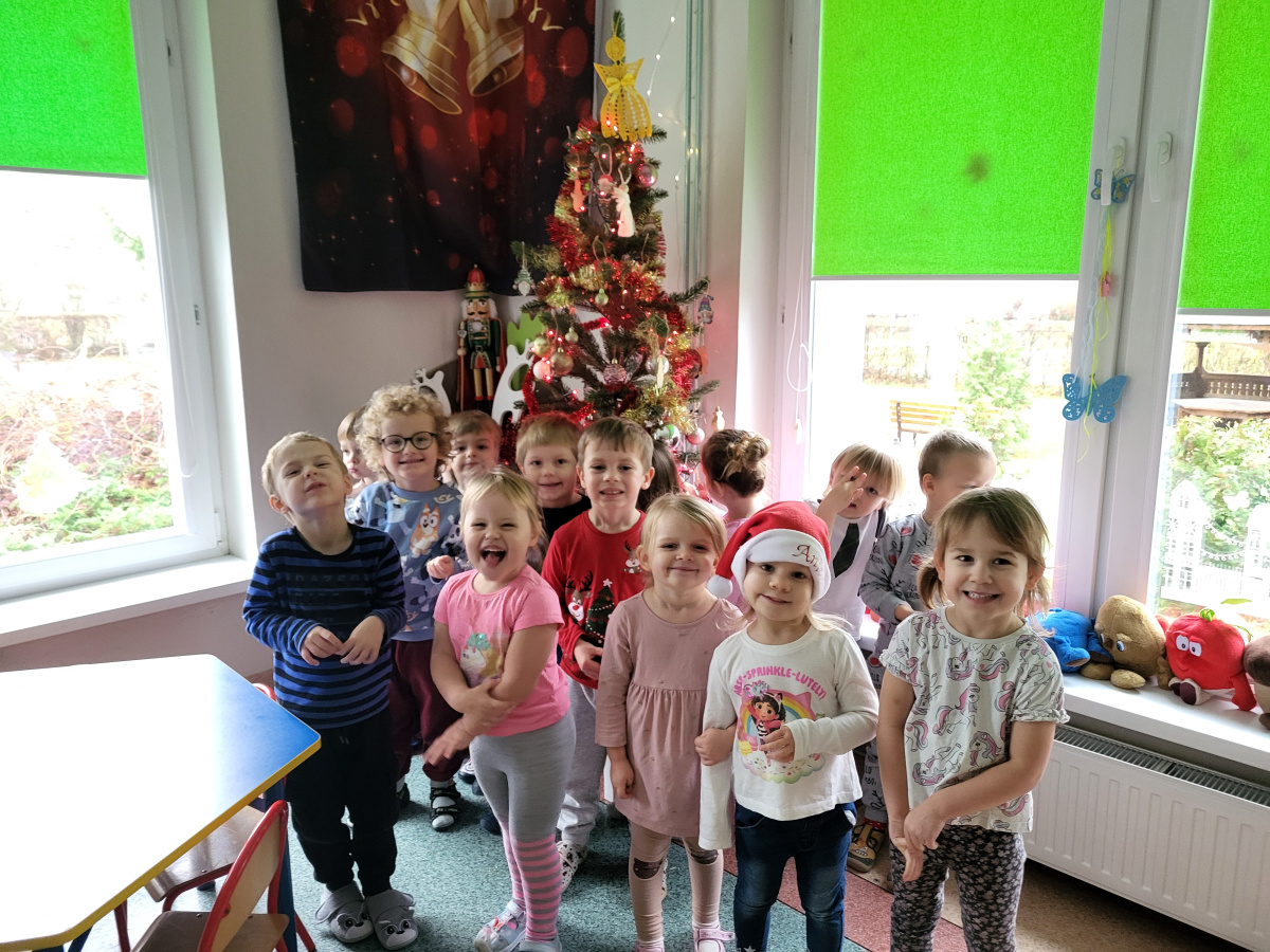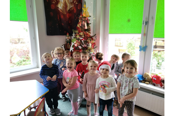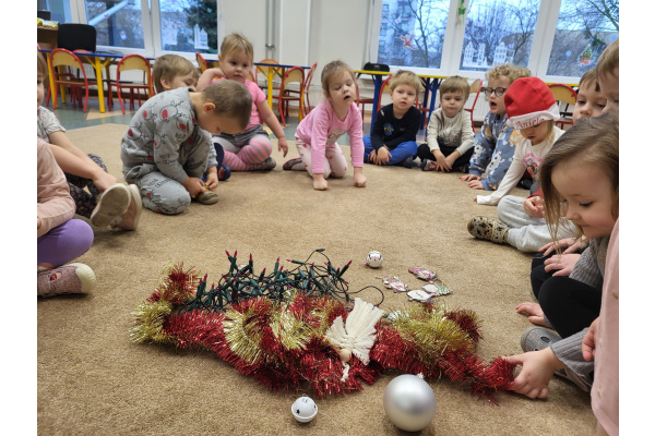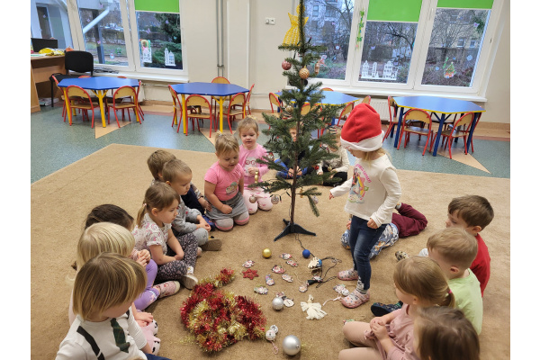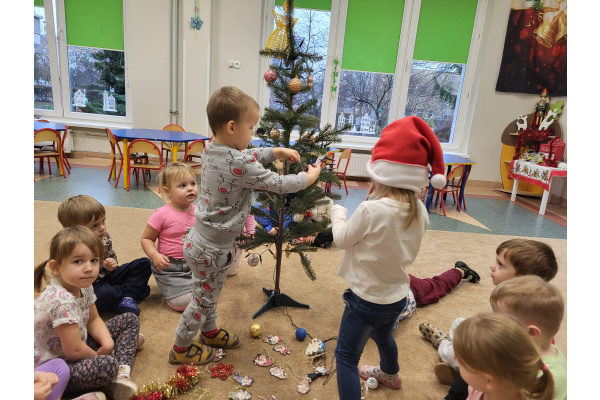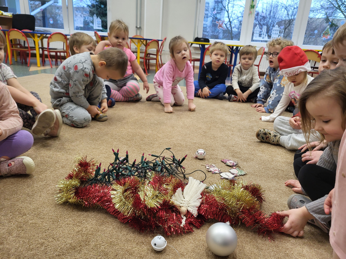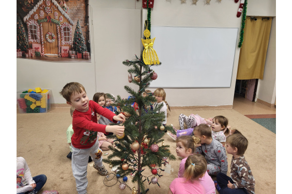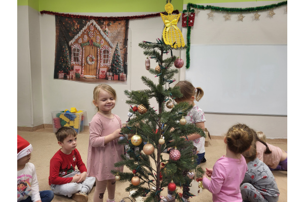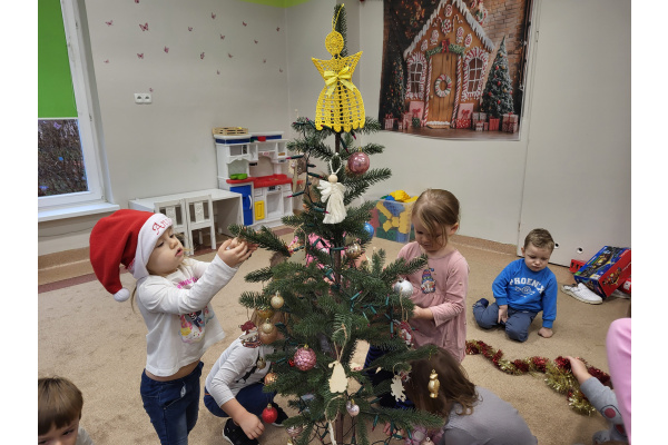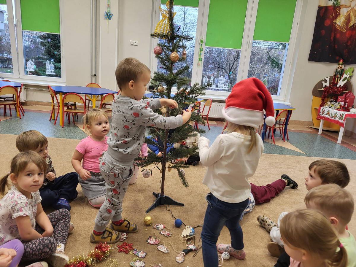 W połowie grudnia dzieci z grupy „Motylki” wspólnie ubierały choinkę w swojej sali przedszkolnej. Podczas tej aktywności poznały tradycje związane z choinką oraz utrwalały słownictwo świąteczne, takie jak bombka, łańcuch czy lampki choinkowe. Wspólne dekorowanie wprowadziło wszystkich w radosny, świąteczny nastrój.