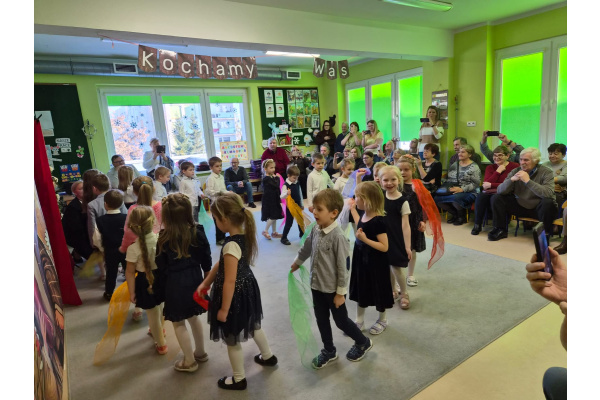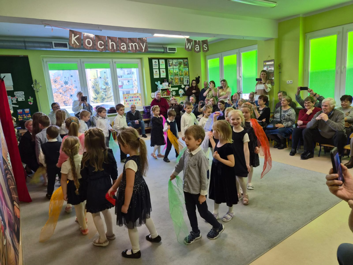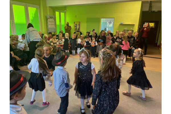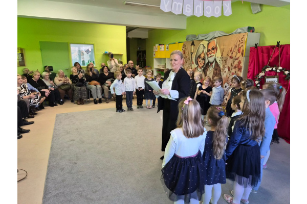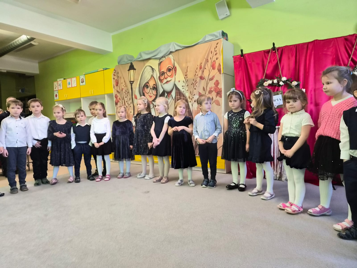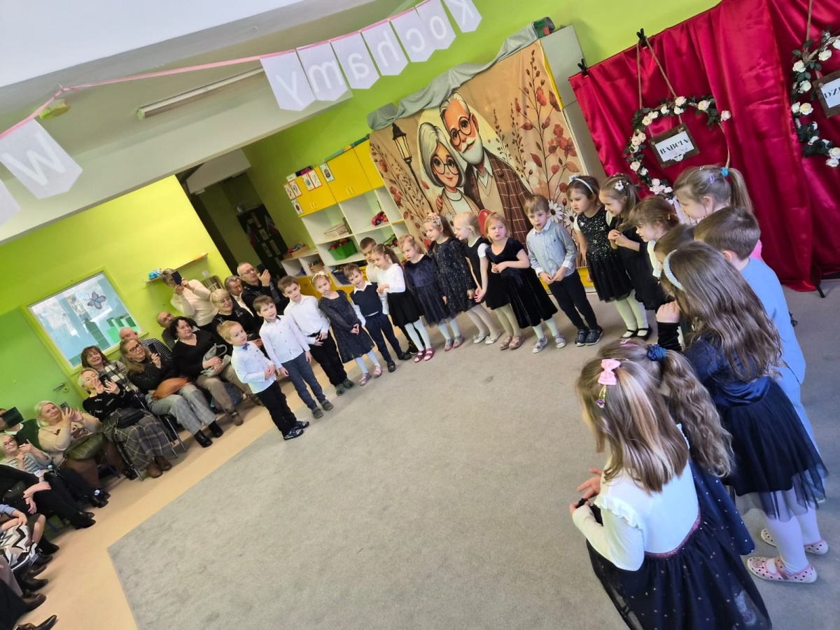 Z okazji święta Babci i Dziadka dzieci z grupy „Myszek” zaprezentowały program artystyczny, recytując wiersze, śpiewając piosenki oraz tańcząc taniec z chustami. Przedszkolaki zagrały również na instrumentach do piosenki „Wesoły dziadek”. Na zakończenie dzieci wręczyły upominki, przytulały się do dziadków i dziękowały im za wspólnie spędzony czas.