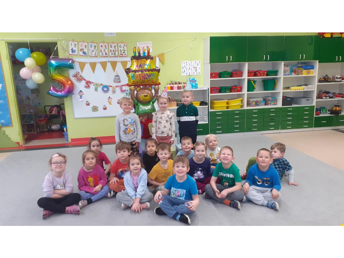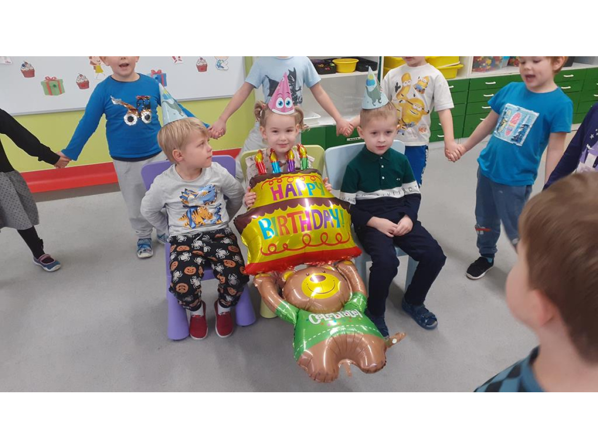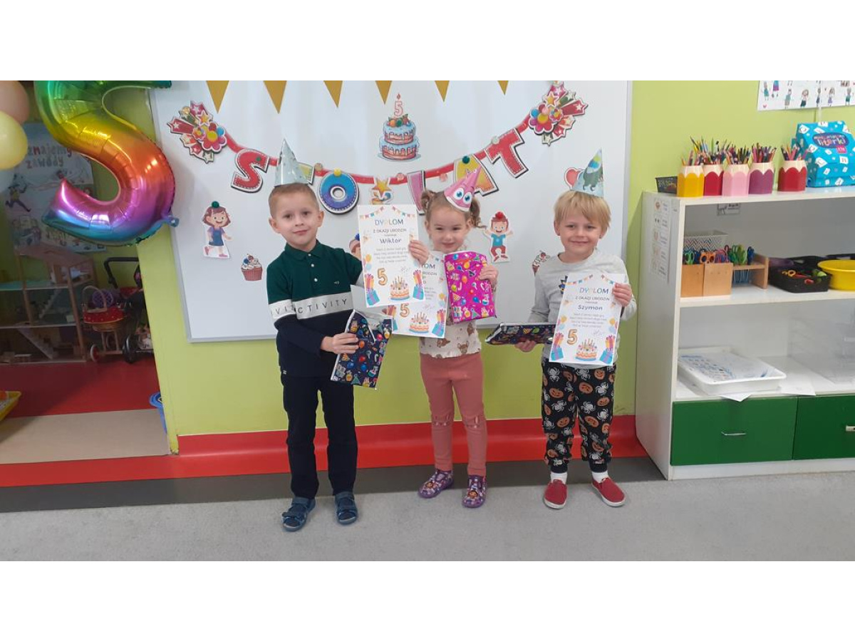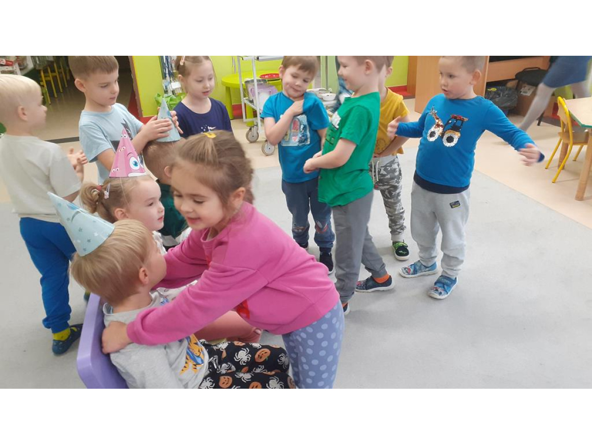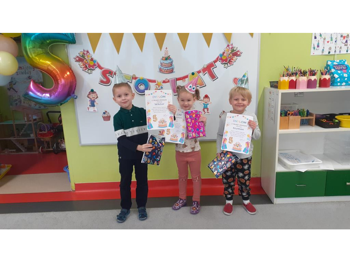 W listopadzie 5 Urodzinki obchodzili Lenka, Szymek i Wiktor. Koleżanki i koledzy składali gratulacje, śpiewali "Sto lat" i układali piękne życzenia. Były uściski, przytulaski i wręczanie upominków. Przedszkolaki zasiadły do uroczystego poczęstunku a piosenki urodzinowe umilały uroczystość.