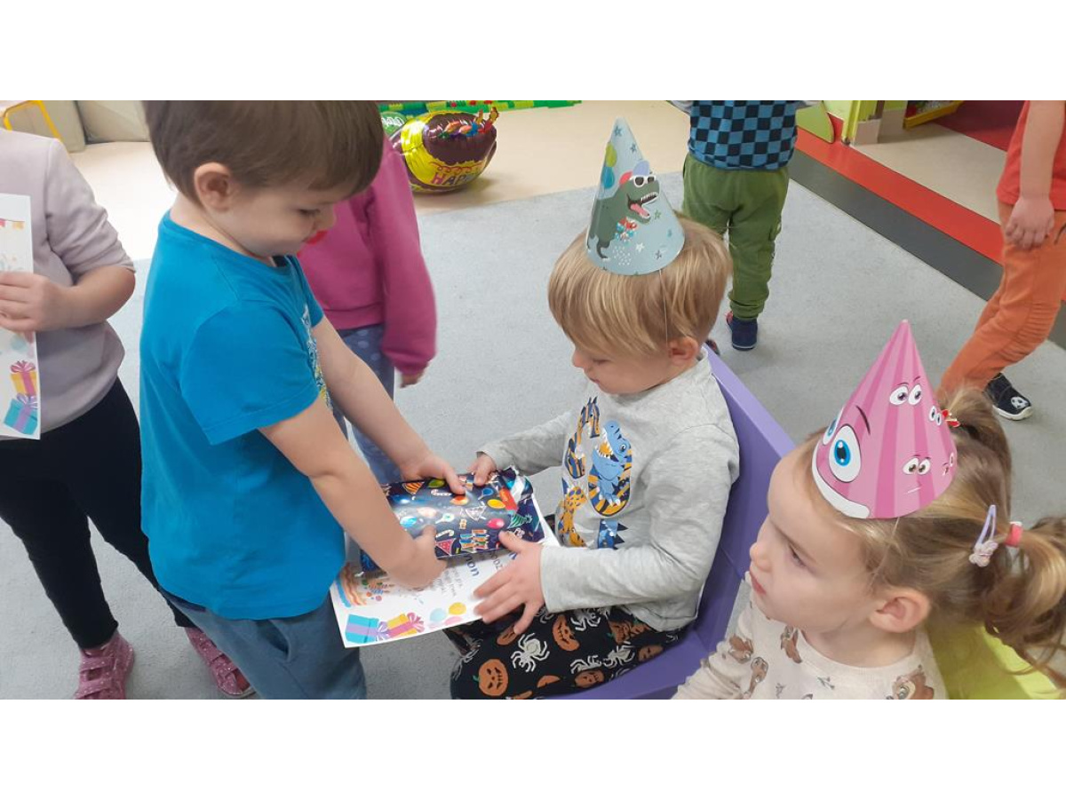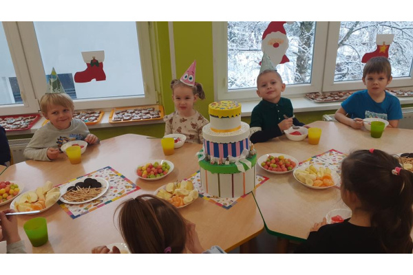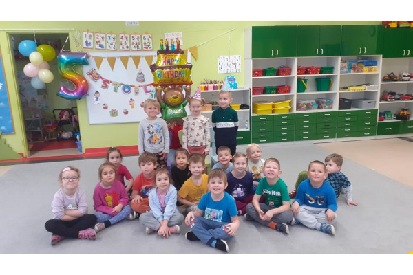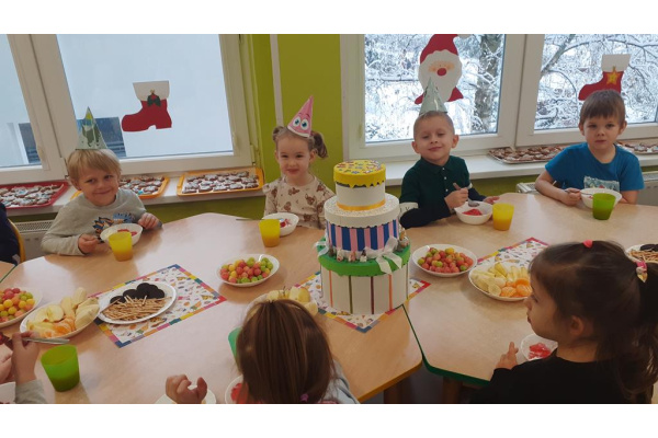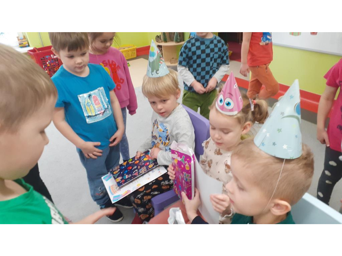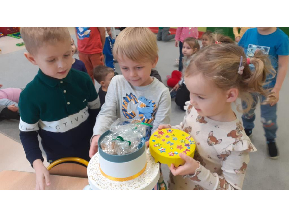 W listopadzie 5 Urodzinki obchodzili Lenka, Szymek i Wiktor. Koleżanki i koledzy składali gratulacje, śpiewali "Sto lat" i układali piękne życzenia. Były uściski, przytulaski i wręczanie upominków. Przedszkolaki zasiadły do uroczystego poczęstunku a piosenki urodzinowe umilały uroczystość.