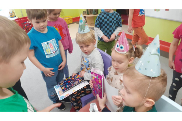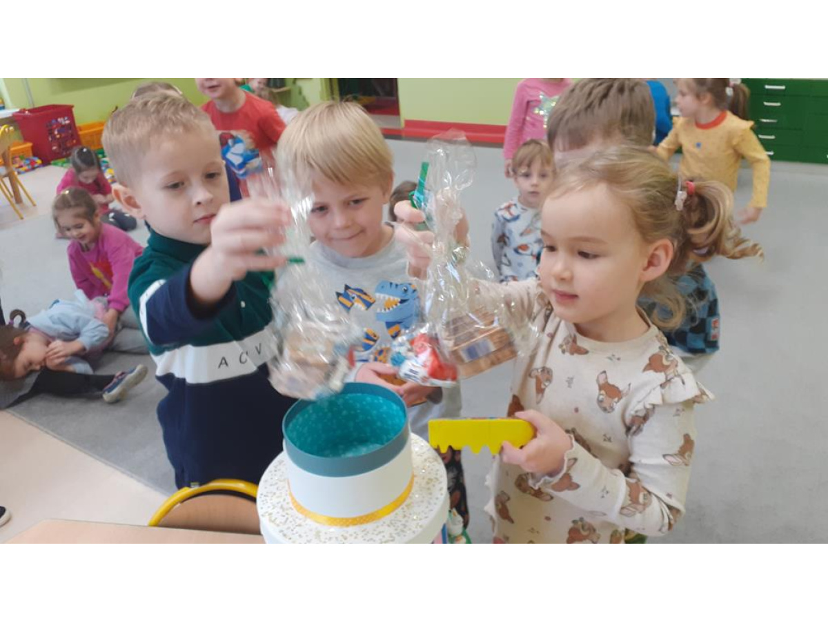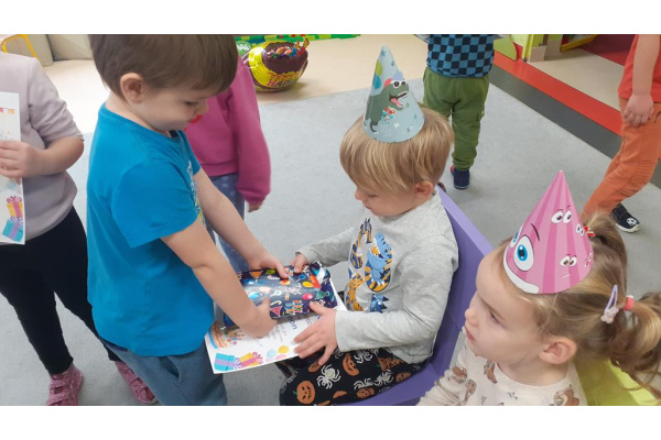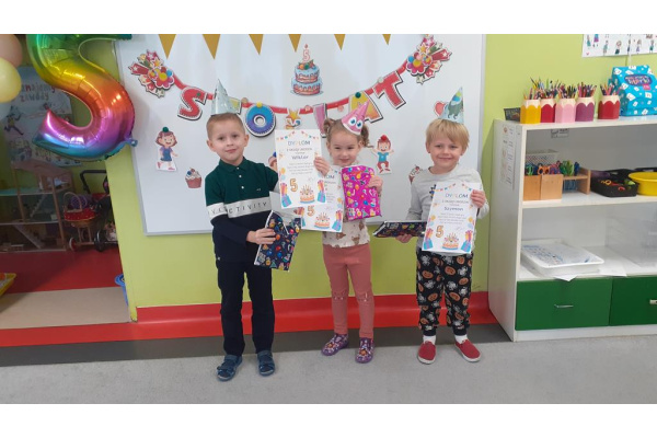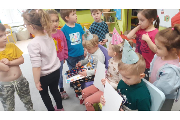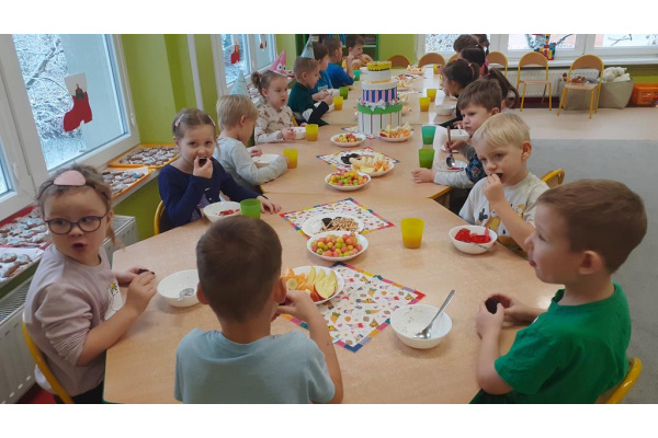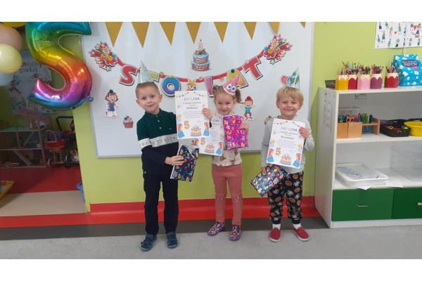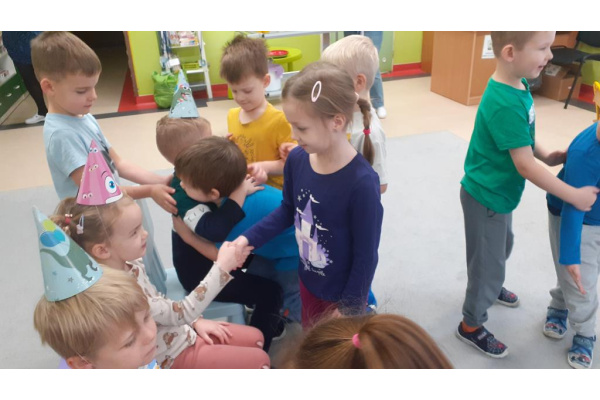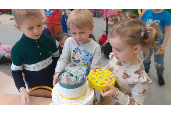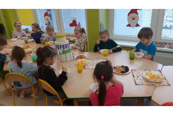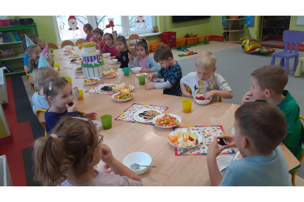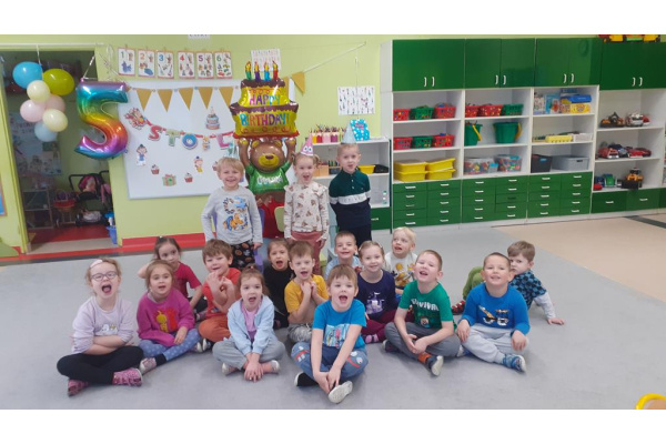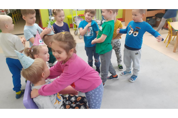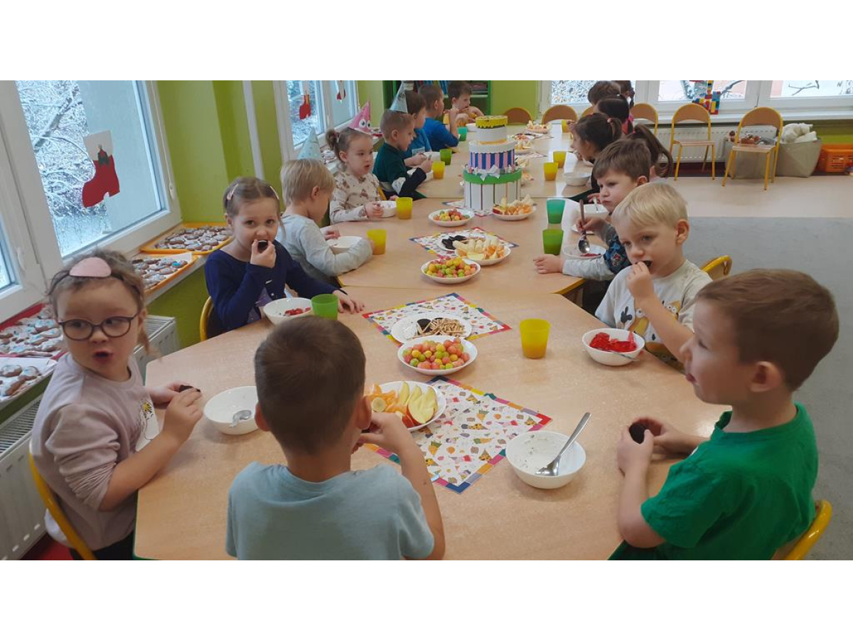 W listopadzie 5 Urodzinki obchodzili Lenka, Szymek i Wiktor. Koleżanki i koledzy składali gratulacje, śpiewali "Sto lat" i układali piękne życzenia. Były uściski, przytulaski i wręczanie upominków. Przedszkolaki zasiadły do uroczystego poczęstunku a piosenki urodzinowe umilały uroczystość.