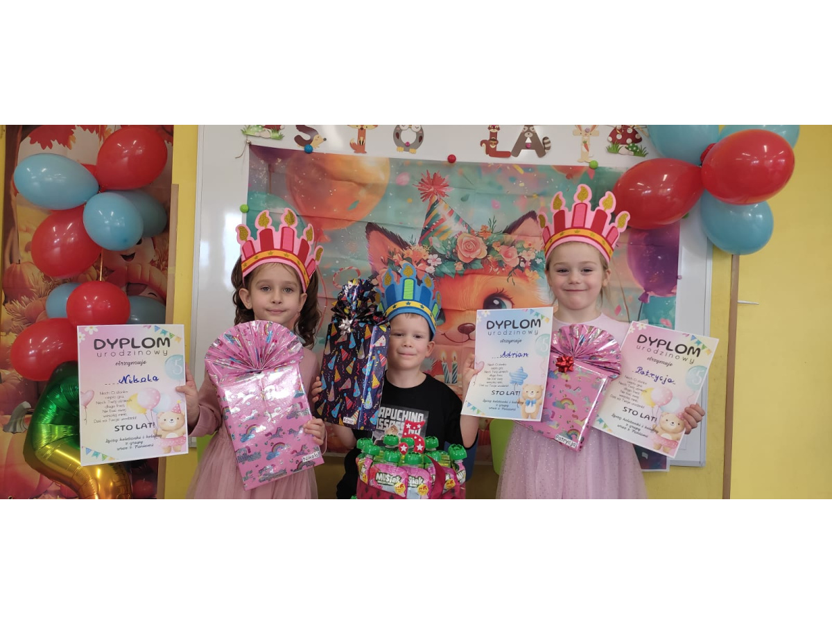 25. marca urodziny w grupie obchodzili: Nikola Patrycja i Adrian. Dzieci z grupy złożyły życzenia, wręczyły upominki i zaśpiewały "Sto lat". Tradycją grupy są wesołe zabawy i tańce. Humor dopisywał całej grupie.