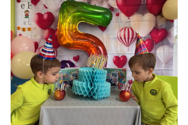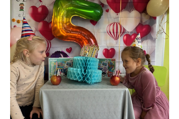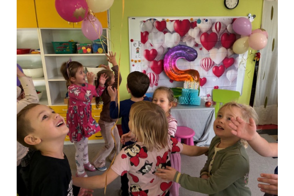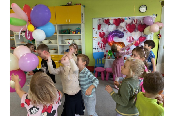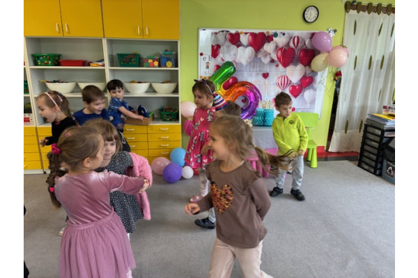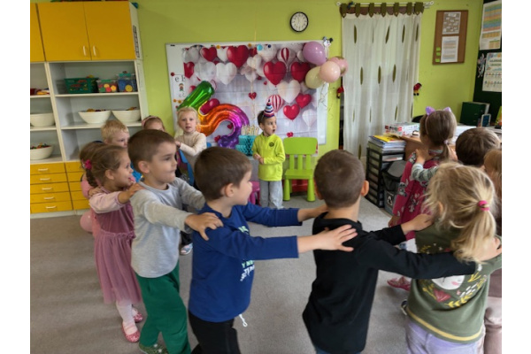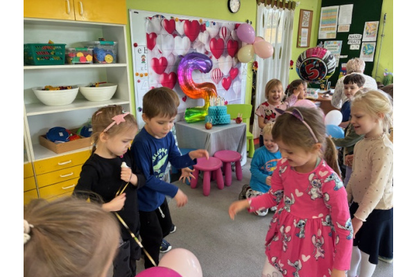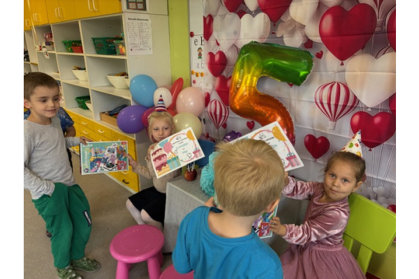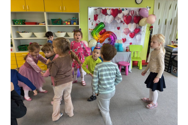 W grupie „Myszki” odbyło się radosne świętowanie piątych urodzin. Dzieci wspólnie bawiły się przy muzyce z ulubionych dziecięcych repertuarów, tańczyły, śpiewały i uczestniczyły w wesołych zabawach ruchowych. W sali panowała wyjątkowo miła i radosna atmosfera. Jubilaci z uśmiechem przyjmowali życzenia od swoich kolegów i koleżanek, a wszyscy razem świętowali ten wyjątkowy dzień.