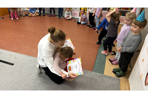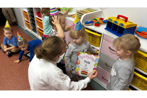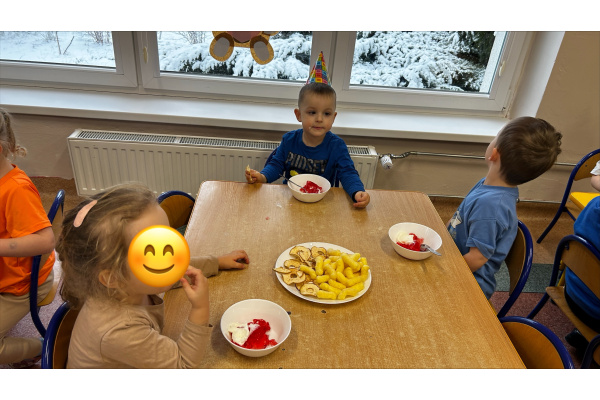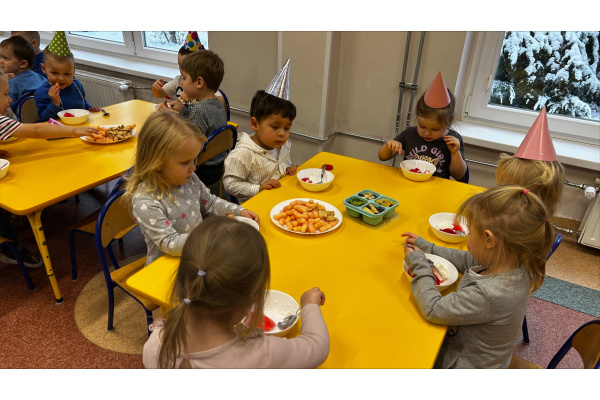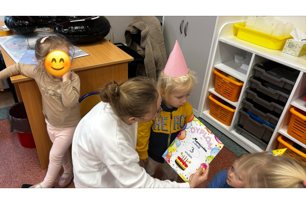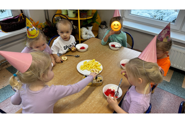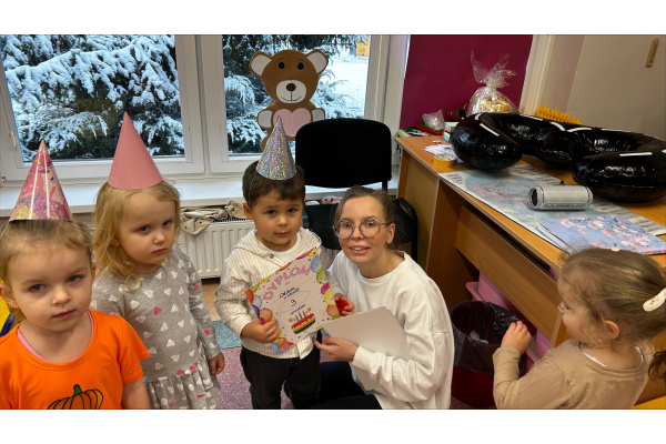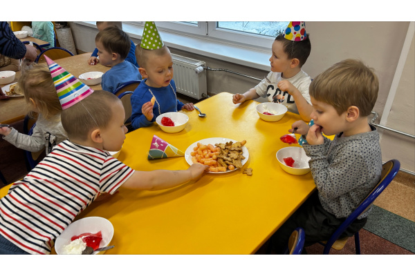 Nasze „Misie” w listopadzie były wyjątkowo urodzinowe, ponieważ aż pięcioro dzieci świętowało swoje urodziny. Z tej okazji wspólnie bawiliśmy się, dzieci otrzymały upominki i dyplomy, a na stole nie zabrakło smakołyków, przekąsek oraz galaretki z bitą śmietaną.
