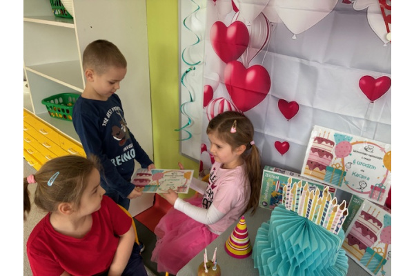 Wszyscy Jubilaci otrzymali pamiątkowe dyplomy oraz drobne upominki. Nie zabrakło także tradycyjnego, głośno i radośnie odśpiewanego „Sto lat”, które wywołało wiele wzruszeń i uśmiechów na twarzach dzieci. Po części oficjalnej rozpoczęła się wspaniała zabawa przy ulubionych piosenkach z repertuaru dziecięcego. Dzieci tańczyły, śmiały się i wspólnie cieszyły tym wyjątkowym dniem.