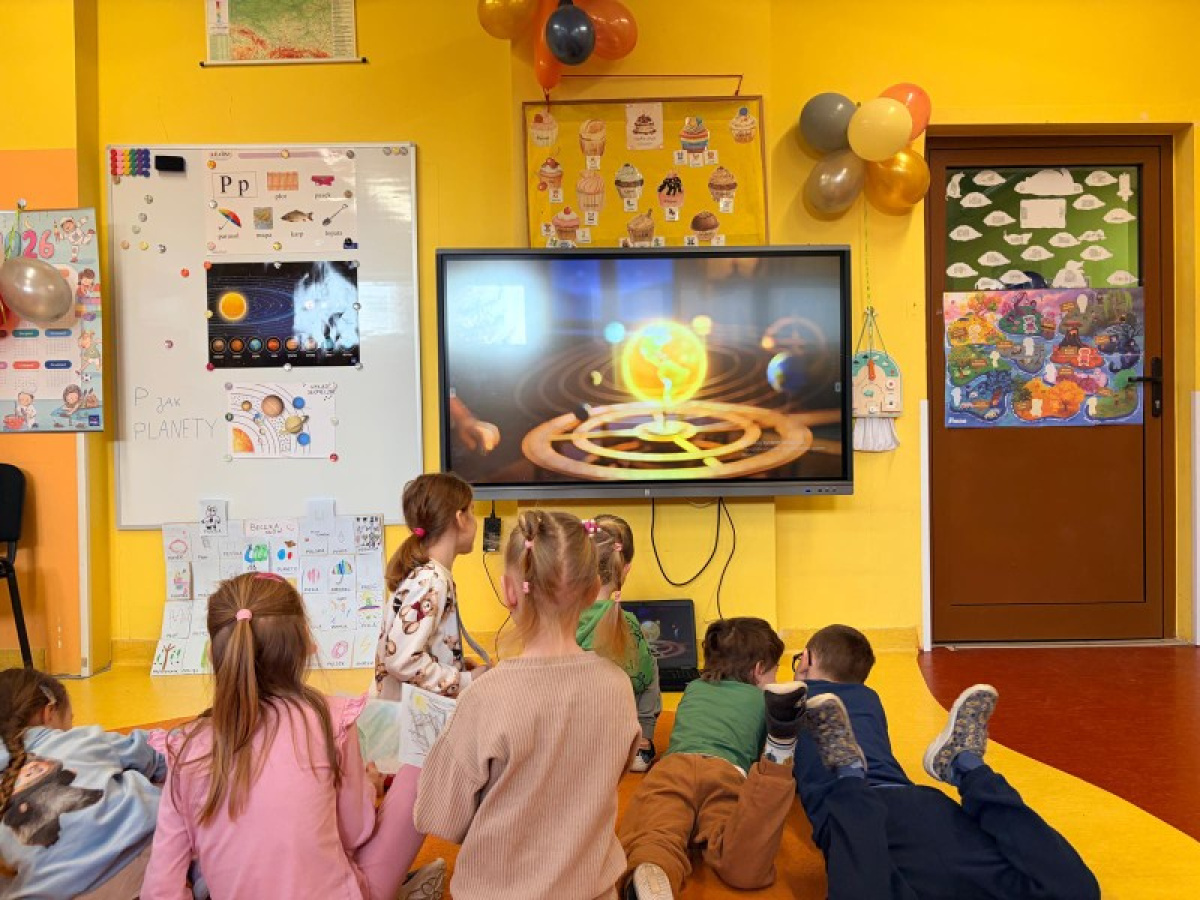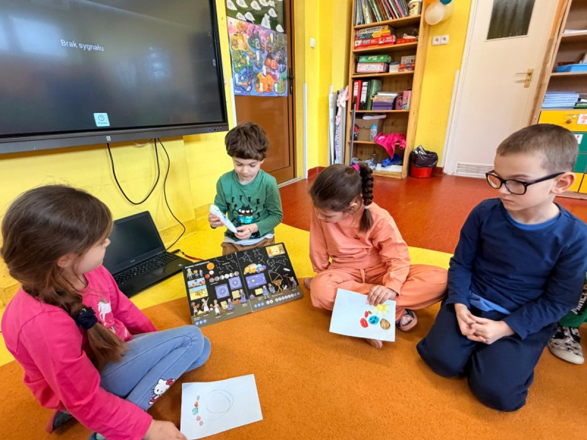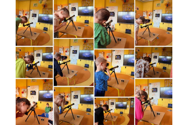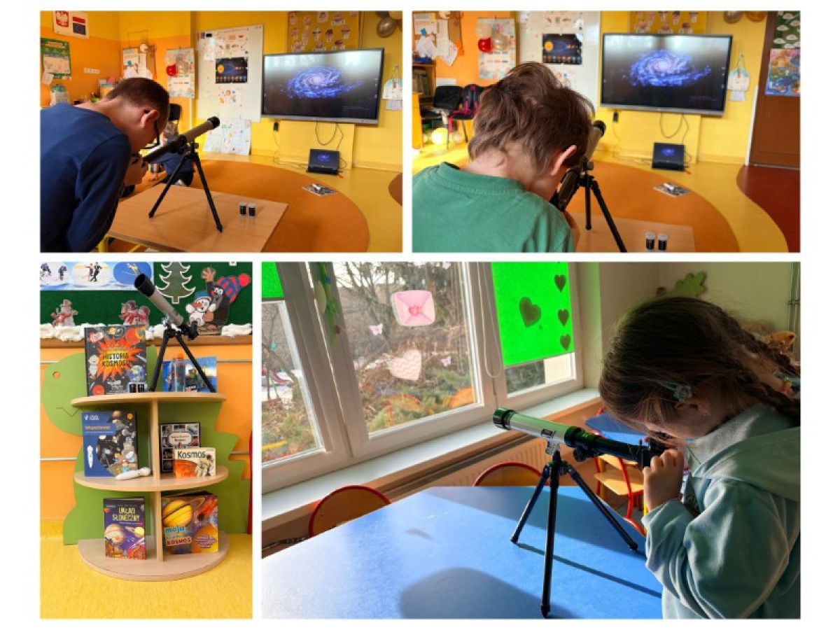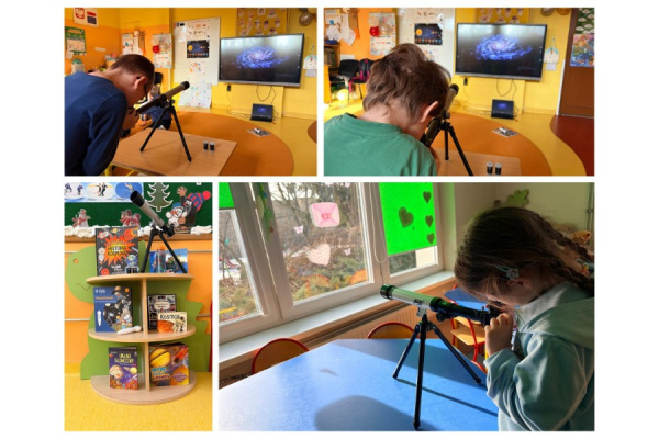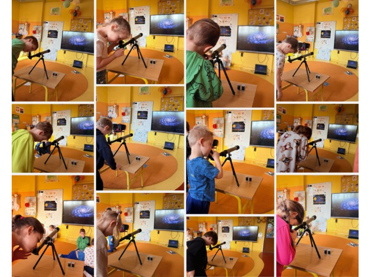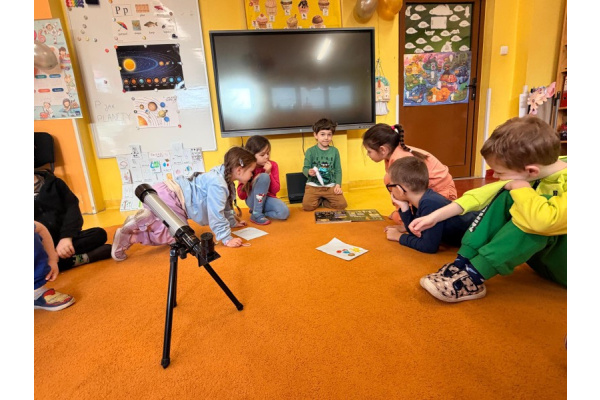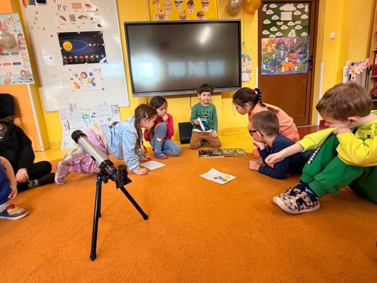 W minionym tygodniu Kreciki poznawały tajemnice, jakie skrywa kosmos. Dzięki zaangażowaniu dzieci udało się nam stworzyć w sali kącik poświęcony układowi słonecznemu. Dzieci utrwalały nazewnictwo planet, dowiedziały się, gdzie znajduje się pas asteroid, czym jest kometa oraz meteor. Dodatkowo zapoznaliśmy się z postacią Mikołaja Kopernika. Kreciki wiedzą już, że to właśnie on wstrzymał słońce i ruszył Ziemię. Największym wyzwaniem była obserwacja naszej galaktyki oraz naszego placu zbaw za pomocą lunety.
