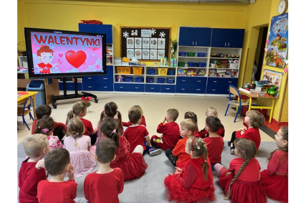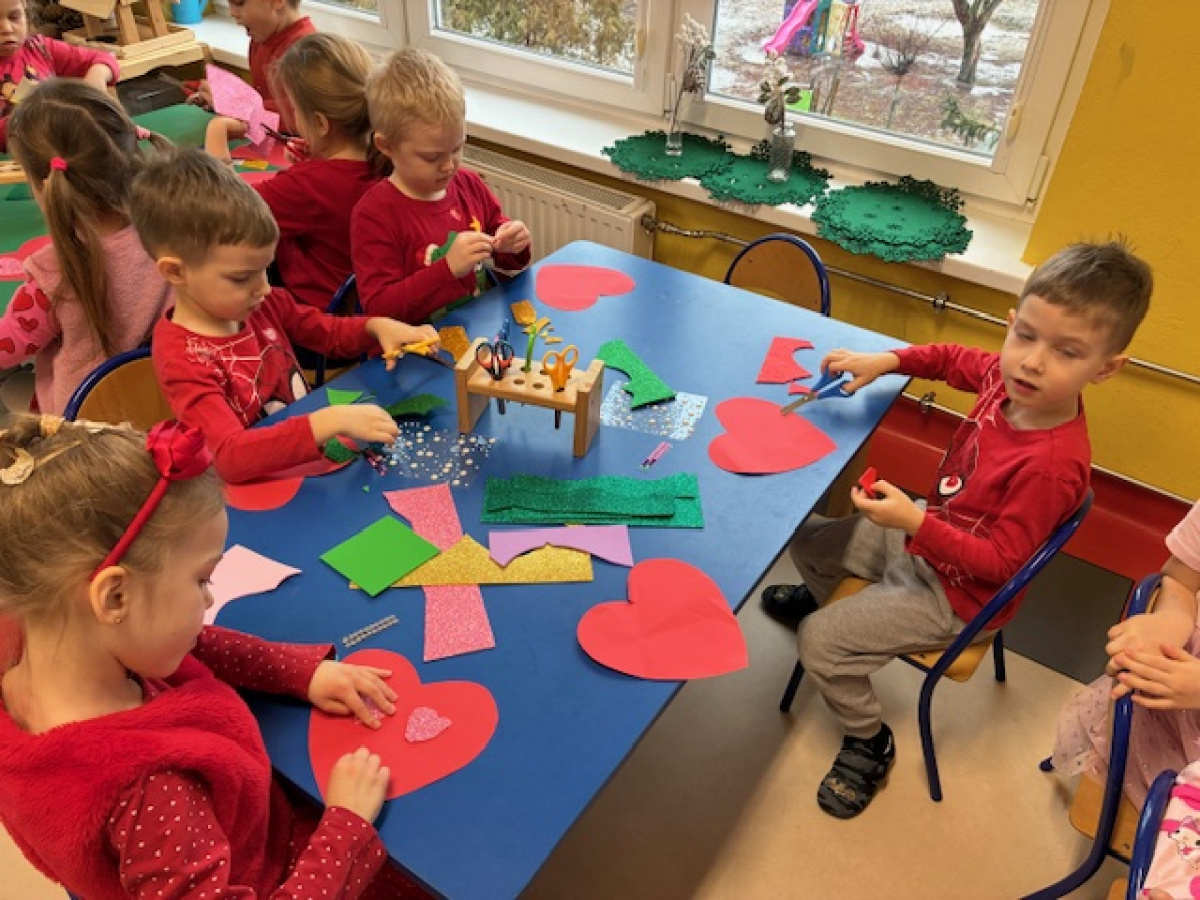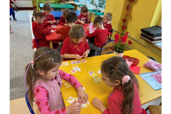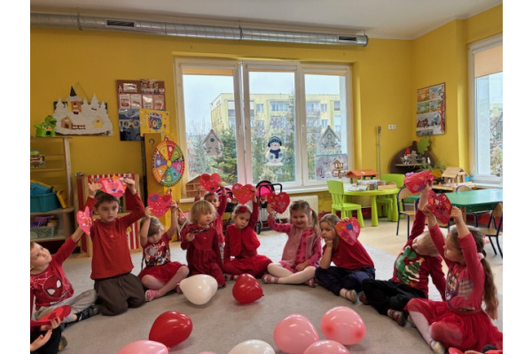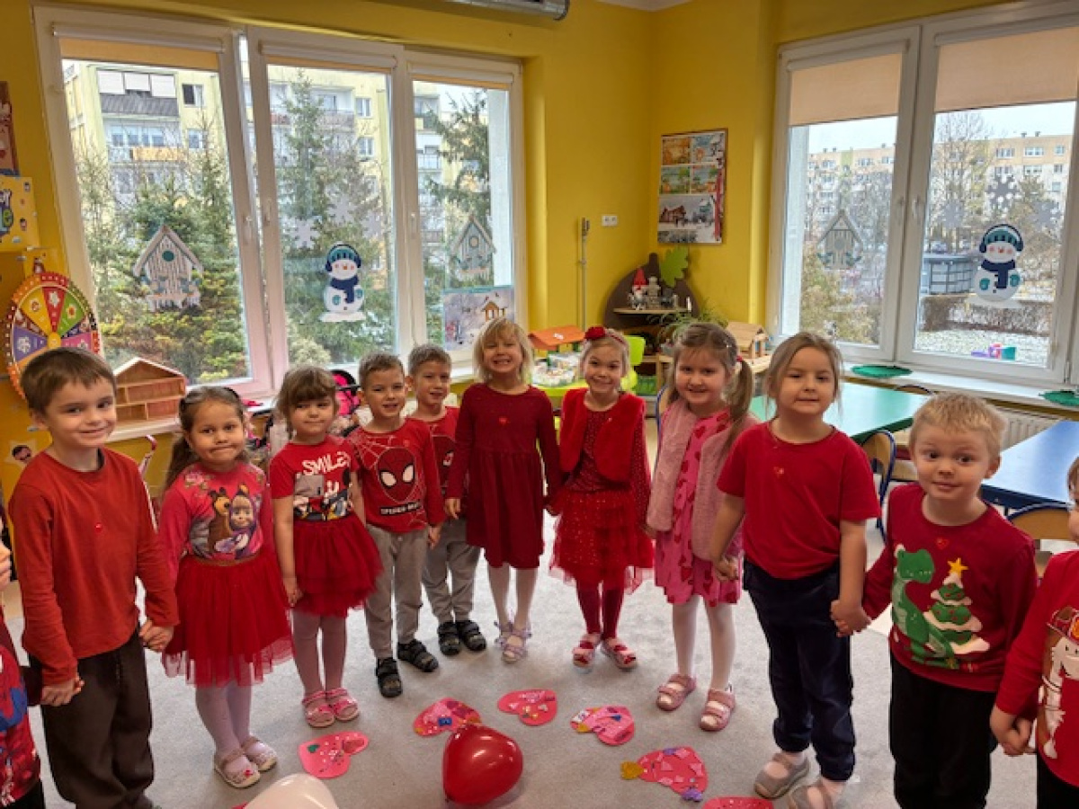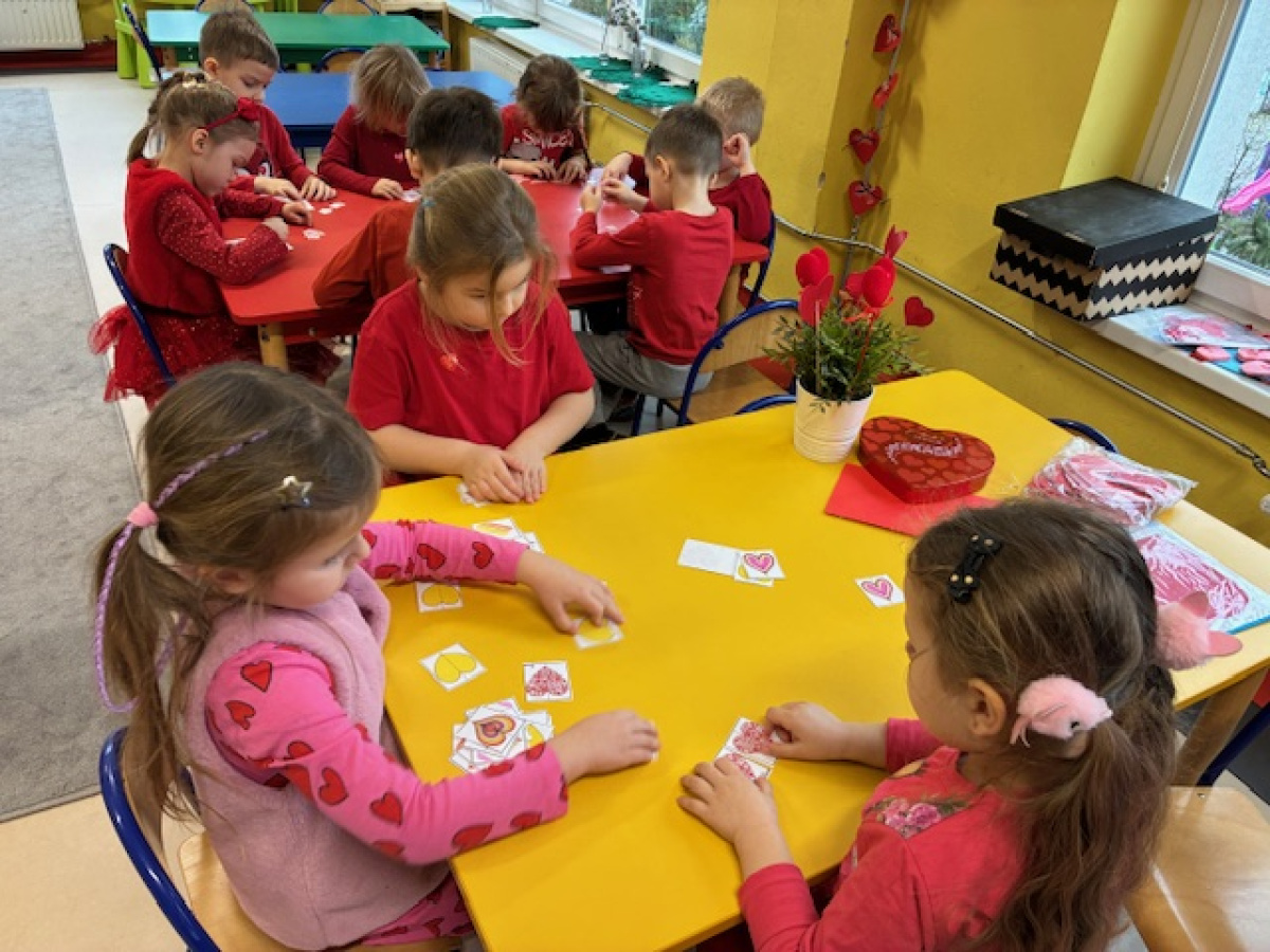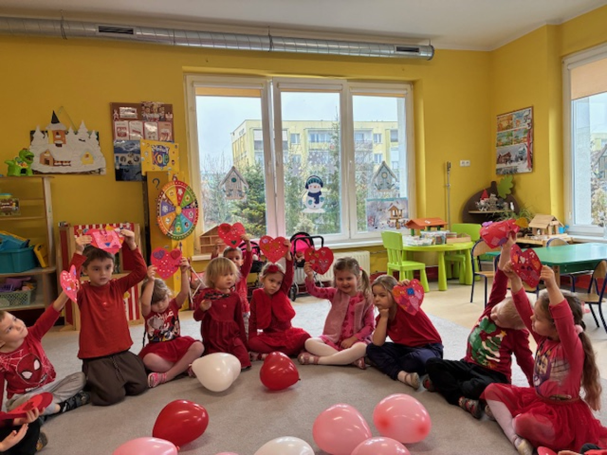 Dzieci obchodziły Walentynki w radosnej i serdecznej atmosferze. Na początku obejrzały film edukacyjny przybliżający tradycję Walentynek oraz znaczenie okazywania sympatii i życzliwości innym.Następnie dzieci samodzielnie przygotowywały kartki walentynkowe dla siebie, po czym wymieniały się nimi i wręczały je kolegom oraz koleżankom z grupy.W dalszej części dnia układały memory, kodowały serduszka oraz uczestniczyły w zabawach ruchowych z balonami i wspólnych zabawach w kole.Wszystkie aktywności sprawiły dzieciom wiele radości, a dzień upłynął w miłej, pełnej uśmiechu atmosferze.