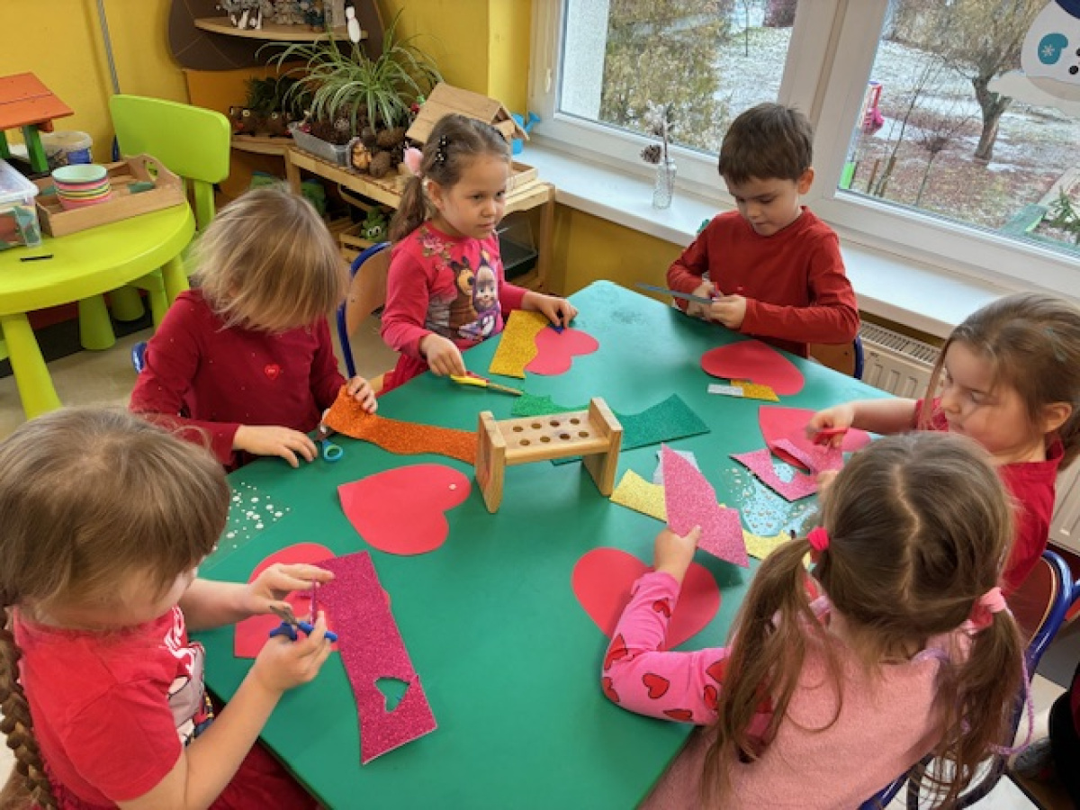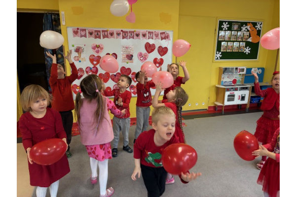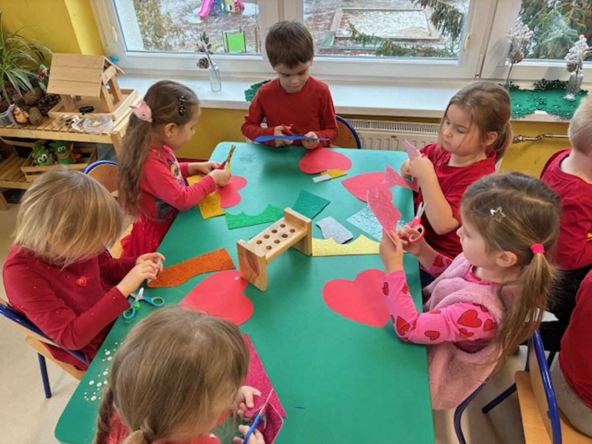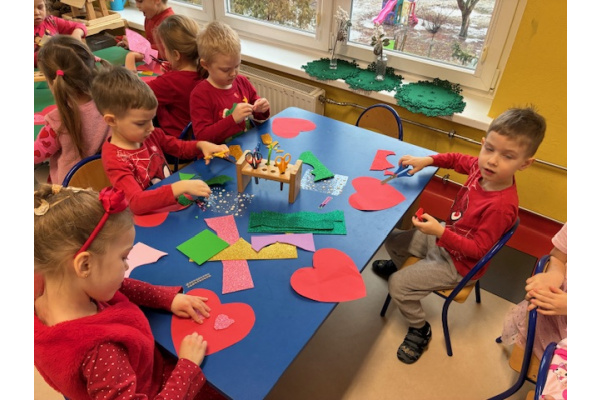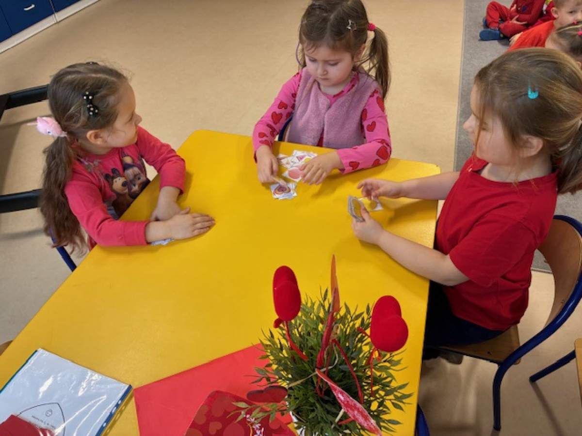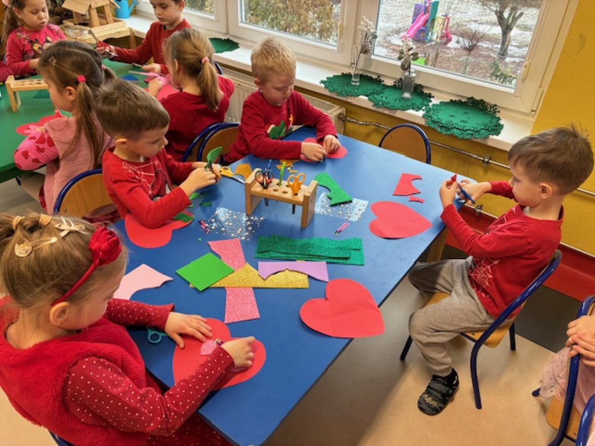 Dzieci obchodziły Walentynki w radosnej i serdecznej atmosferze. Na początku obejrzały film edukacyjny przybliżający tradycję Walentynek oraz znaczenie okazywania sympatii i życzliwości innym.Następnie dzieci samodzielnie przygotowywały kartki walentynkowe dla siebie, po czym wymieniały się nimi i wręczały je kolegom oraz koleżankom z grupy.W dalszej części dnia układały memory, kodowały serduszka oraz uczestniczyły w zabawach ruchowych z balonami i wspólnych zabawach w kole.Wszystkie aktywności sprawiły dzieciom wiele radości, a dzień upłynął w miłej, pełnej uśmiechu atmosferze.