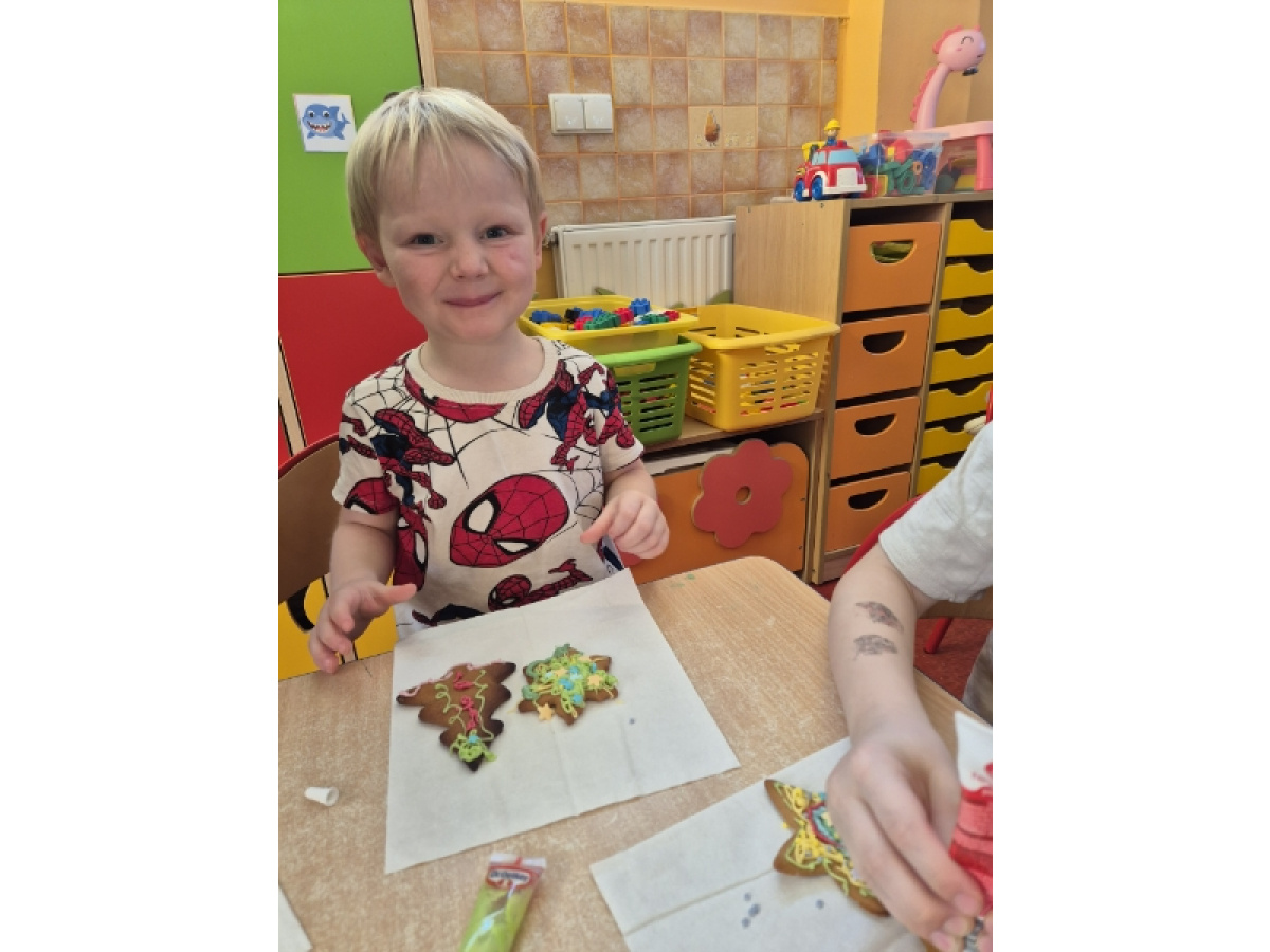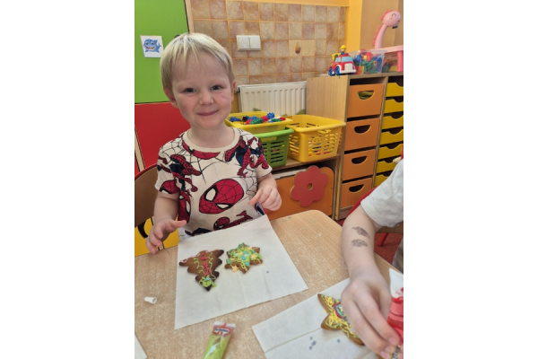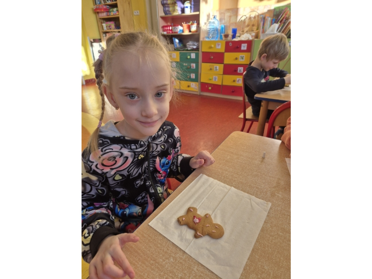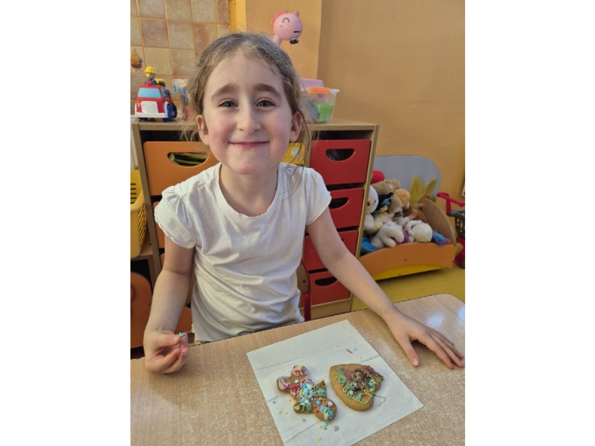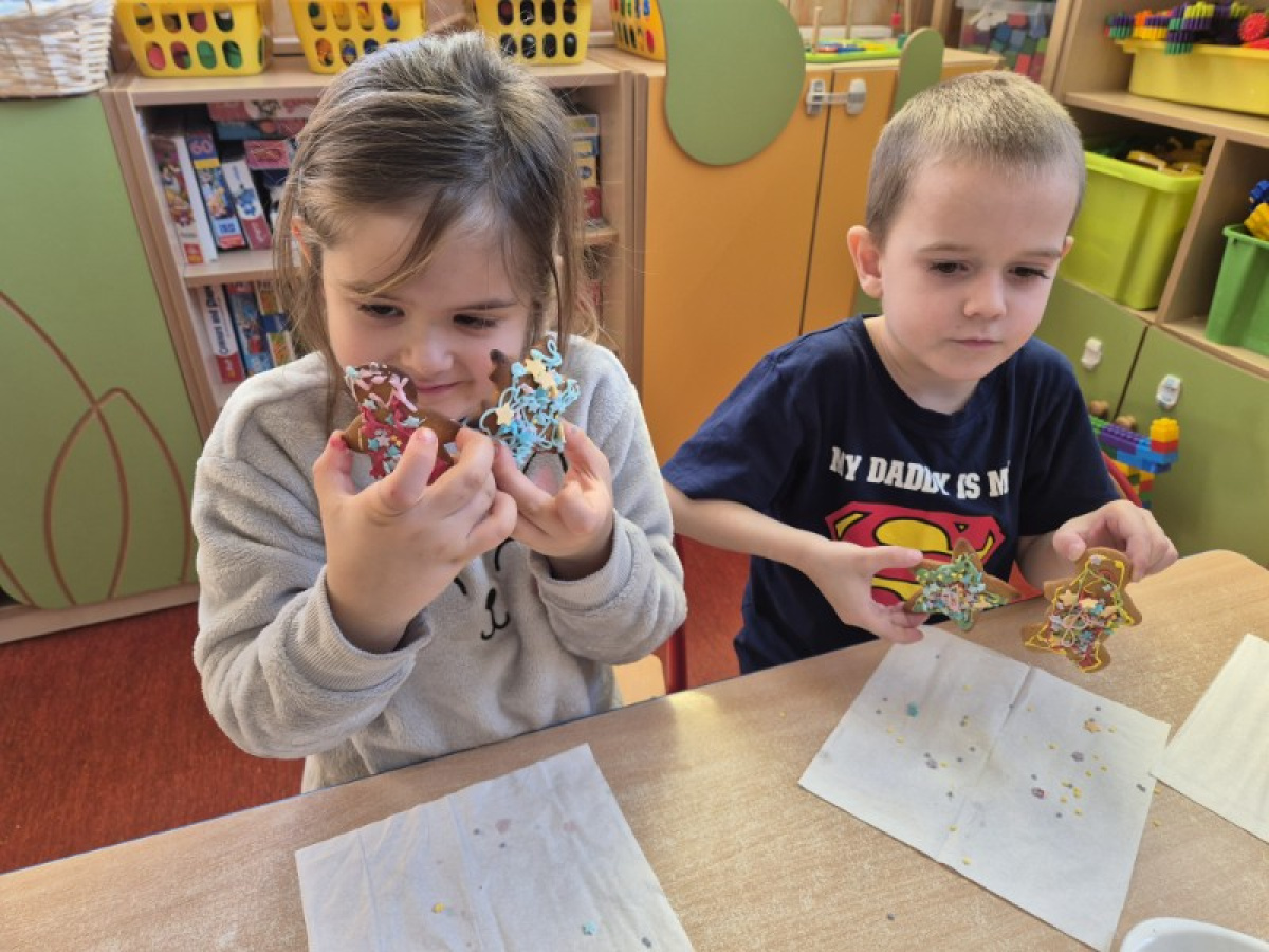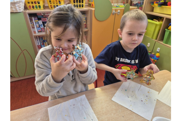 W piątek 19 grudnia grupa Krecików wzięła udział w wyjątkowych warsztatach piernikowych, które wprowadziły dzieci w radosny, świąteczny nastrój. Podczas zajęć przedszkolaki z wielkim zaangażowaniem dekorowały pierniki, rozwijając swoją kreatywność, zdolności manualne oraz ucząc się współpracy. Kolorowe lukry, posypki i aromat korzennych przypraw sprawiły, że w sali panowała ciepła i magiczna atmosfera. Warsztaty były nie tylko doskonałą okazją do wspólnej zabawy, ale także do budowania pozytywnych relacji i przeżywania radosnych chwil, które na długo pozostaną w pamięci dzieci.