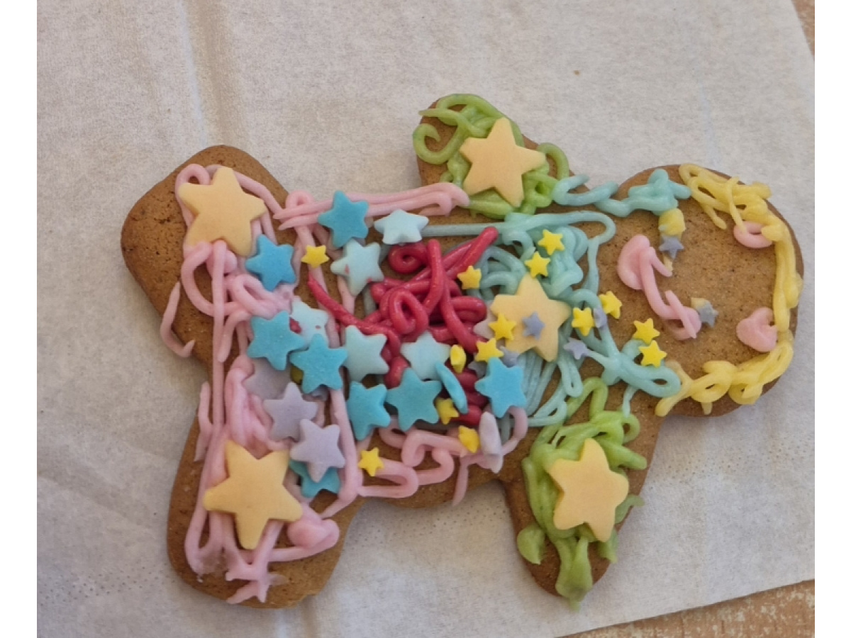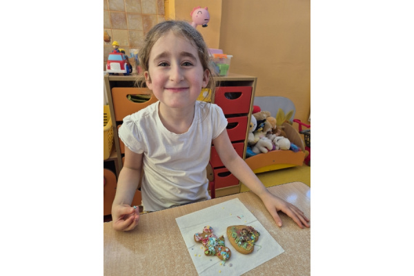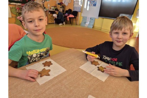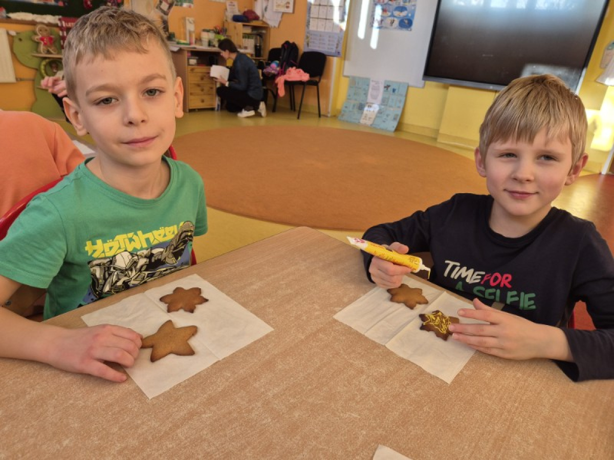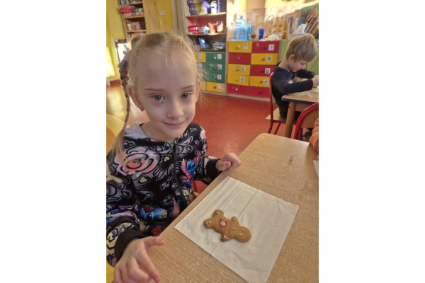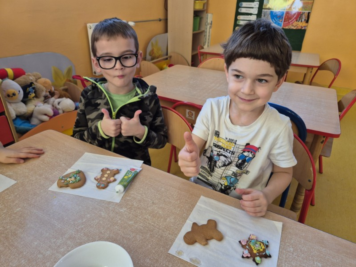 W piątek 19 grudnia grupa Krecików wzięła udział w wyjątkowych warsztatach piernikowych, które wprowadziły dzieci w radosny, świąteczny nastrój. Podczas zajęć przedszkolaki z wielkim zaangażowaniem dekorowały pierniki, rozwijając swoją kreatywność, zdolności manualne oraz ucząc się współpracy. Kolorowe lukry, posypki i aromat korzennych przypraw sprawiły, że w sali panowała ciepła i magiczna atmosfera. Warsztaty były nie tylko doskonałą okazją do wspólnej zabawy, ale także do budowania pozytywnych relacji i przeżywania radosnych chwil, które na długo pozostaną w pamięci dzieci.
