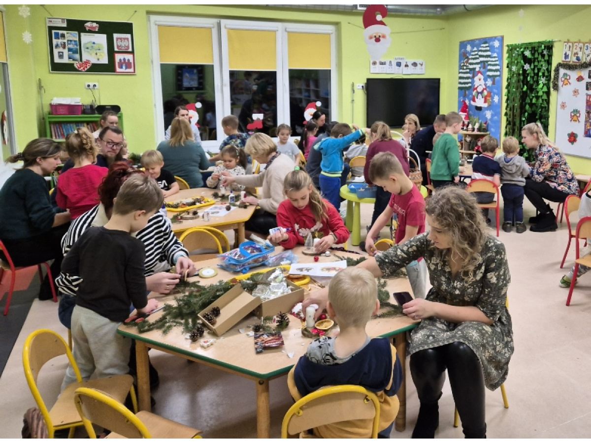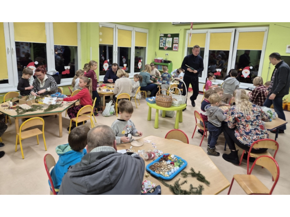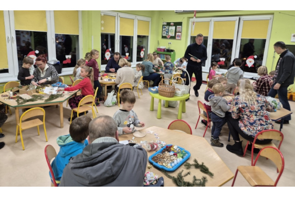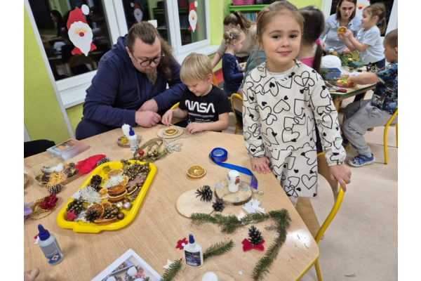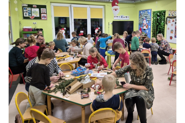 27 listopada spotkaliśmy się z rodzicami w naszej sali 'Zajączków', aby przygotować dekoracje świąteczne na kiermasz przedszkolny. Wszyscy razem zasiedliśmy do pracy, a efektem są piękne stroiki. Dziękujemy za zaangażowanie i obecność, to te chwile spędzone razem są bezcenne.