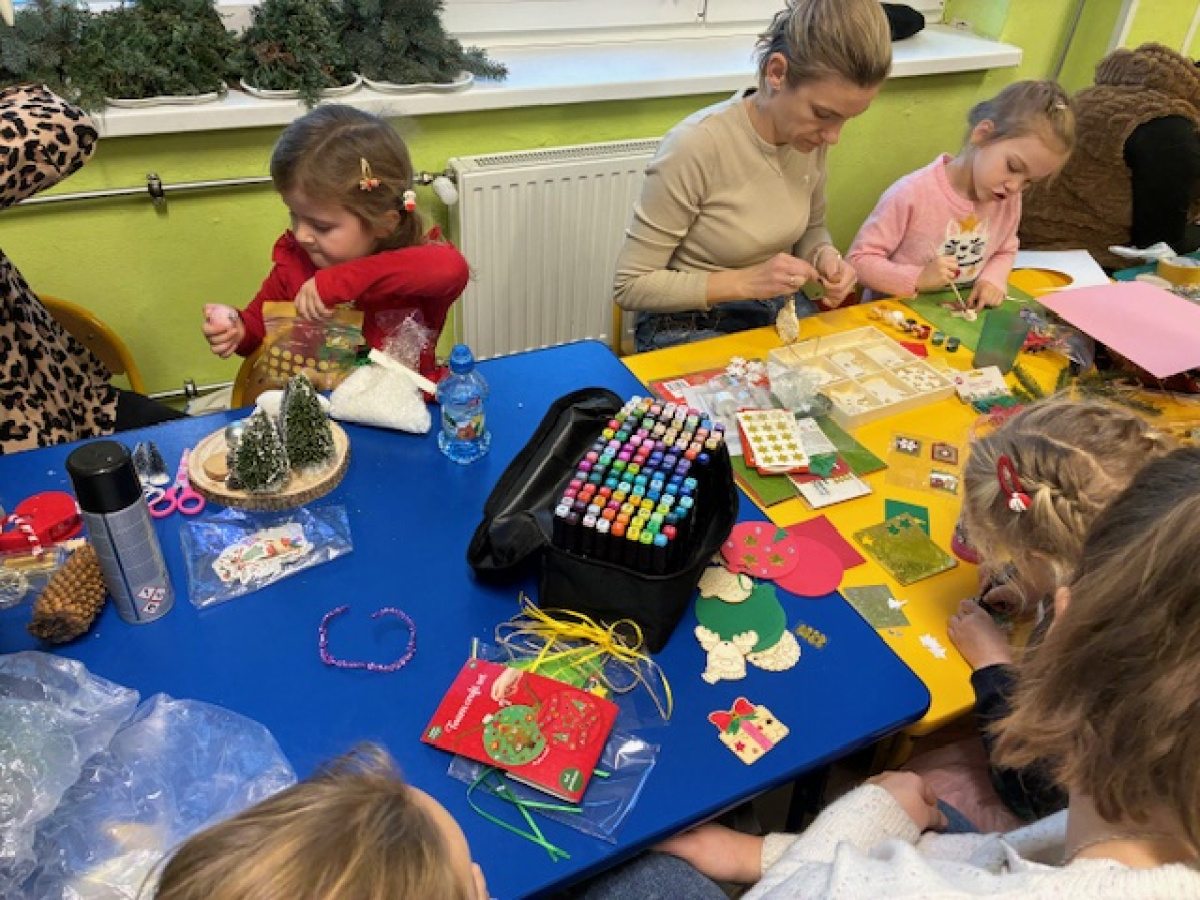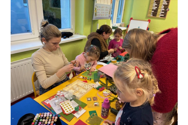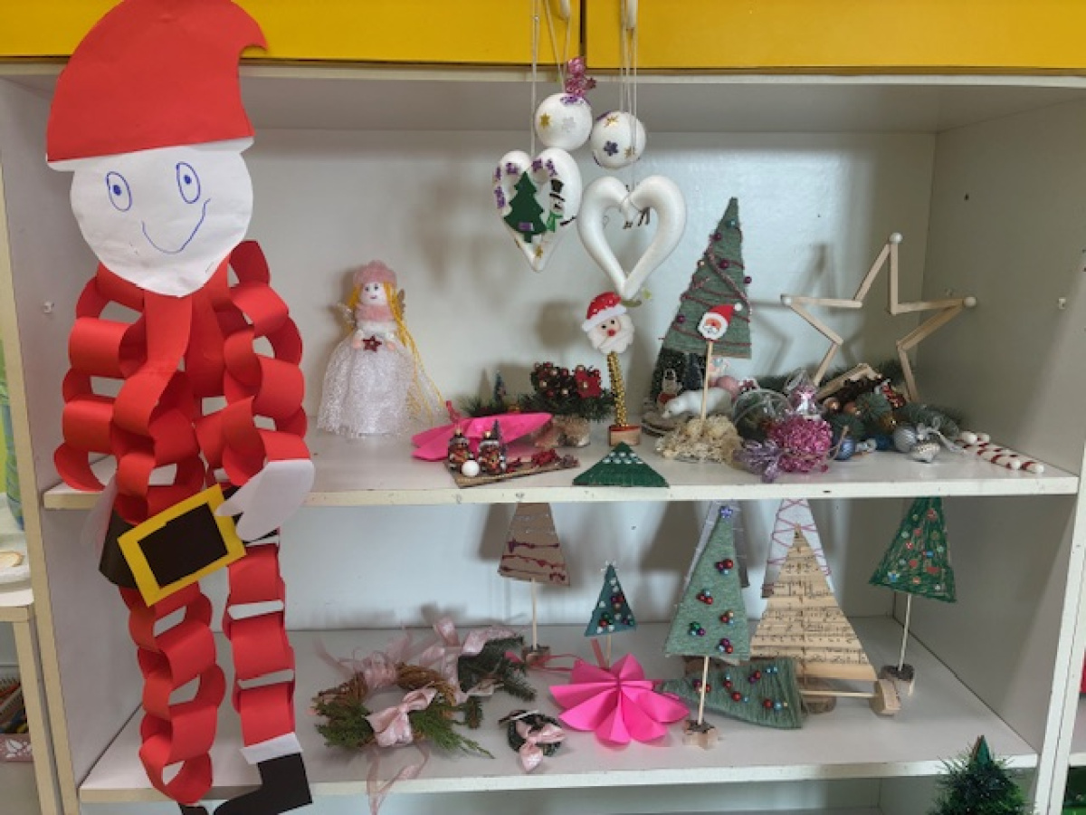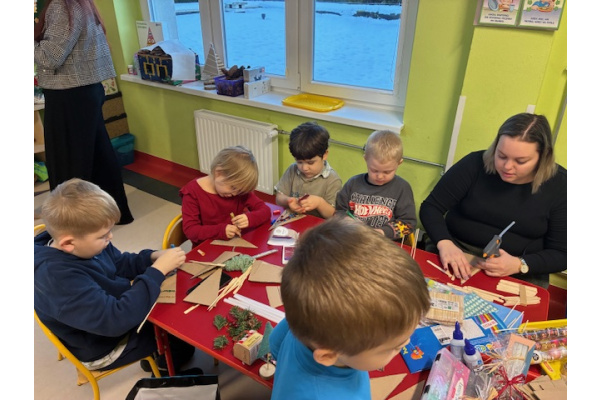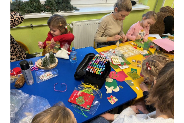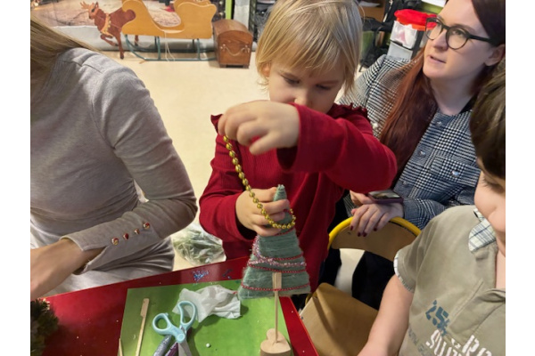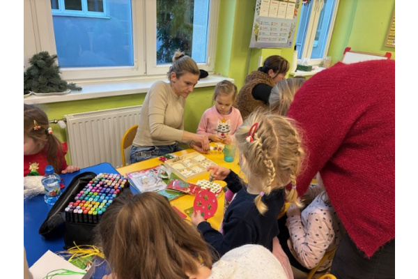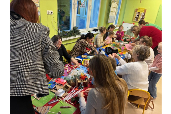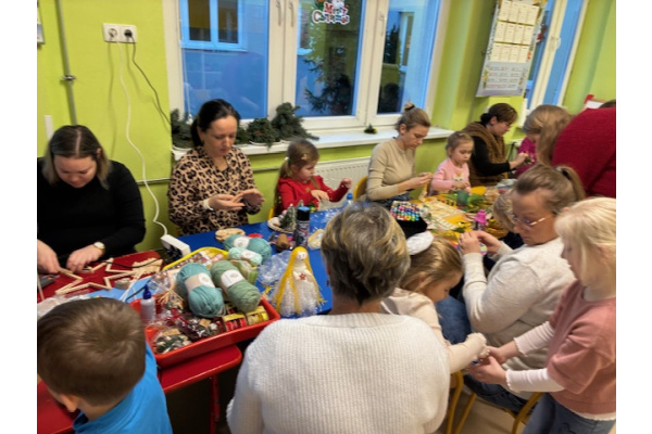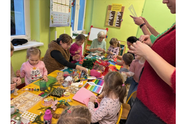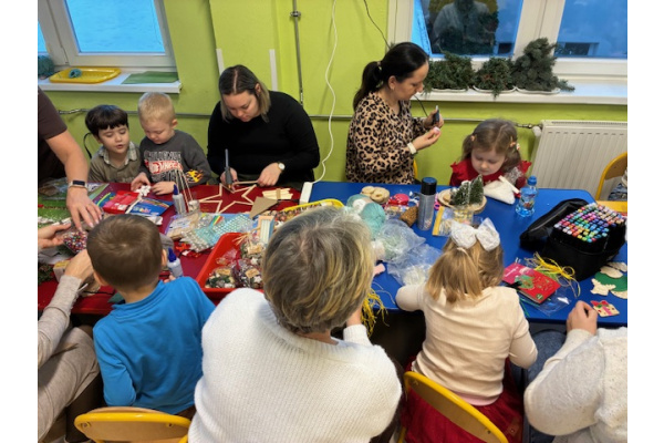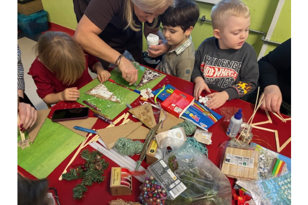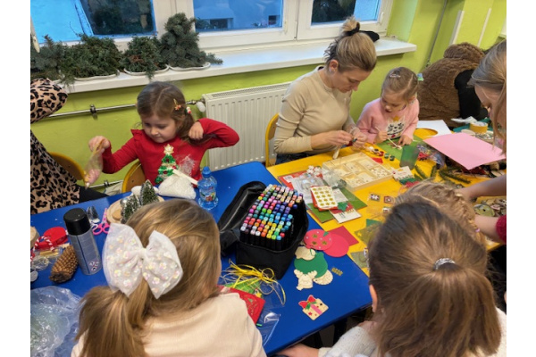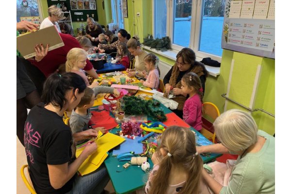 W ostatni czwartek listopada spotkaliśmy się z rodzicami w naszej sali, aby przygotować dekoracje świąteczne na kiermasz przedszkolny. Wszyscy razem zasiedliśmy do pracy ,a po godzinie były już piękne stroiki, bombki, aniołki, gwiazdki i choinki. Naszemu spotkaniu towarzyszyła rodzinna atmosfera. Było miło i magicznie.