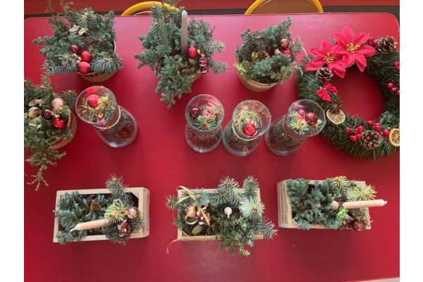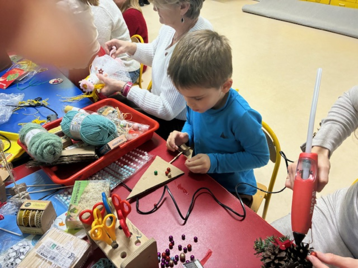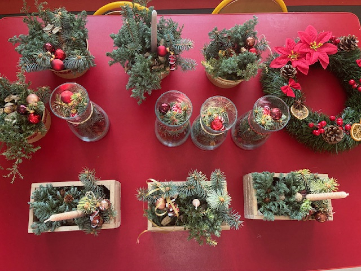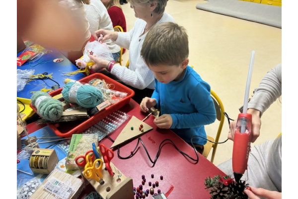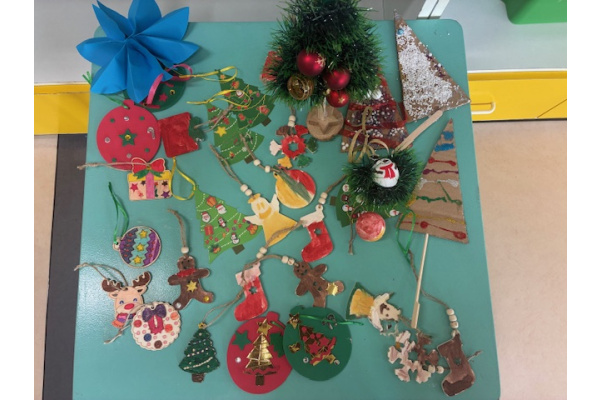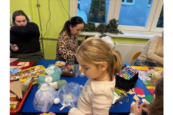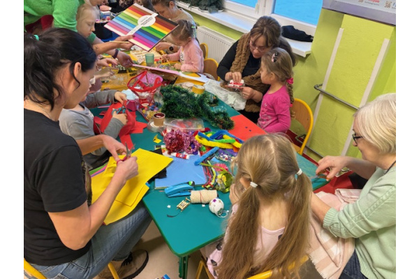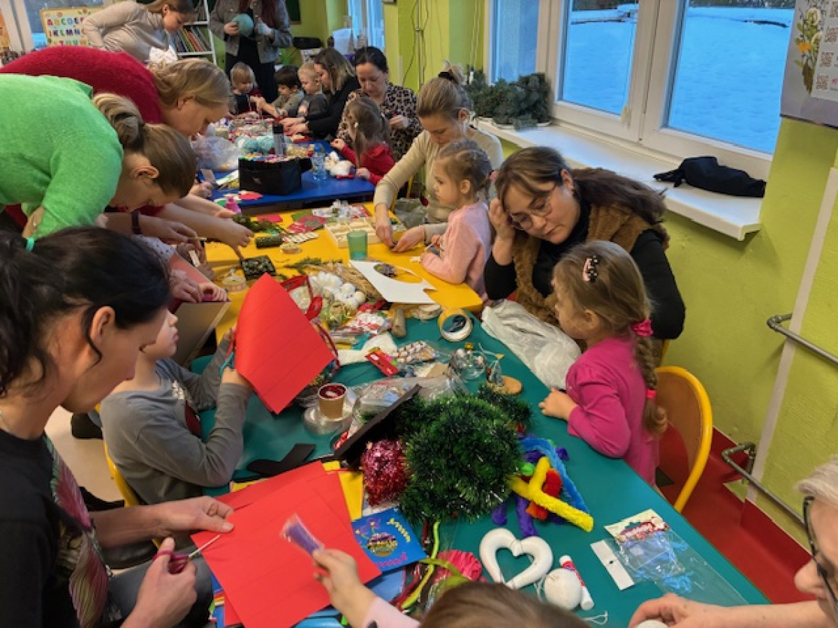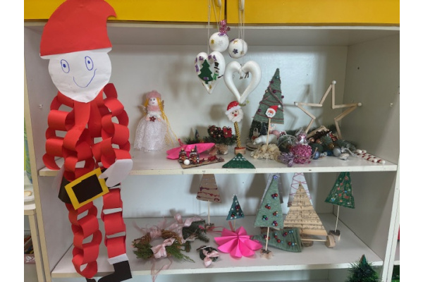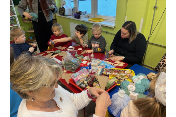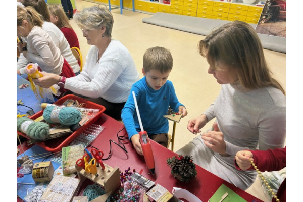 W ostatni czwartek listopada spotkaliśmy się z rodzicami w naszej sali, aby przygotować dekoracje świąteczne na kiermasz przedszkolny. Wszyscy razem zasiedliśmy do pracy ,a po godzinie były już piękne stroiki, bombki, aniołki, gwiazdki i choinki. Naszemu spotkaniu towarzyszyła rodzinna atmosfera. Było miło i magicznie.