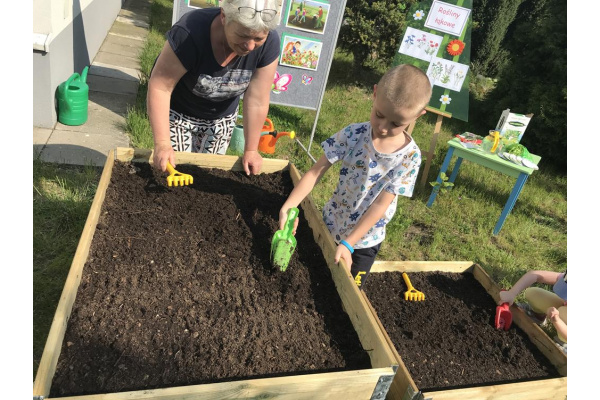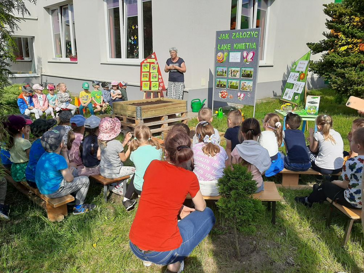 W piątek 14. maja, w ramach realizacji BGE „Kwietne łąki zakładamy, bo o owady dbamy” odwiedził nas Gość specjalny - ogrodnik. Pani Magda, która przyjechała do nas z Zespołu Szkół Centrum Kształcenia Rolniczego przeprowadziła dla dzieci warsztaty pod tytułem „Jak założyć łąkę kwietną?”. Podczas zajęć przedszkolaki poznały podstawowe zasady zakładania takiej łąki oraz jej pielęgnacji. W czasie warsztatów z naszym ekspertem-ogrodnikiem, dzieci dowiedziały się jak ważne są łąki kwietne dla owadów zapylających, pełniąc dla nich rolę bazy pokarmowej, ale także schronienia. Dzieci nie tylko wysłuchały istotnych informacji, ale również miały okazję działać. Nasze dzielne przedszkolaki przekopywały i grabiły ziemię, wysiewały specjalną mieszankę nasion, a na końcu podlewały wysianą „łąkę”. Każdy mały „specjalista” od wysiewania łąki otrzymał na koniec medal małego ogrodnika. Dla nas wszystkich było to ogromnie ciekawe i pouczające spotkanie, za które jeszcze raz serdecznie dziękujemy!