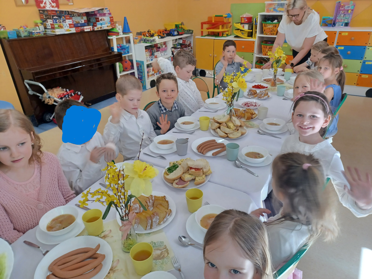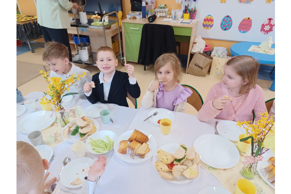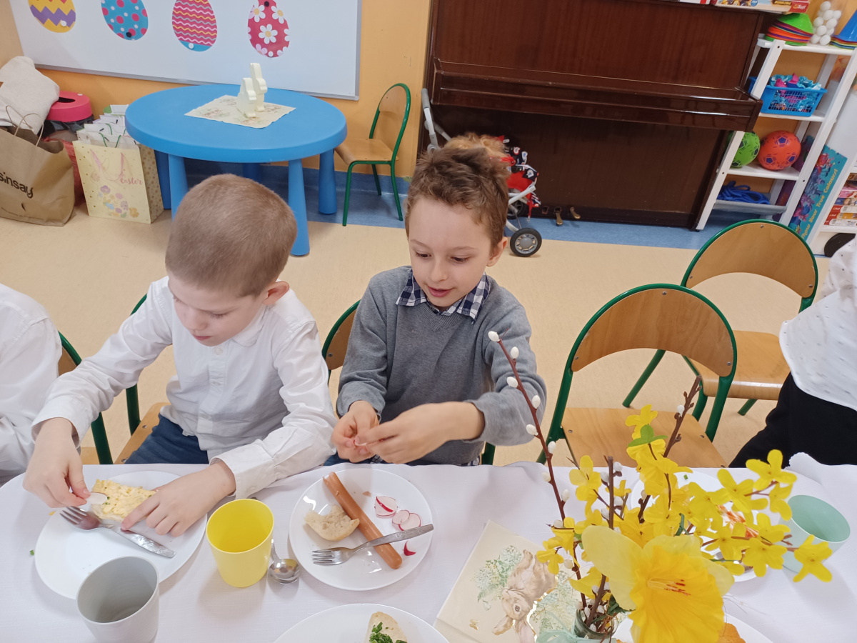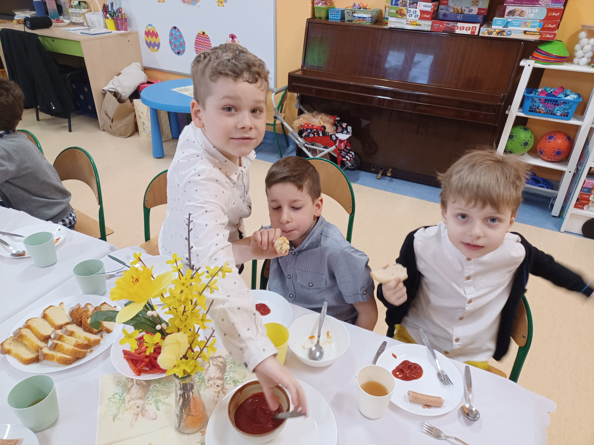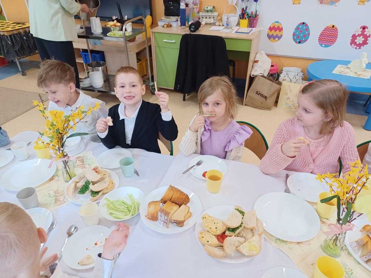 31. marca w naszym przedszkolu odbyło się uroczyste Śniadanie Wielkanocne. Elegancko ubrani zasiedliśmy do udekorowanego stołu, podzieliliśmy się jajkiem, złożyliśmy życzenia i zaczęliśmy ucztę. Po śniadaniu wyruszyliśmy w poszukiwaniu zajączka, który zostawił dla dzieci prezenty w ogrodzie. Dzień był pełen atrakcji i pozytywnych emocji.