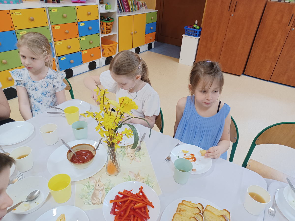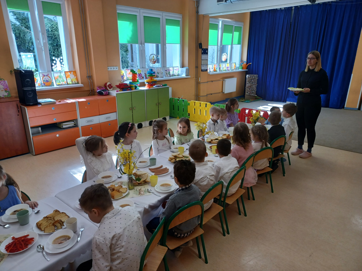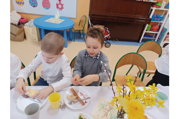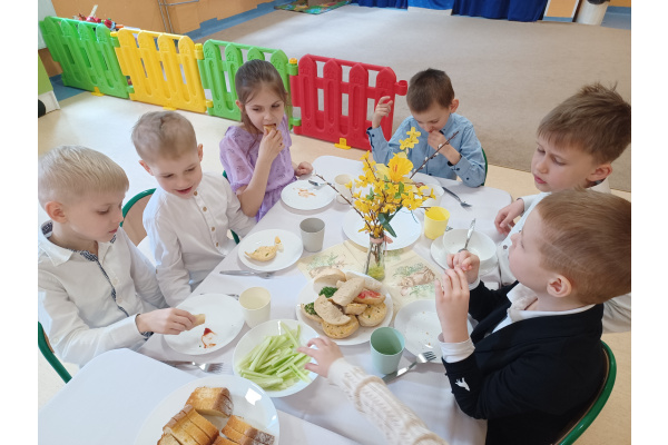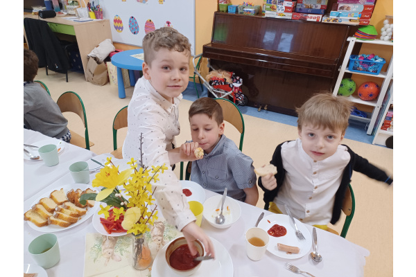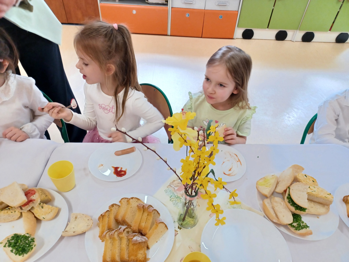 31. marca w naszym przedszkolu odbyło się uroczyste Śniadanie Wielkanocne. Elegancko ubrani zasiedliśmy do udekorowanego stołu, podzieliliśmy się jajkiem, złożyliśmy życzenia i zaczęliśmy ucztę. Po śniadaniu wyruszyliśmy w poszukiwaniu zajączka, który zostawił dla dzieci prezenty w ogrodzie. Dzień był pełen atrakcji i pozytywnych emocji.
