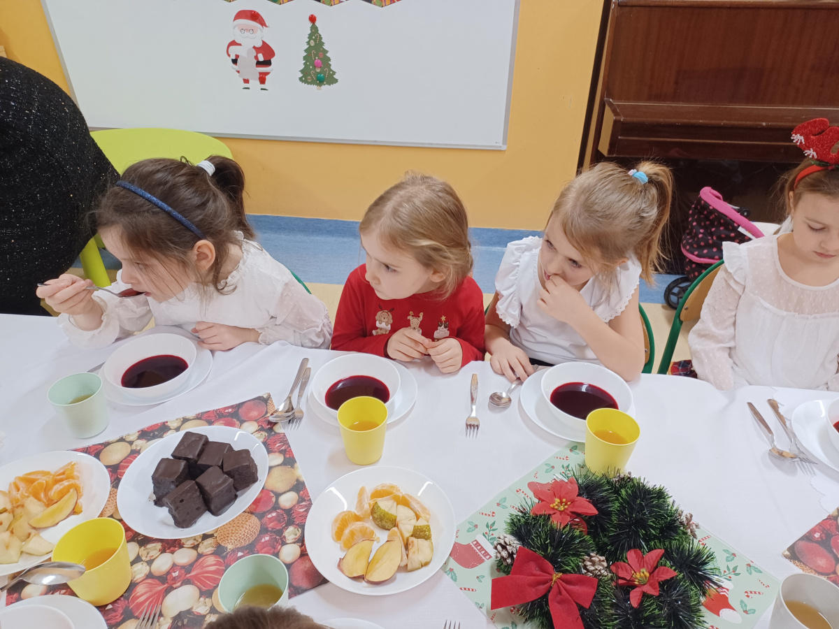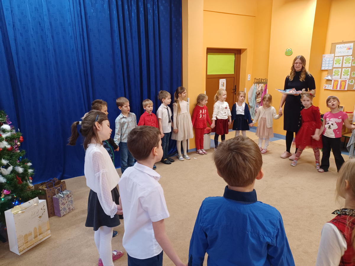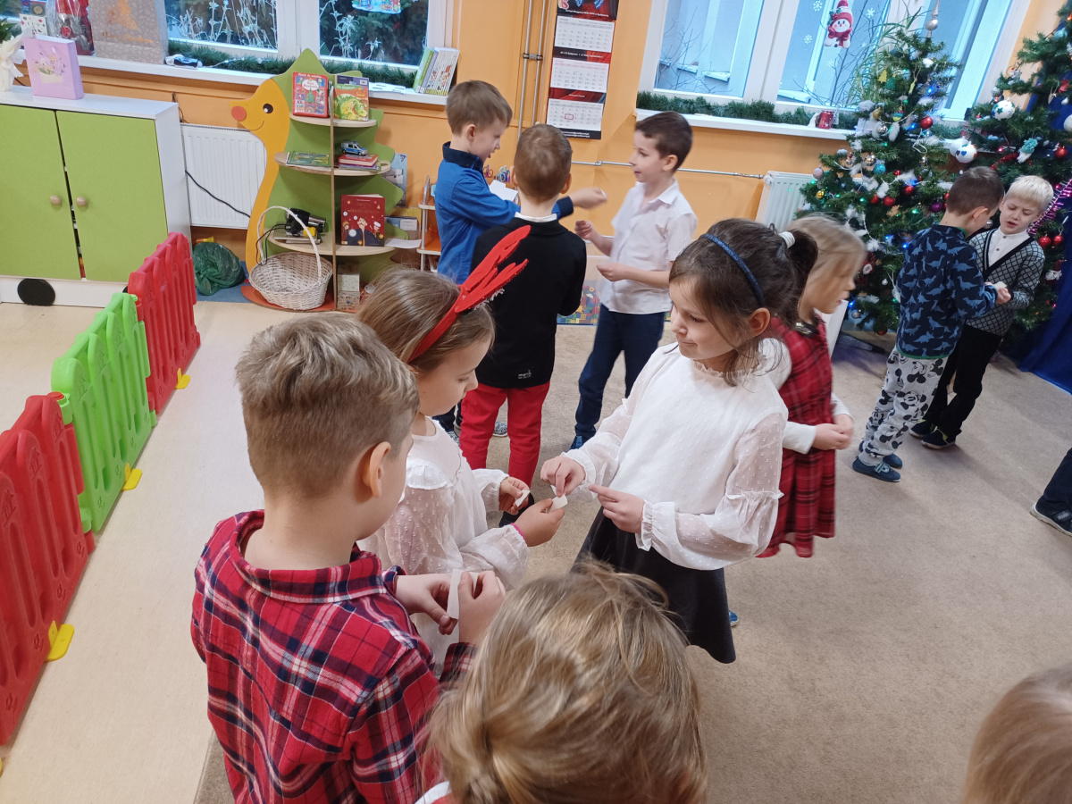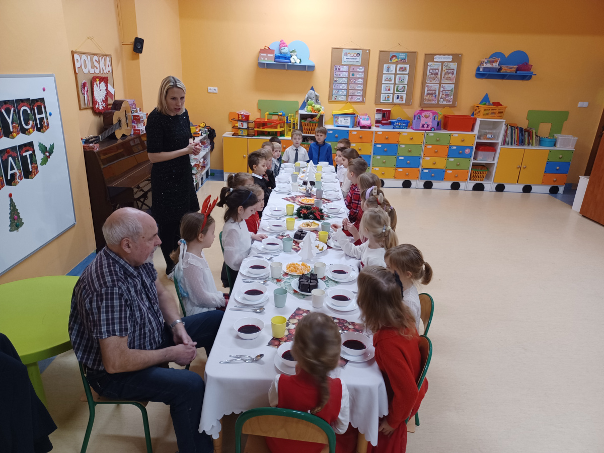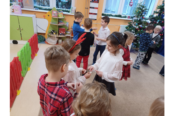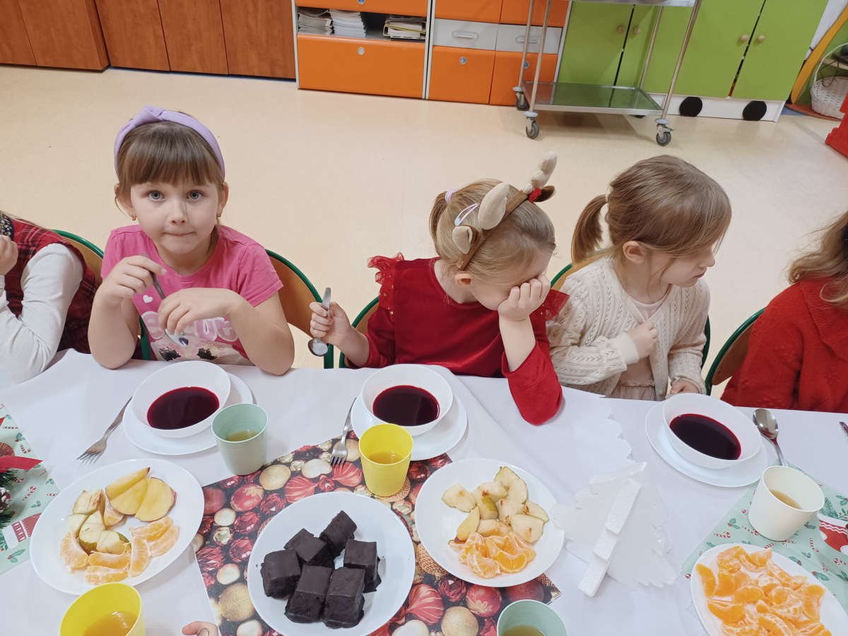 17. grudnia obchodziliśmy przedszkolną Wigilię. Dzieci z grupy "Świetliki" przedstawiły przepiękne Jasełka. Po występie wróciliśmy do sali, gdzie podzieliśmy się opłatkiem, złożyliśmy sobie życzenia, wspólnie śpiewaliśmy kolędy. Później zasiedliśmy do wspólnego stołu, by zjeść uroczysty obiad. Nie zabrakło również prezentów pod choinką. Czas upłynął nam w miłej, świątecznej atmosferze.