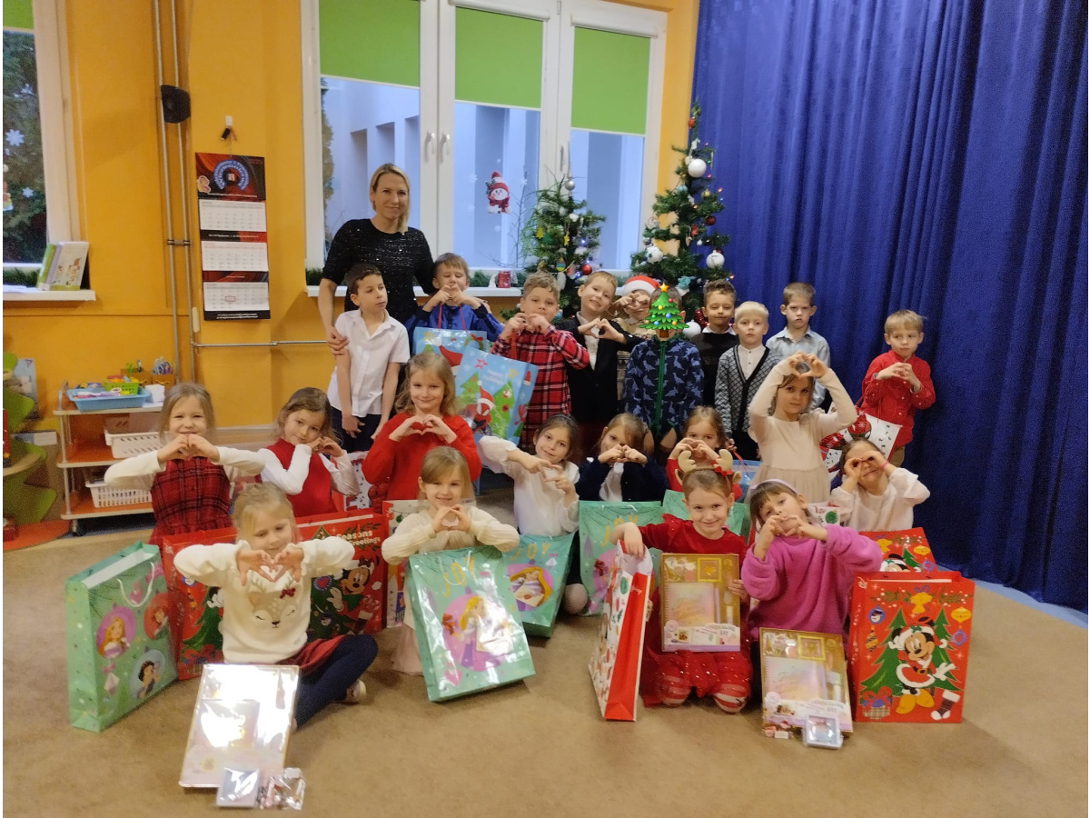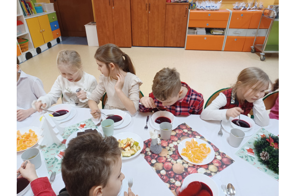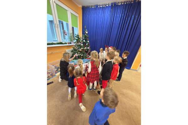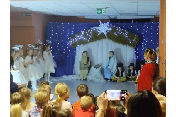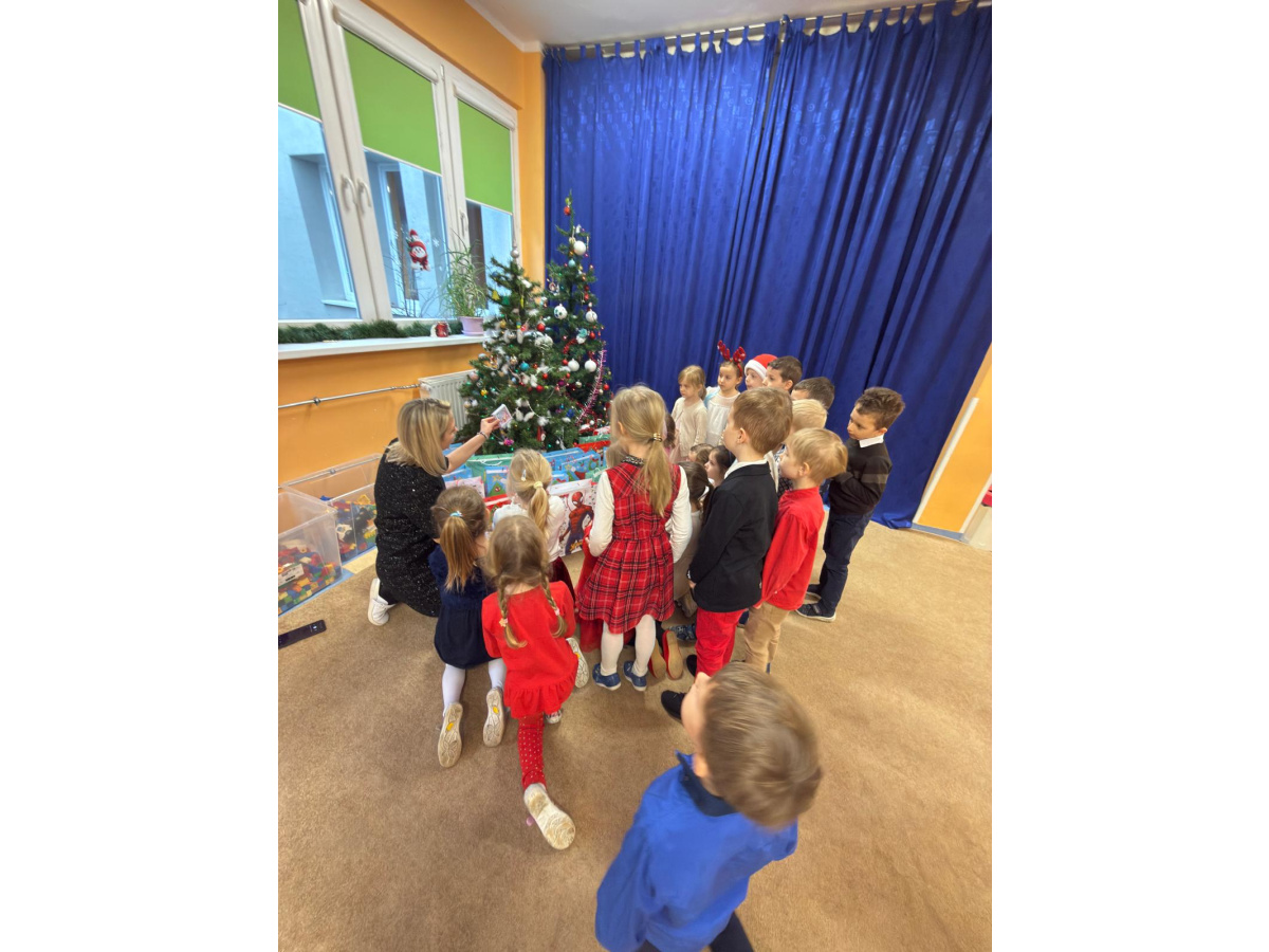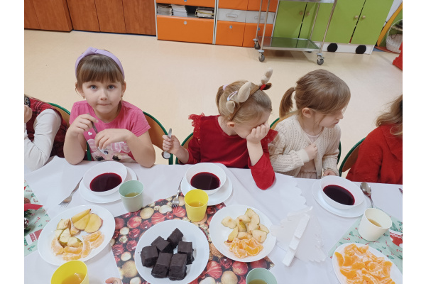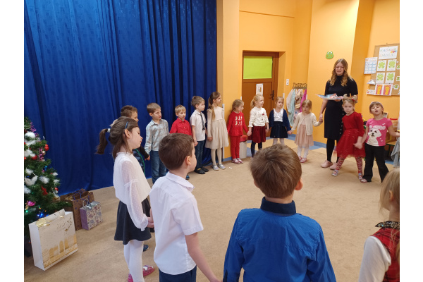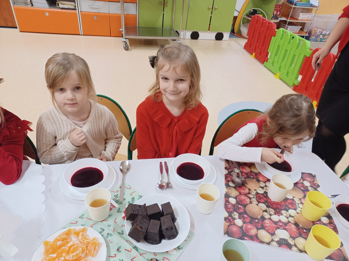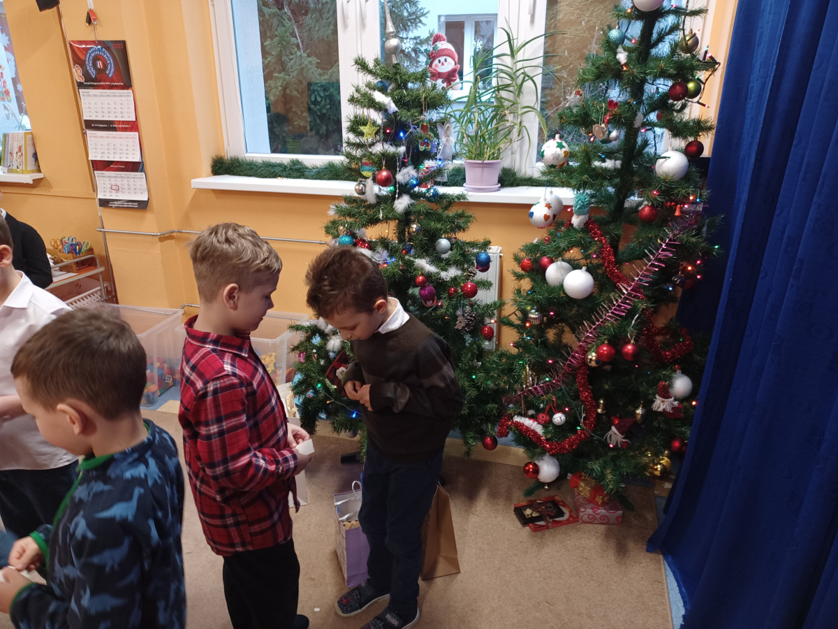 17. grudnia obchodziliśmy przedszkolną Wigilię. Dzieci z grupy "Świetliki" przedstawiły przepiękne Jasełka. Po występie wróciliśmy do sali, gdzie podzieliśmy się opłatkiem, złożyliśmy sobie życzenia, wspólnie śpiewaliśmy kolędy. Później zasiedliśmy do wspólnego stołu, by zjeść uroczysty obiad. Nie zabrakło również prezentów pod choinką. Czas upłynął nam w miłej, świątecznej atmosferze.