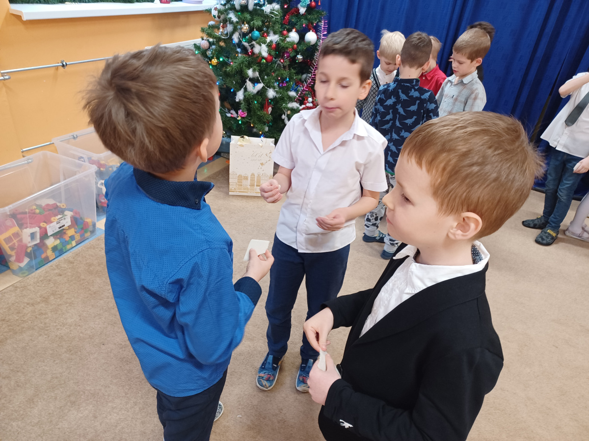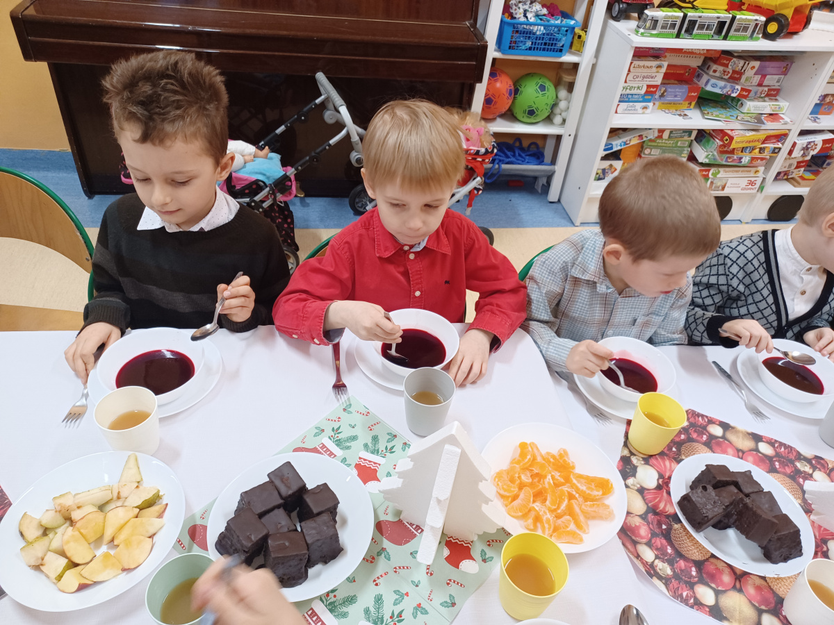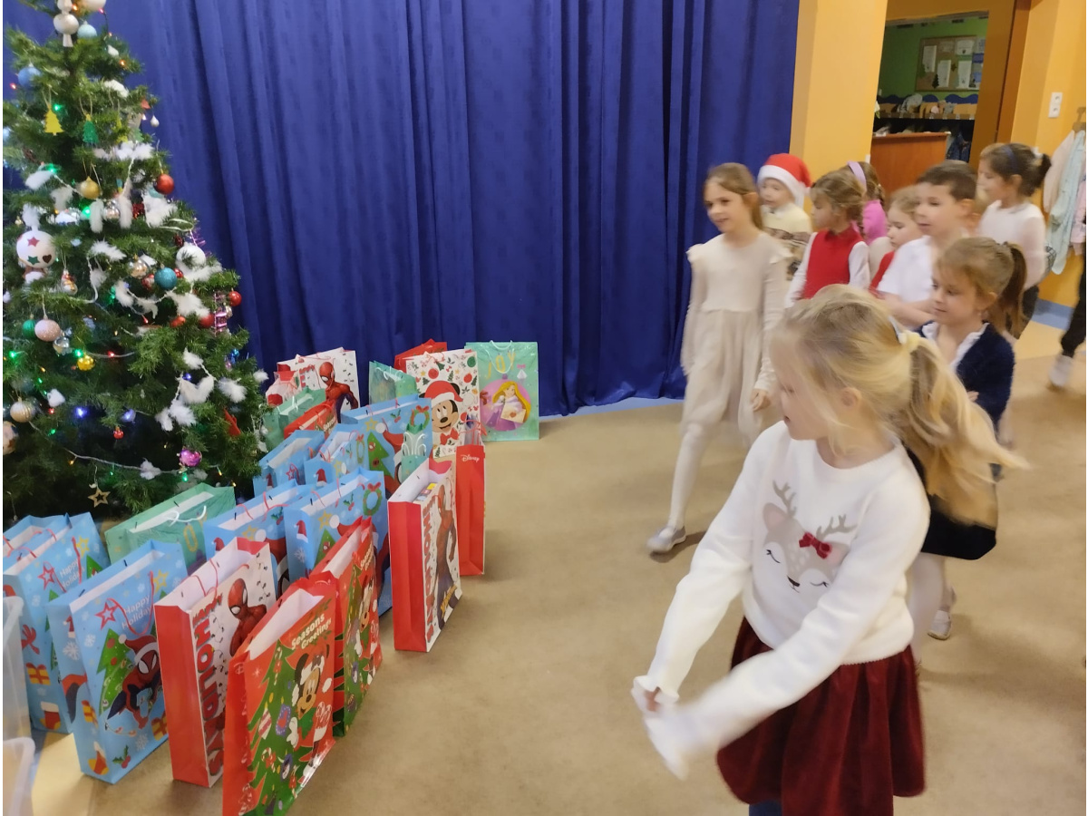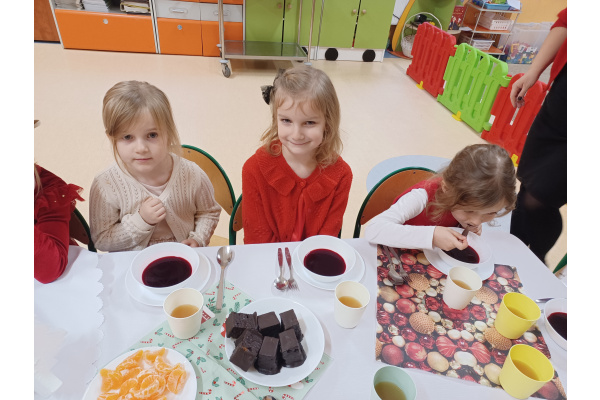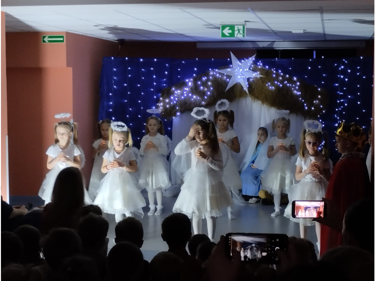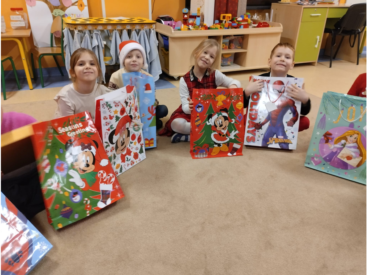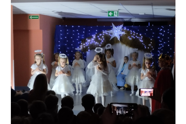 17. grudnia obchodziliśmy przedszkolną Wigilię. Dzieci z grupy "Świetliki" przedstawiły przepiękne Jasełka. Po występie wróciliśmy do sali, gdzie podzieliśmy się opłatkiem, złożyliśmy sobie życzenia, wspólnie śpiewaliśmy kolędy. Później zasiedliśmy do wspólnego stołu, by zjeść uroczysty obiad. Nie zabrakło również prezentów pod choinką. Czas upłynął nam w miłej, świątecznej atmosferze.