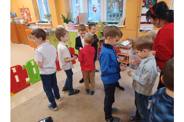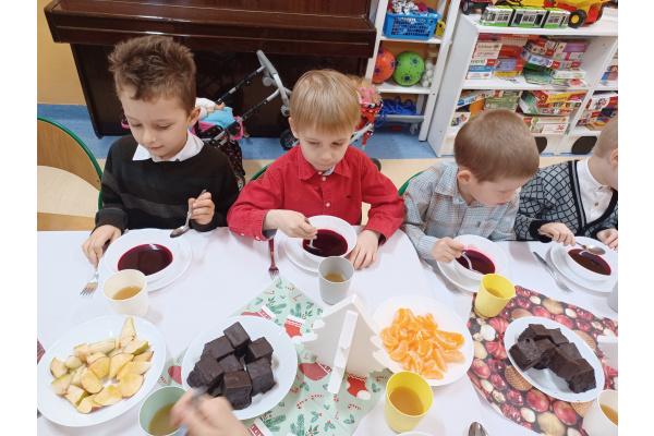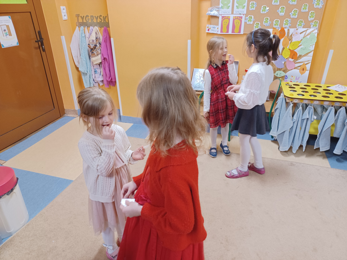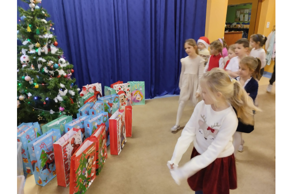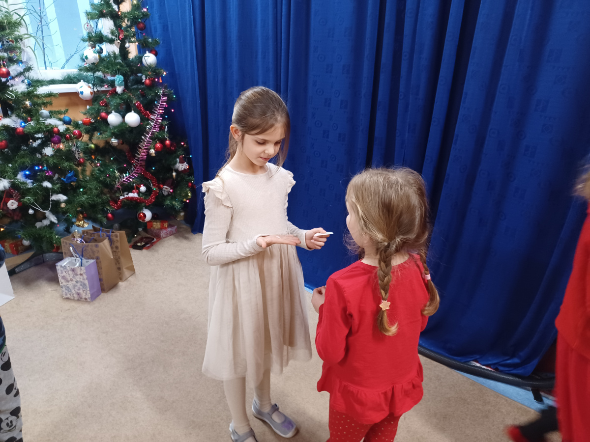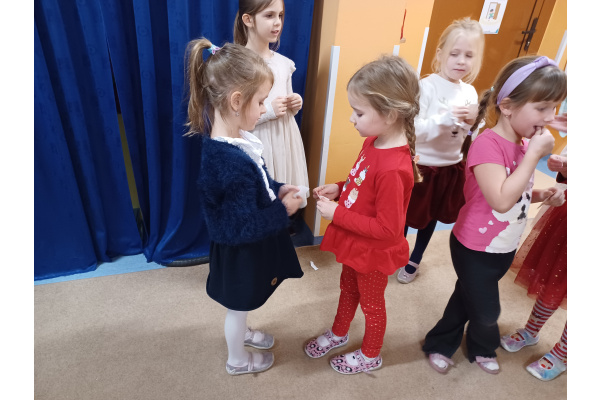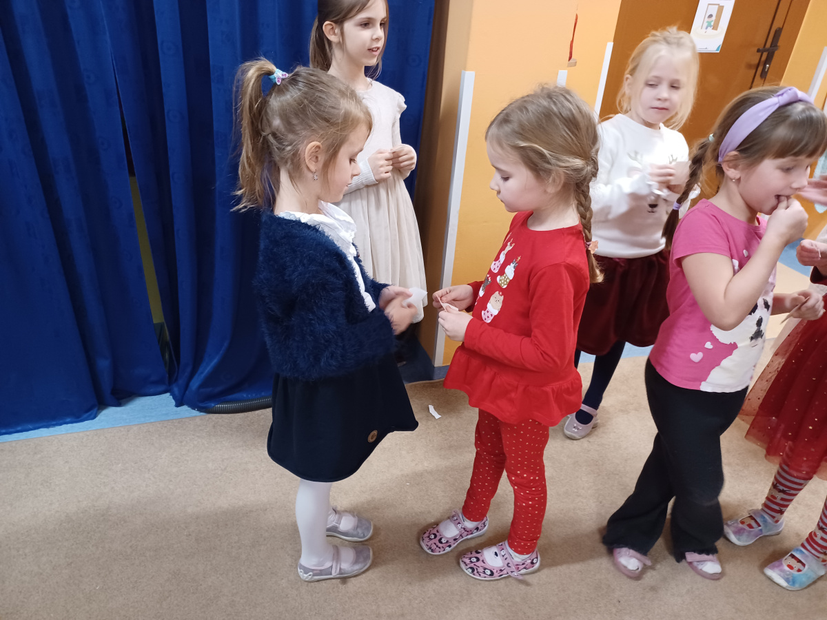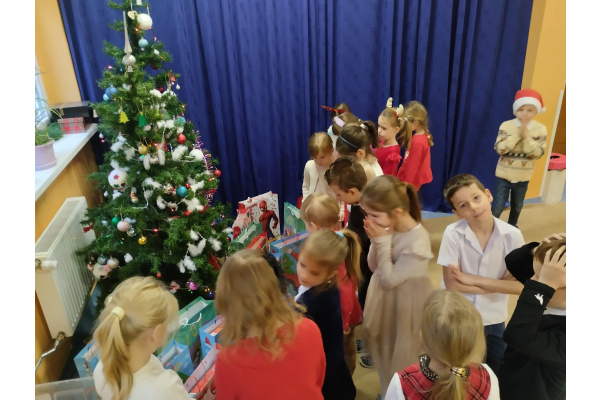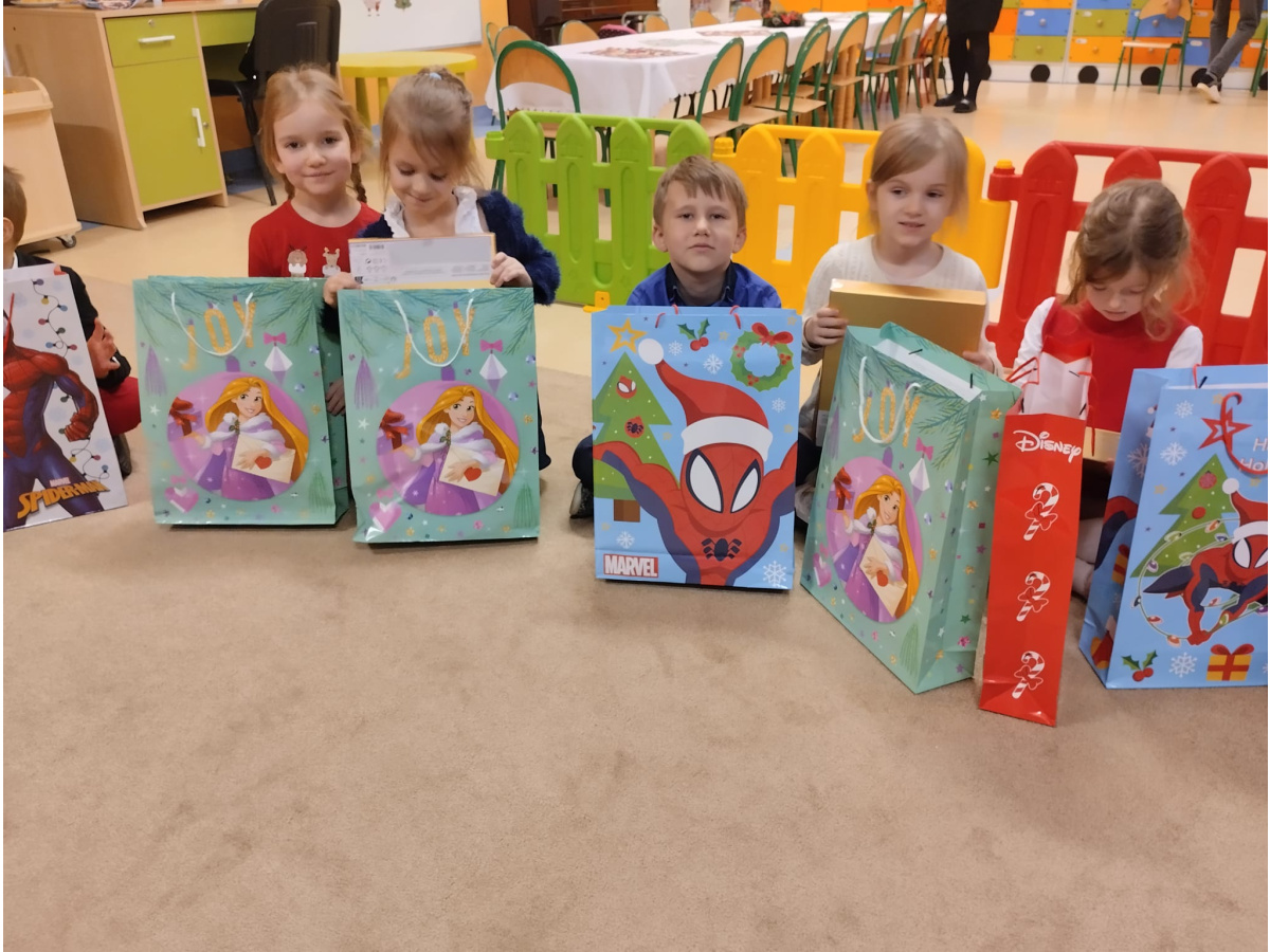 17. grudnia obchodziliśmy przedszkolną Wigilię. Dzieci z grupy "Świetliki" przedstawiły przepiękne Jasełka. Po występie wróciliśmy do sali, gdzie podzieliśmy się opłatkiem, złożyliśmy sobie życzenia, wspólnie śpiewaliśmy kolędy. Później zasiedliśmy do wspólnego stołu, by zjeść uroczysty obiad. Nie zabrakło również prezentów pod choinką. Czas upłynął nam w miłej, świątecznej atmosferze.