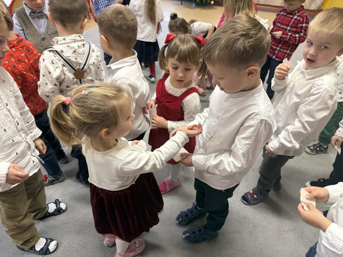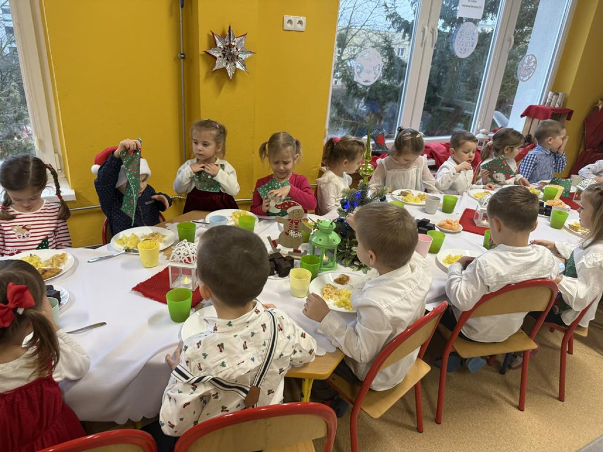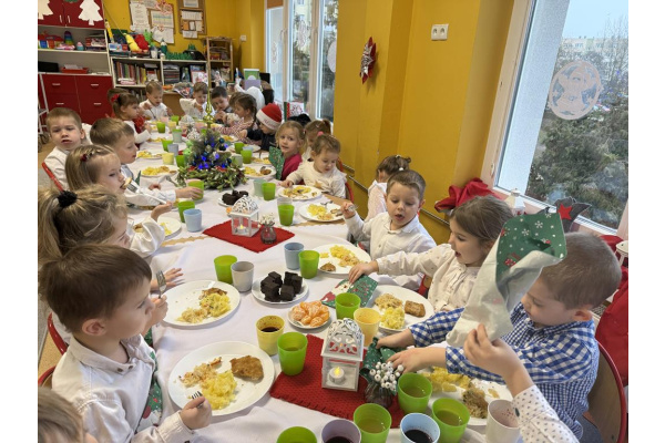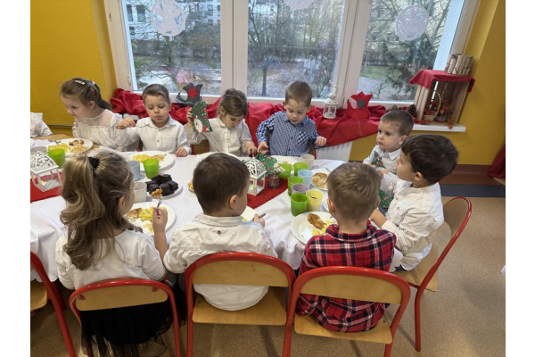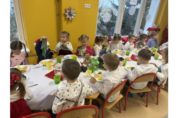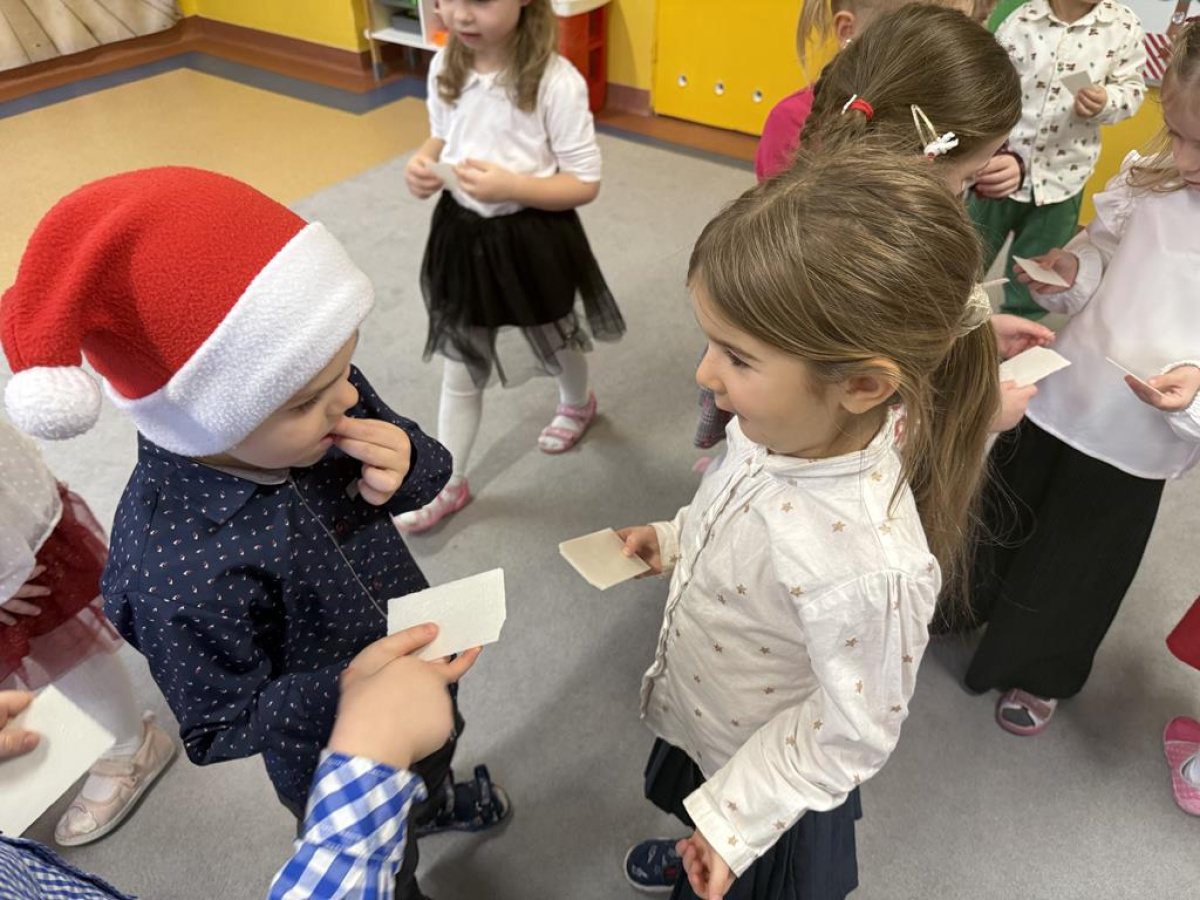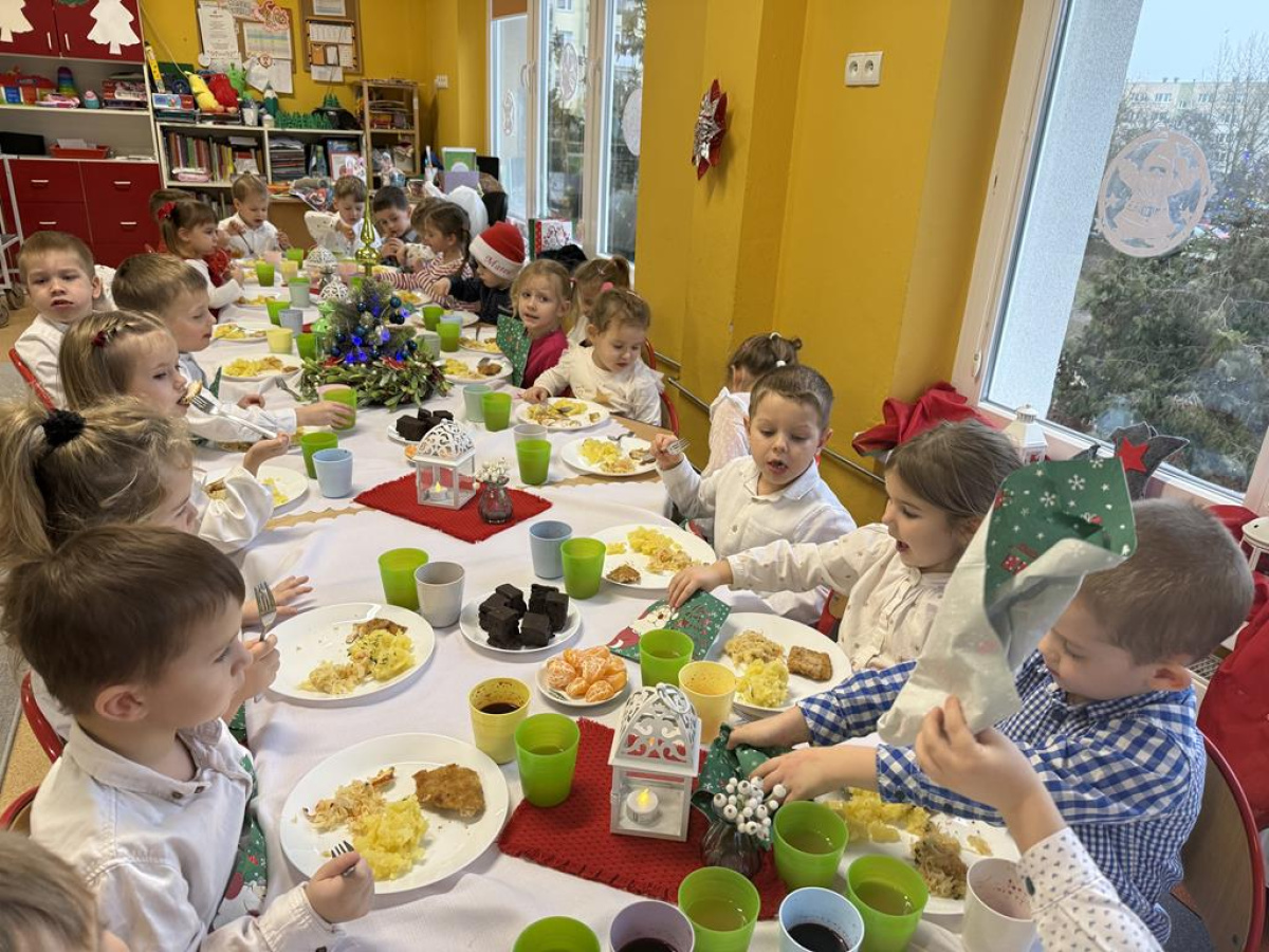 17 stycznia w przedszkolu odbyła się Wigilia przedszkolna. Tygryski ubrane odświętnie obejrzały piękne Jasełka w wykonaniu dzieci z grupy Świetliki. Kiedy wróciliśmy do sali okazało się, że Gwiazdor już w niej był i zostawił pod choinką prezenty dla dzieci. Przyszedł też czas na wspólne śpiewanie kolęd oraz przypomnienie sobie kolejnej tradycji - dzielenia się opłatkiem i składania życzeń na Święta. Po złożeniu sobie życzeń dzieci zasiadły do uroczystego obiadu wigilijnego. To był wyjątkowy dzień pełen radości i prawdziwie świątecznej atmosfery.