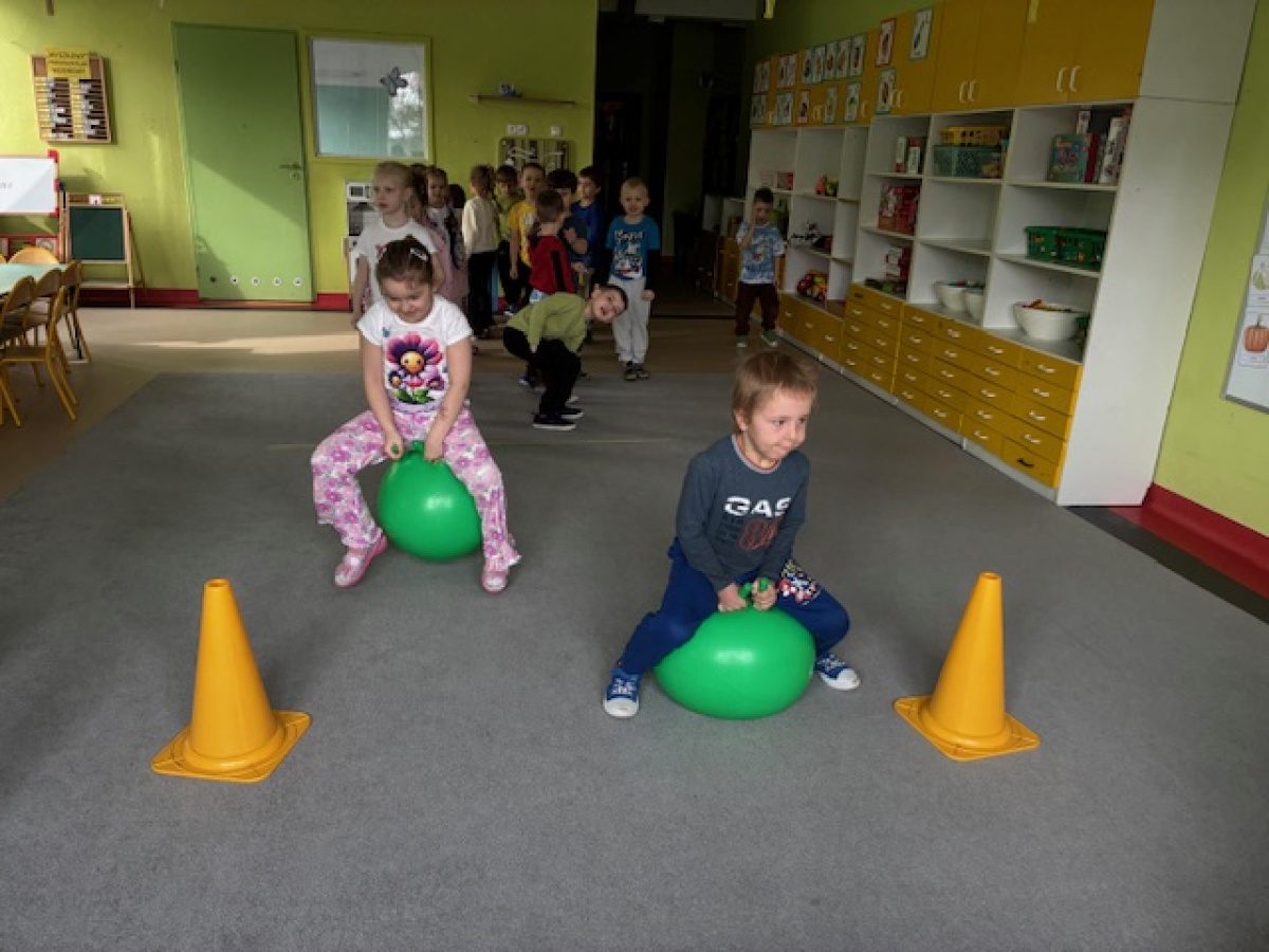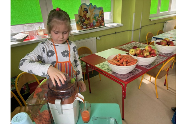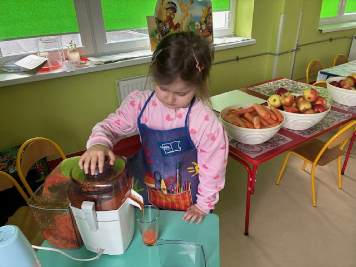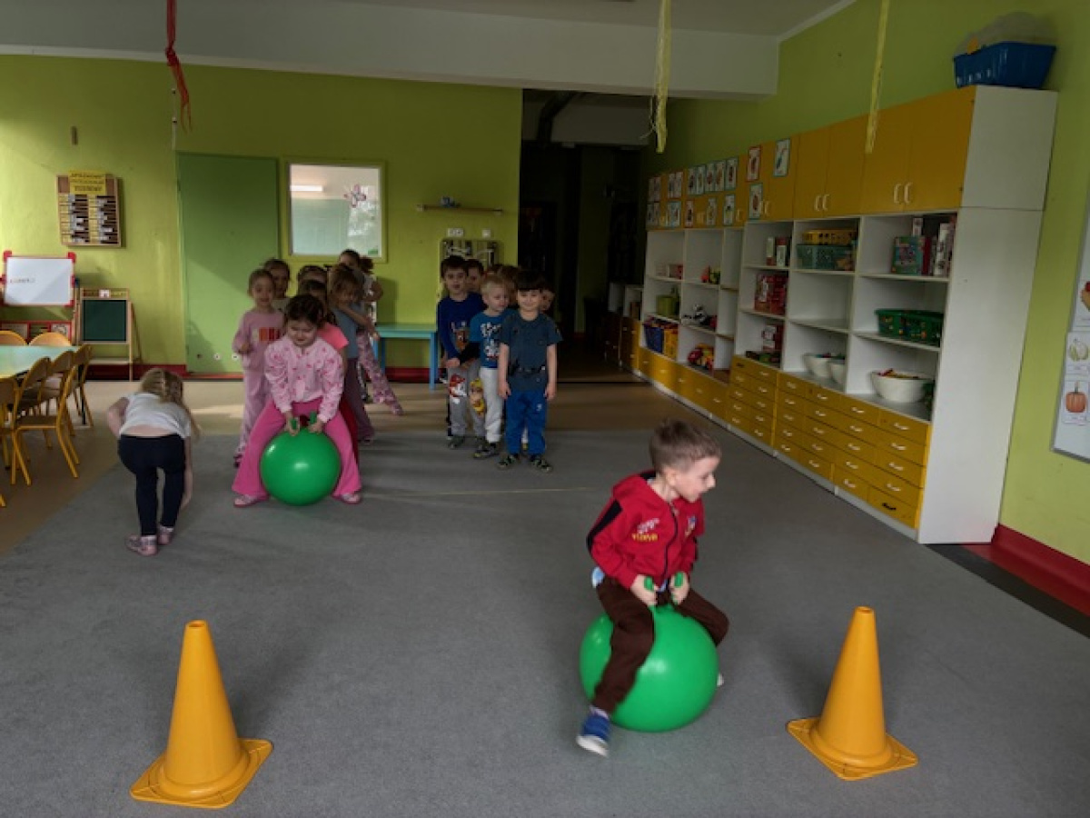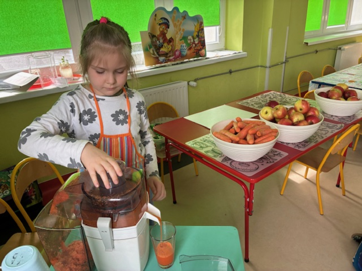 Wiosną dzieci z grupy „Myszek”rozmawiały o zdrowym odżywianiu i znaczeniu codziennej aktywności ruchowej. Przedszkolaki z radością uczestniczyły w różnych zabawach i ćwiczeniach ruchowych – skakały na piłce, bawiły się z gumą sensoryczną oraz porównywały produkty zdrowe i niezdrowe.Na zakończenie zajęć dzieci samodzielnie przygotowały pyszny sok marchwiowo-jabłkowy, poznając przy tym wartości zdrowych warzyw i owoców. Był to czas pełen ruchu, radości i zdrowych inspiracji!