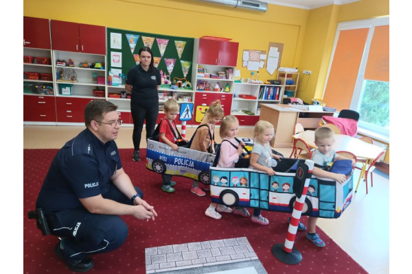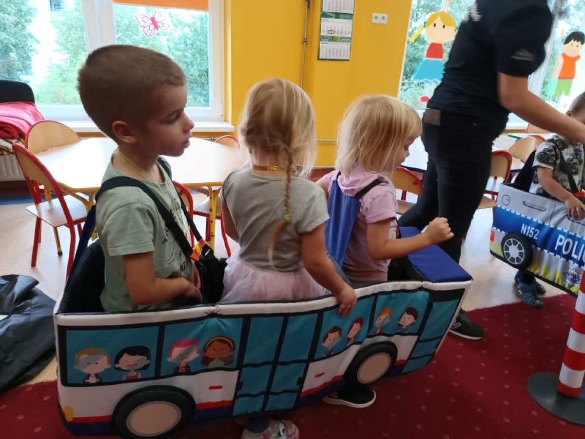 Policjanci z Komendy Miejskiej Policji w Bydgoszczy odwiedzili 20 września nasze Świetliki. Opowiedzieli dzieciom jak bezpiecznie poruszać się po drodze i zapoznali ze sygnalizacją świetlną. Przedszkolaki mogły się "wczuć" w rolę pieszych przechodzących przez pasy, ale też kierowców autobusu i radiowozu. Dzieci wykazały się doskonałą wiedzą i bezbłędnie odpowiadały na zadawane przez policjantów pytania. Nie zabrakło także wspólnych zdjęć z policjantami.