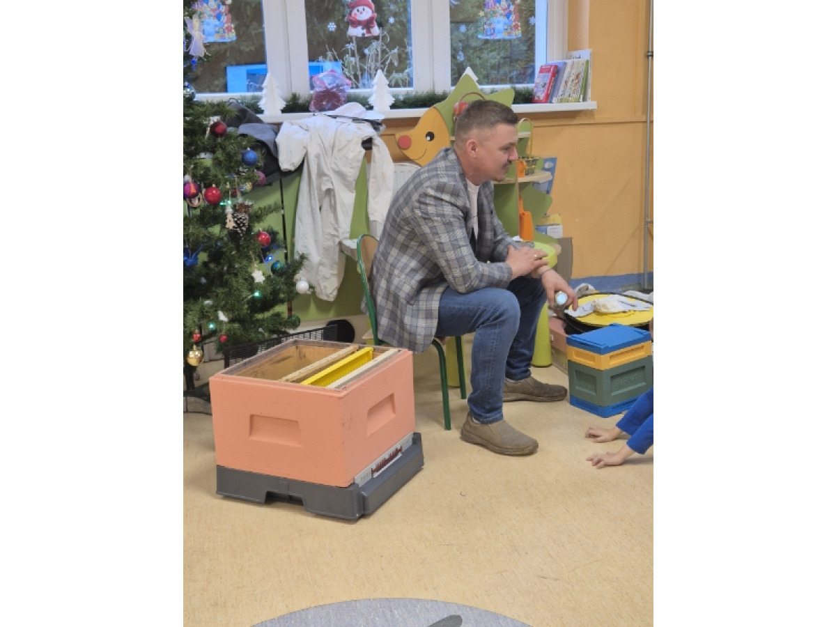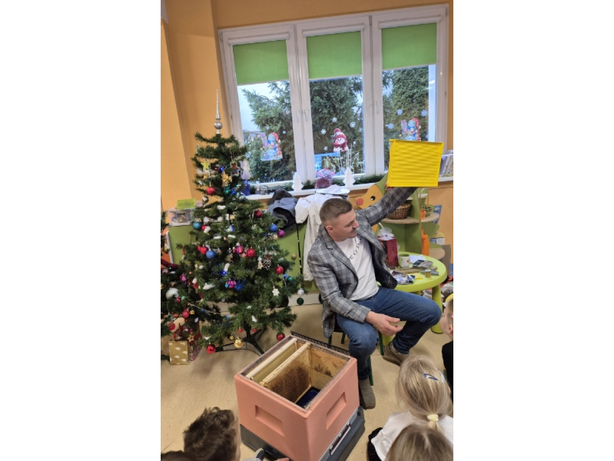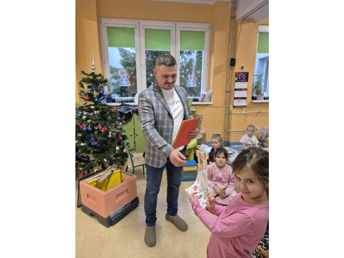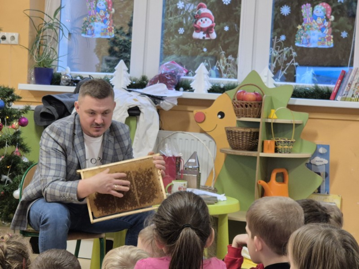 W czwartek 4 grudnia nasze przedszkole odwiedził wyjątkowy gość – pszczelarz z pasji i zamiłowania. Podczas spotkania dzieci miały okazję zobaczyć z bliska strój ochronny, narzędzia używane w pasiece oraz specjalną ramkę z woskiem pszczelim. Przedszkolaki dowiedziały się, jak wygląda życie pszczół, w jaki sposób powstaje miód i dlaczego te małe owady są tak ważne dla przyrody.